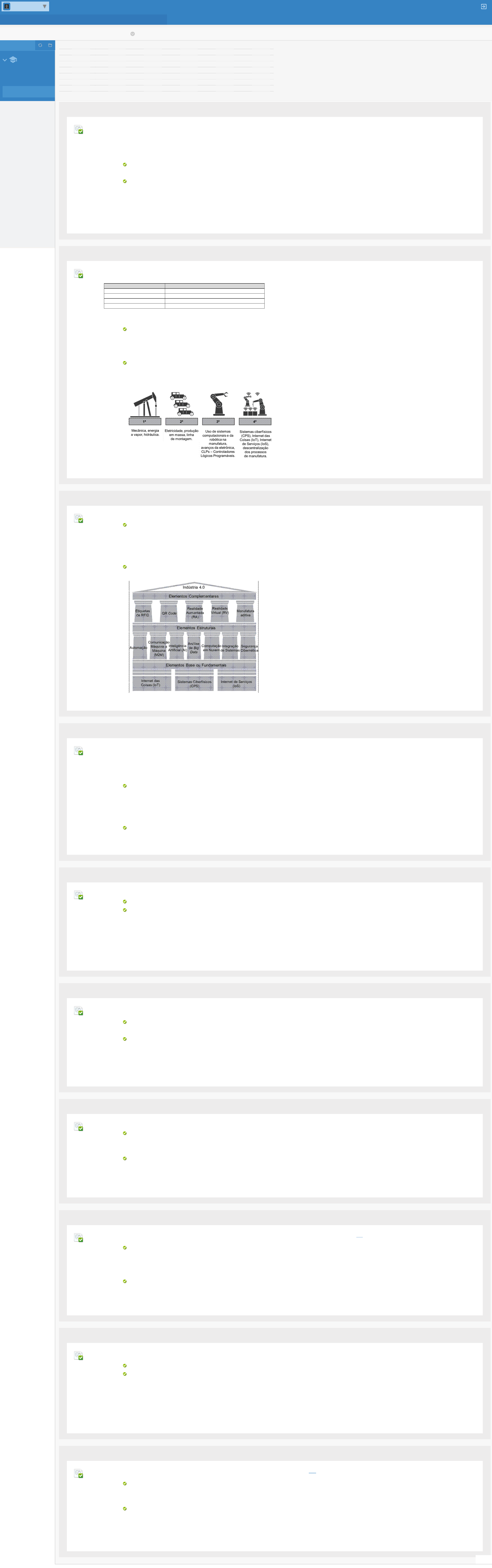 Revisar envio do teste: QUESTIONÁRIO UNIDADE IPRINCÍPIOS DE SISTEMAS DE INFORMAÇÃO 3063-60_57501_R_E1_20241_01 CONTEÚDO PRINCÍPIOS DE SISTEMAS DE INFORMAÇÃO (3063- 60_57501_R_E1_20 241_01) CONTEÚDO Segunda-feira, 3 de Junho de 2024 20h01min40s GMT-03:00 Usuário WENDELL HENDRIX RIBEIRO Curso PRINCÍPIOS DE SISTEMAS DE INFORMAÇÃO Teste QUESTIONÁRIO UNIDADE I Iniciado 03/06/24 19:54 Enviado 03/06/24 20:01 Status Completada Resultado da tentativa 2,5 em 2,5 pontos Tempo decorrido 7 minutos Resultados exibidos Todas as respostas, Respostas enviadas, Respostas corretas, Comentários, Perguntas respondidas incorretamente Pergunta 1 Resposta Selecionada: b. Respostas: a. b. c. d. e. Comentário da resposta: Analise as proposições a seguir sobre os conceitos e a evolução da tecnologia: I. TI e tecnologia representam a mesma coisa, e podemos a�rmar, com certeza que toda tecnologia é ligada ao ambiente computacional; II. A era da tecnologia, em que vivemos, é resultante do conjunto de inovações e descobertas que a ciência já produziu ou vem produzindo; III. A tecnologia tem sido desenvolvida ao longo da história e impulsionada por guerras e, também, por questões econômicas. É correto o que se a�rma em: II e III, apenas. I e II, apenas. II e III, apenas. I e III, apenas. I, apenas. II, apenas. Resposta: B Comentário: nem sempre, a TI e a tecnologia representam a mesma coisa. Algo pode ser considerado tecnologia e não ter qualquer relação com o aparato computacional e de informática, que observamos ao nosso redor nos dias de hoje. Um bom exemplo é a caneta esferográ�ca, que nada tem a ver com os computadores ou a informática, e é uma tecnologia. Pergunta 2 Resposta Selecionada: d. Respostas: a. b. c. d. e. Comentário da resposta: As Revoluções Industriais tiveram grande importância na evolução da tecnologia. Sacomano et al. (2018) menciona, pelo menos, quatro Revoluções Industriais vivenciadas. Observe o quadro a seguir que apresenta, na coluna A, as Revoluções Industriais e, na coluna B, algo de destaque desta revolução: A B I. 1ª Revolução Industrial 1. Utilização da eletricidade para fins manufatureiros. II. 2ª Revolução Industrial 2. Chegada da produção enxuta. III. 3ª Revolução Industrial 3. Uso da tecnologia da Internet das Coisas. IV. 4ª Revolução Industrial 4. Surgimento da máquina a vapor. Assinale a alternativa que faz a associação correta entre as colunas: I-4, II-1, III-2, IV-3. I-1, II-2, III-3, IV-4. I-2, II-4, III-1, IV-3. I-3, II-1, III-4, IV-2. I-4, II-1, III-2, IV-3. I-2, II-4, III-3, IV-1 Resposta: D Comentário: a �gura a seguir nos ajuda a compreender estas Revoluções Industriais: Fonte: Sacomano et al. (2018, p. 28). Pergunta 3 Resposta Selecionada: e. Respostas: a. b. c. d. e. Comentário da resposta: A Quarta Revolução Industrial apresenta a ideia de Indústria 4.0 e ocorre neste século em que estamos. Ela é formada por elementos base, estruturantes e complementares. Qual das alternativas a seguir apresenta um elemento base? Internet dos Serviços. QR Code. Inteligência arti�cial. Computação em nuvem. Realidade virtual. Internet dos Serviços. Resposta: E Comentário: a �gura a seguir nos ajuda a conhecer todos os elementos da Indústria 4.0: Fonte: Sacomano et al. (2018, p. 39). Pergunta 4 Resposta Selecionada: e. Respostas: a. b. c. d. e. Comentário da resposta: Analise as proposições a seguir sobre a evolução da computação: I. Os primeiros computadores foram criados a partir do uso dos transistores, graças à evolução da Engenharia Eletrônica; II. Ada Augusta Lovelace é considerada a primeira programadora do mundo e interpretou as concepções da máquina analítica de Babbage; III. O ENIAC é considerado o primeiro computador pessoal e foi criado, nos Estados Unidos, para a automação de processos empresariais. É correto o que se a�rma em: II, apenas. I e II, apenas. II e III, apenas. I e III, apenas. I, apenas. II, apenas. Resposta: E Comentário: os primeiros computadores foram criados utilizando os dispositivos eletromecânicos e as válvulas. Alguns anos depois, a Engenharia Eletrônica desenvolveu os transistores. O ENIAC não é considerado o primeiro computador pessoal. Os computadores pessoais surgem, quase 30 anos, depois do ENIAC. Pergunta 5 Resposta Selecionada: a. Respostas: a. b. c. d. e. Comentário da resposta: Quando lidamos com um conjunto de elementos não estruturados e que, por si só, nada revelam, estamos trabalhando com: Dados. Dados. Informação. Conhecimento. Sabedoria. Inteligência. Resposta: A Comentário: os dados consistem em fatos brutos, como o número de funcionários, as horas totais trabalhadas em uma semana, os números de peças no estoque ou os pedidos de vendas. Os dados formam a base para a criação de valor, mesmo que, por si só, eles nada revelem, porque é, deles, que extraímos a informação utilizada pelas pessoas. Pergunta 6 Resposta Selecionada: b. Respostas: a. b. c. d. e. Comentário da resposta: A informação é estratégica para qualquer tipo de negócio. Por isso, mais do que nunca, nos dias de hoje, é necessária a adoção de critérios de qualidade para a informação. Assim, considere que, em uma organização, grande importância é conferida ao uso mais produtivo possível da informação. Neste caso, qual é o critério e a qualidade que se revelam no desejo desta organização? E�ciência. Efetividade. E�ciência. Con�dencialidade. Integridade. Disponibilidade. Resposta: B Comentário: a e�ciência de�ne a entrega da informação com o uso mais produtivo possível dos recursos. Pergunta 7 Resposta Selecionada: c. Respostas: a. b. c. d. e. Comentário da resposta: Quando a TI passou a ser a parceira estratégica do negócio, grande importância foi atribuída aos modelos e aos frameworks de Governança de TI. Qual das alternativas a seguir apresenta um modelo de Governança de TI? COBIT®. BABOK