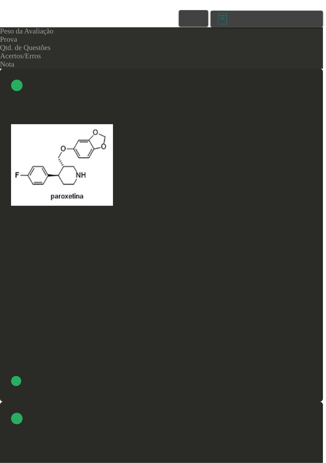 04/06/2024, 01:23 Avaliação II - Individual about:blank 1/6 Prova Impressa GABARITO | Avaliação II - Individual (Cod.:954401) Peso da Avaliação 2,00 Prova 83431399 Qtd. de Questões 10 Acertos/Erros 10/0 Nota 10,00 Os Inibidores Seletivos da Recaptação da Serotonina (IRSS) são uma classe de fármacos usados no tratamento de síndromes depressivas, transtornos de ansiedade e alguns tipos de transtorno de personalidade. A paroxetina é um análogo estrutural da fluoxetina, em que o grupo fenilpropilamina da fluoxetina, que é linear, foi modificado a um anel piperidina. Acerca da estrutura deste antidepressivo, classifique V para as sentenças verdadeiras e F para as falsas: ( ) A substituição na posição 2 (orto) de qualquer um dos anéis aromáticos diminui a afinidade para transportadores de serotonina em cerca de 10 a 100 vezes, com maior perda no anel fenoxi. ( ) A substituição na posição 2 (meta) de qualquer um dos anéis aromáticos aumenta a afinidade para receptores de serotonina em cerca de 10 com a retirada do anel fenoxi. ( ) A substituição na posição 2 (para) de qualquer um dos anéis aromáticos diminui a afinidade para receptores de epinefrina com a retirada do anel fenoxi. ( ) Alterações estruturais na paroxetina resultam na diminuição da afinidade pelos transportadores de sertralina. ( ) Alterações estruturais na paroxetina resultam na diminuição da afinidade pelos receptores de noraepinefrina. Assinale a alternativa que apresenta a sequência CORRETA: A V - F - F - V - V. B F - V - F - V - F. C V - F - V - V - F. D V - F - F - V - F. Os ISRSs são os antidepressivos de maior uso clínico na atualidade, pois apresentam facilidade e diversidade de uso, tolerabilidade relativa, custo, segurança em casos de superdosagem, já que também podem ser utilizados no tratamento do transtorno de pânico, bulimia, transtorno obsessivo- compulsivo e transtorno de ansiedade generalizada. VOLTAR A+ Alterar modo de visualização 1 2 04/06/2024, 01:23 Avaliação II - Individual about:blank 2/6 São exemplos de IRSS: A Desvenlafaxina, duloxetina, fluoxetina, paroxetina, sertralina, amitriptilina. B Fluoxetina, amitriptilina, desvenlafaxina, paroxetina, sertralina, citalopram. C Desvenlafaxina, fluoxetina, paroxetina, sertralina, bupropiona, seleginina. D Fluoxetina, fluvoxamina, paroxetina, sertralina, citalopram, escitalopram. A depressão é uma doença mental altamente prevalente em todo o mundo e pode ser classificada como transtorno depressivo maior (TDM) ou doença maníaco-depressiva (depressão bipolar). De forma geral, os antidepressivos aumentam a transmissão serotonérgica e noradrenérgica. Os antidepressivos disponíveis clinicamente apresentam diferenças estruturais e diferentes alvos moleculares, podendo ser classificados em inibidores da captura das monoaminas; antagonistas do receptor de monoamina; inibidores da monoaminooxidase (IMAOs) e agonista do receptor da melatonina. Um dos fármacos mais prescritos por sua eficácia e segurança é a Fluoxetina. Este fármaco pertence à qual classe de antidepressivos? A Inibidores da captura das monoaminas. B Agonista do receptor da melatonina. C Antagonistas do receptor de monoamina. D Inibidores da monoaminoxidase (IMAOs). Os ISRSs são os antidepressivos de maior uso clínico na atualidade, indicados no tratamento do transtorno de pânico, bulimia, transtorno obsessivo-compulsivo e transtorno de ansiedade generalizada. De acordo com o mecanismo de ação dos representantes da classe, classifique V para as sentenças verdadeiras e F para as falsas: ( ) Os ISRSs atuam inibindo o transportador de serotonina, responsável pela recaptação da serotonina (5-hidroxitriptamina ou 5-HT) no terminal pré-sináptico. ( ) Os ISRSs atuam inibindo o transportador de norepinefrina, responsável pela recaptação da serotonina no terminal pré-sináptico. ( ) Os ISRSs atuam inibindo o transmissor de norepinefrina, responsável pela recaptação da serotonina no terminal pré-sináptico. ( ) Os ISRSs atuam inibindo o transportador de dopamina no terminal pré-sináptico. Assinale a alternativa que apresenta a sequência CORRETA: A F - V - F - V. B V - F - F - F. C V - F - V - F. 3 4 04/06/2024, 01:23 Avaliação II - Individual about:blank 3/6 D F - V - F - F. A fluoxetina é uma 3-fenoxi-3-fenilpropilamina que exibe seletividade e alta afinidade pelo SERT, sendo comercializada em sua forma racêmica. Acerca da estrutura geral da fluoxetina, apresentada na figura, classifique V para as sentenças verdadeiras e F para as falsas: ( ) Se o R for igual a 4-CF3, o fármaco corresponde à fluoxetina, um fármaco que inibe seletivamente a recaptação de serotonina. ( ) Se o R for 2-OCH3, o fármaco corresponde à nisoxetina, um fármaco tão potente quanto à fluoxetina na inibição da recaptação de serotonina. ( ) A dissubstituição no anel com R resulta na perda de seletividade ao transportador de serotonina. ( ) A monossubstituição na posição 4 (para) do grupo fenoxi com 2-CF3 na fluoxetina resulta na inibição seletiva da recaptação de 5-HT. ( ) Se o R for 2-I, o fármaco apresentará alta afinidade por transpoetadores de serotonina e epinefrina. Assinale a alternativa que apresenta a sequência CORRETA: A V - F - V - V - V. B V - V - F - V - F. C V - F - F - V - V. D F - V - V - F - V. Inibidores da recaptação de noradrenalina-dopamina (IRND) são substâncias que agem como inibidoras da recaptação dos neurotransmissores noradrenalina e dopamina, ao impedir a ação dos transportadores destes neurotransmissores, promovendo o aumento na concentração extracelular de noradrenalina e dopamina. De acordo com os fármacos representantes desta classe, classifique V para as sentenças verdadeiras e F para as falsas:: ( ) Seus principais representantes são: bupropiona, reboxetina e atomoxetina. ( ) Seus principais representantes são: venlafaxina, desvenlafaxina, duloxetina. ( ) Seus principais represent