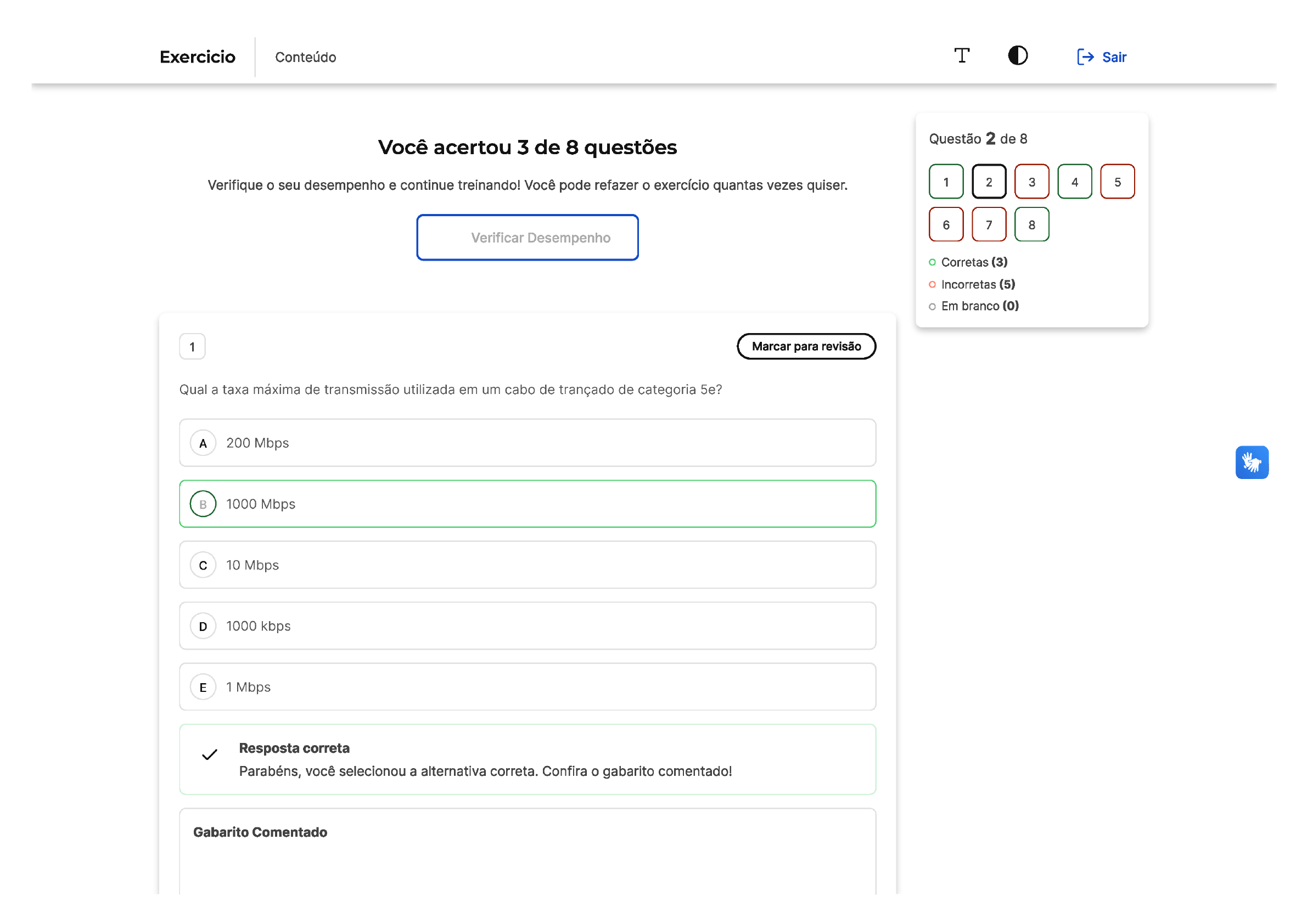 Exercicio Conteúdo T O [D sair E & tão 2 de 8 Você acertou 3 de 8 questões Questão 2 de Verifique o seu desempenho e continue treinando! Você pode refazer o exercício quantas vezes quiser. [ 1 ] [ 2 ] [ 3 4 3 ] | | aja o Corretas (3) o Incorretas (5) Em branco (0) 1 ( Marcar para revisão ) Qual a taxa máxima de transmissão utilizada em um cabo de trançado de categoria 5e? A. 200 Mbps | (5) 1000 Mbps Cc. 10 Mbps D 1000 kbps E 1Mbps A Resposta correta Parabéns, você selecionou a alternativa correta. Confira o gabarito comentado! Gabarito Comentado Os cabos de par trançado tem uma taxa máxima de transmissão de 1000 Mbps 2 ( Marcar para revisão ) Para a transmissão de informações em uma rede se faz necessário a transmissão de informações através de sinais. Qual o primeiro tipo de sinal utilizado nas redes industriais? (1) Sinais elétricos analógicos B Sinais digitais C | Sinais hidráulicos (5) Sinais térmicos E Sinais ópticos x Resposta incorreta Opa! A alternativa correta é a letra A. Confira o gabarito comentado! Gabarito Comentado Os primeiros sinais utilizados foram os sinais elétricos analógicos. Isto ocorreu antes da disseminação do uso dos sinais digitais. 3 ( Marcar para revisão ) As fibras óticas podem ser divididas em multimodo e monomodo. Estes dois tipos de fibras óticas possuem características diferentes, entre estas a distância de transmissão. Uma fibra ótica do tipo monomodo pode transmitir (sem o uso de repetidor) a uma distância máxima de: 4 " (1) 500 m À p, 4 DO (5) 80 km À Pp, c 40km D 10km E 100km x Resposta incorreta Opa! A alternativa correta é a letra B. Confira o gabarito comentado! Gabarito Comentado A fibra monomodo possui uma capacidade de transmitir sinais, sem o uso de repetidor, a uma distância consideravelmente maior que as fibras multimodo, podendo chegar a 80 km 4 ( Marcar para revisão ) Uma antena que tem a capacidade de transmitir em todas as direções é denominada uma antena: A - Unidirecional B Multidirecional C Direcional (5) Omnidirecional E Bidirecional A Resposta correta Parabéns, você selecionou a alternativa correta. Confira o gabarito comentado! Gabarito Comentado A antena Omnidirecional tem a capacidade de enviar o sinal para todos as direções 5 ( Marcar para revisão ) Os sistemas de controle de processo foram criados com o objetivo de: (1) Reduzir o número de processos simplificando a produção B Maximizar o uso da mão de obra (c) Maximizar a produção e minimizar os custos D | Minimizar os danos ambientais E Reduzir o uso de sistemas industriais x Resposta incorreta Opa! A alternativa correta é a letra C. Confira o gabarito comentado! Gabarito Comentado Os principais objetivos eram maximizar a produção e minimizar os custos. Podendo também citar o objetivo de tornar o processo produtivo mais seguro. 6 ( Marcar para revisão D) O desenvolvimento dos microcontroladores e dos computadores representou um avanço significativo para as indústrias. Qual a principal barreira para o uso destes na década de 60? | (1) Os custos elevados B Resistência por tradição C Faltade confiabilidade D Falta de precisão O Medo por parte dos operários | x Resposta incorreta Opa! A alternativa correta é a letra A. Confira o gabarito comentado! Gabarito Comentado Apesar de já estarem disponíveis para o uso, os microcontroladores e os computadores tinham seus custos demasiadamente altos 7 ( Marcar para revisão ) As redes industriais podem trazer diversos benefícios para as empresas. Qual das alternativas NÃO corresponde a um destes benefícios? A . Redução de custos de produção e " (5) Melhor aproveitamento de matéria-prima AY P, e " (c) Aumento do risco para os trabalhadores NY p, D | Melhoria na qualidade dos produtos E Aumento da segurança nas industrias x Resposta incorreta Opa! A alternativa correta é a letra C. Confira o gabarito comentado! Gabarito Comentado O uso das redes industriais aumenta a automatização, dispensando o uso direto de mão-de-obra em algumas atividades de mais grau de periculosidade. 8 ( Marcar para revisão ) Qual o conector mais utilizado para conexão de cabos de par trançado? A. BNC B RJ | (c) RJ45 D P2 E P10 A Resposta correta Parabéns, você selecionou a alternativa correta. Confira o gabarito comentado! Gabarito Comentado O conector para utilizado na conexão de cabos de par trançado é o RJ45. O conector RJ45 é um conector de rede que é usado para conectar dispositivos de rede, como computadores e roteadores. Ele é um conector de oito pinos que é usado para conectar cabos de par trançado. O conector RJ45 é o conector mais utilizado para conexão de cabos de par trançado porque é um conector padrão que é usado em muitos dispositivos de rede. Ele também é um conector robusto que pode suportar o uso intensivo. Outros conectores de rede, como o BNC e o RJ11, são menos utilizados para conexão de cabos de par trançado porque não são tão robustos quanto o conector RJ45. O conector P2 e o conector P10 são conectores de áudio que não são usados para conexão de cabos de par trançado. Portanto, o conector mais utilizado para conexão de cabos de par trançado é o conector RJ45. Exercicio Conteúdo T O [D sair Você acertou O de 8 questões Questão 1 de 8 Verifique o seu desempenho e continue treinando! Você pode refazer o exercício quantas vezes quiser. 1 2 3 4 3 | | no Em branco (8) 1 ( Marcar para revisão ) Qual o conector de uso mais comum no padrão RS-232? A RJ O pe-s c DB-15 D RJ45 E BNC Questão não respondida Opa! A alternativa correta é a letra B. Confira o gabarito comentado! Gabarito Comentado O conector mais utilizados em circuitos com padrão RS-232 é o DB-9 2 ( Marcar para revisão ) As fibras Óticas podem ser divididas em multimodo e monomodo. Estes dois tipos de fibras óticas possuem características diferentes, entre estas a distância de transmissão. Uma fibra ótica do tipo monomodo pode transmitir (sem o uso