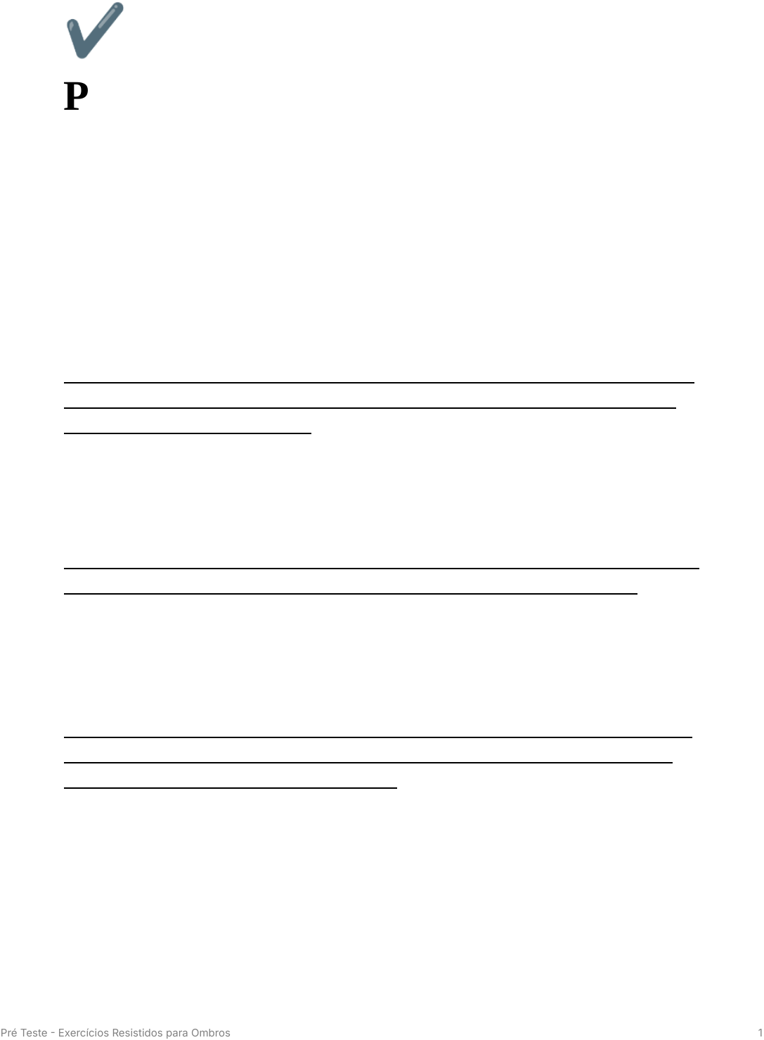 Pré Teste Exercícios Resistidos para Ombros 1 ✔ Pré Teste - Exercícios Resistidos para Ombros 1. Os exercícios físicos indicados para o desenvolvimento ou a manutenção da força muscular, chamados de exercícios resistidos, são considerados parte indispensável de qualquer programa de condicionamento físico. Sabendo disso, assinale a alternativa correta sobre essa prática: A. Os exercícios resistidos promovem benefícios importantes no tratamento de algumas doenças, especialmente aquelas que podem levar a algum tipo de incapacidade física, como as doenças cardiovasculares. Os exercícios resistidos têm sido amplamente reconhecidos como benéficos para uma variedade de condições de saúde, incluindo doenças cardiovasculares. Eles podem ajudar a fortalecer o sistema cardiovascular, melhorar a circulação sanguínea e reduzir fatores de risco associados a essas doenças. B. O treinamento resistido não é indicado para trabalhar a fadiga muscular — ou seja, ele não tem indicação para acostumar o corpo à atividade física e evitar o cansaço excessivo. Na verdade, o treinamento resistido é uma das maneiras mais eficazes de trabalhar a fadiga muscular. Ao realizar exercícios resistidos, os músculos são desafiados a superar resistência, o que leva à fadiga muscular. Com o tempo e a prática regular, os músculos se adaptam, ficando mais fortes e menos propensos à fadiga durante atividades físicas. C. Contrações musculares estáticas, sem movimentação das articulações, também podem ser utilizadas em treinamento resistido, porém seus resultados são pouco satisfatórios quando comparados às contrações musculares dinâmicas. Contrações musculares estáticas, como as realizadas em exercícios isométricos, podem ser tão eficazes quanto as contrações musculares dinâmicas (que envolvem movimento das articulações) para o desenvolvimento da força muscular. Ambas as formas de treinamento resistido têm seus benefícios e podem ser utilizadas de acordo com os objetivos e preferências individuais. Pré Teste Exercícios Resistidos para Ombros 2 2. A prática do exercício resistido vem se tornando cada vez mais popular ao longo dos anos. As academias estão sendo cada vez mais frequentadas por pessoas das mais diversas idades, classes econômicas e gêneros, com diferentes objetivos, seja para promover desempenho esportivo, saúde ou puramente por estética. Entretanto, com o aumento de praticantes, aumenta também a incidência de lesões. Sobre essa afirmação, assinale a alternativa correta: A. As lesões não ocorrem quando se busca pelo desenvolvimento de todos os feixes do músculo, com a intenção de torná-lo visivelmente mais estético, e com a realização de exercícios multiarticulares. Embora a realização de exercícios multiarticulares e o desenvolvimento equilibrado dos músculos possam ajudar a reduzir o risco de lesões, isso não elimina completamente a possibilidade de lesões. Lesões podem ocorrer mesmo quando se busca um desenvolvimento equilibrado e estético dos músculos, especialmente se os exercícios forem realizados de forma inadequada, com excesso de peso ou sem a técnica adequada. B. O treinamento resistido é uma atividade segura e não apresenta riscos de eventos indesejados, como as lesões. Embora o treinamento resistido seja geralmente seguro quando realizado adequadamente, como qualquer forma de exercício, ele ainda apresenta riscos de lesões, especialmente quando feito de forma inadequada, com sobrecarga excessiva, má técnica ou sem aquecimento adequado. Lesões podem ocorrer em qualquer tipo de atividade física, e o treinamento resistido não é uma exceção. C. Os exercícios resistidos, supervisionados, estão cada vez mais sendo preferenciais em caso de pessoas debilitadas. Isso se dá não apenas em função da sua eficiência em promover as adaptações mais importantes para a qualidade de vida, mas também pelo elevado grau de segurança geral. Esta afirmação destaca a importância do treinamento resistido supervisionado, especialmente para pessoas debilitadas ou iniciantes. Supervisão adequada pode ajudar a prevenir lesões, assegurar a execução correta dos exercícios e adaptar o treinamento de acordo com as necessidades individuais, garantindo assim um elevado grau de segurança. 3. Uma seleção adequada dos exercícios resistidos deve ser feita no planejamento dos programas, evitando-se movimentos que possam ser inadequados para cada situação. Sendo assim, assinale a alternativa correta: A. Com os exercícios selecionados, as cargas e as amplitudes serão adaptadas para as limitações individuais, com evolução regressiva, sempre respeitando os limites do conforto Pré Teste Exercícios Resistidos para Ombros 3 articular. B. Em um treino de exercícios resistidos para ganho de hipertrofia, a velocidade de execução das repetições deve ser rápida tanto na fase concêntrica como na excêntrica. Para o ganho de hipertrofia muscular, a ênfase geralmente é colocada na execução controlada e lenta das repetições, especialmente na fase excêntrica, para maximizar o estímulo nos músculos alvo. C. Normalmente, a carga utilizada nos exercícios resistidos é definida por aproximação sucessiva, tanto para atletas como para a promoção de saúde, terapêutica e reabilitação física. Destaca a abordagem comumente usada para ajustar as cargas nos exercícios resistidos, adaptando-as gradualmente às necessidades individuais e aos objetivos do treinamento, seja para atletas, promoção de saúde ou reabilitação. É importante personalizar a carga para cada situação, garantindo a segurança e eficácia do treinamento. 4. Atualmente, na literatura, há um significativo corpo de evidências que justifica a utilização dos exercícios resistidos. Existem inúmeras vantagens na utilização desses exercícios resistidos. Assinale a alternativa que indica corretamente algumas des