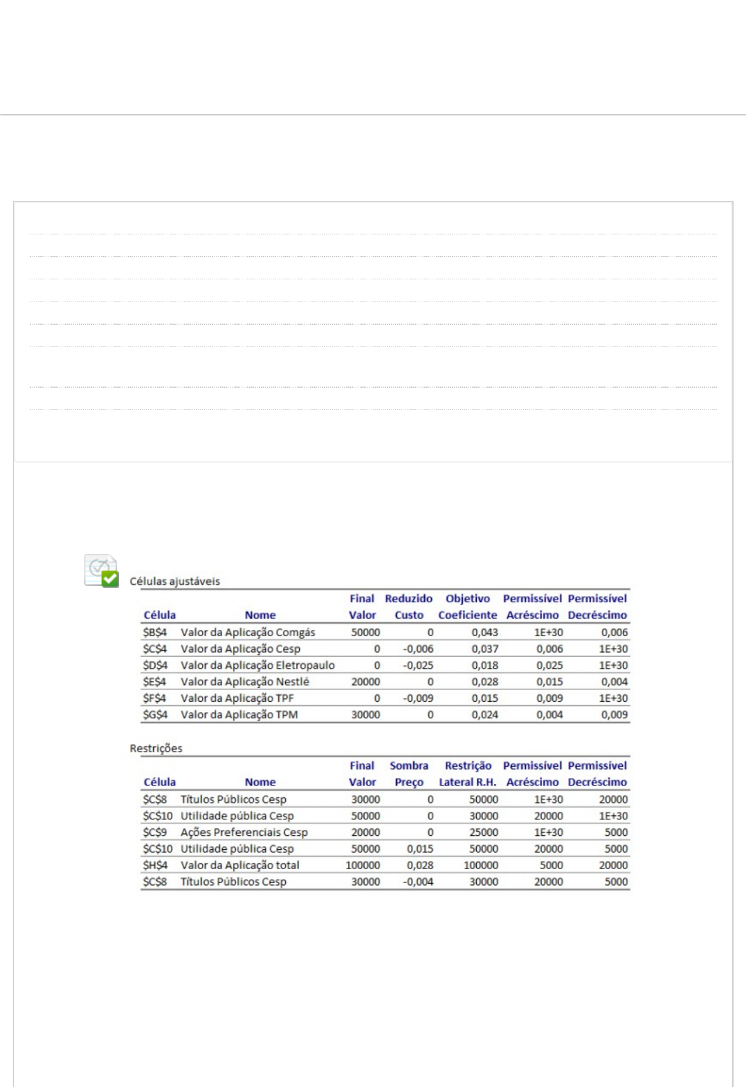 Revisar envio do teste: QUESTIONÁRIO UNIDADE III PESQUISA OPERACIONAL 5398-60_59101_D_20241 CONTEÚDO Usuário tatyele.candido @aluno.unip.br Curso PESQUISA OPERACIONAL Teste QUESTIONÁRIO UNIDADE III Iniciado 03/06/24 14:39 Enviado 03/06/24 14:42 Status Completada Resultado da tentativa 4 em 4 pontos Tempo decorrido 2 minutos Resultados exibidos Todas as respostas, Respostas enviadas, Respostas corretas, Comentários, Perguntas respondidas incorretamente Pergunta 1 A seguir temos um exemplo de um dos três relatórios gerados pelo Excel Solver. A respeito deste relatório, foram feitas as cinco a�rmativas que se encontram a seguir: I. É um Relatório de Sensibilidade e o campo Reduzido Custo mostra o impacto por não se trabalhar na condição ótima naquela variável – por exemplo, se decidíssemos aplicar $ 1 a mais na Cesp, perderíamos 0,006 ou 0,6% no retorno total. Já o campo Permissível Decréscimo mostra os limites aos quais o valor do retorno da aplicação pode variar sem variar a solução ótima. Assim, por exemplo, se o retorno da Comgás baixar em 0,006 ou 0,06%, não há alteração na solução ótima. II. É um Relatório de Sensibilidade e o campo Objetivo Coe�ciente signi�ca o valor da rentabilidade de cada aplicação. Assim, por exemplo, uma aplicação na Comgás rende 0,043 ou 4,3%. Já o campo Sombra Preço signi�ca o quanto se deixa de ganhar por não se CONTEÚDOS ACADÊMICOS BIBLIOTECAS MURAL DO ALUNO TUTORIAISUNIP EAD 0,4 em 0,4 pontos 03/06/24, 14:42 Revisar envio do teste: QUESTIONÁRIO UNIDADE III – ... https://ava.ead.unip.br/webapps/assessment/review/review.jsp?attempt_id=_105410359_1&course_id=_335155_1&content_id=_3852662_1&re… 1/11 http://company.blackboard.com/ https://ava.ead.unip.br/webapps/blackboard/execute/courseMain?course_id=_335155_1 https://ava.ead.unip.br/webapps/blackboard/content/listContent.jsp?course_id=_335155_1&content_id=_3849950_1&mode=reset https://ava.ead.unip.br/webapps/portal/execute/tabs/tabAction?tab_tab_group_id=_25_1 https://ava.ead.unip.br/webapps/portal/execute/tabs/tabAction?tab_tab_group_id=_27_1 https://ava.ead.unip.br/webapps/portal/execute/tabs/tabAction?tab_tab_group_id=_47_1 https://ava.ead.unip.br/webapps/portal/execute/tabs/tabAction?tab_tab_group_id=_29_1 https://ava.ead.unip.br/webapps/portal/execute/tabs/tabAction?tab_tab_group_id=_10_1 https://ava.ead.unip.br/webapps/login/?action=logout Resposta Selecionada: a. Respostas: a. b. c. d. e. Comentário da resposta: ter mais dinheiro aplicado em determinada aplicação. R$ 1,00 adicionado aos recursos disponíveis produziria um acréscimo ao retorno total de 2,8% (0,028). III. É um Relatório de Sensibilidade e o campo Permissível Decréscimo nós dá os limites aos quais o valor do retorno da aplicação pode variar sem variar a solução ótima. Assim, por exemplo, se o retorno da Comgás baixar em 0,006 ou 0,06%, não há alteração na solução ótima. Já o campo Permissível Decréscimo mostra os limites aos quais o valor do retorno da aplicação pode variar sem variar a solução ótima. Assim, por exemplo, se o retorno da Comgás baixar em 0,006 ou 0,06%, não há alteração na solução ótima. IV. É um Relatório de Sensibilidade e o campo Reduzido Custo mostra o impacto por não se trabalhar na condição ótima naquela variável – por exemplo, se decidíssemos aplicar $ 1 a mais na Cesp, perderíamos 0,006 ou 0,6% no retorno total. Já o campo Sombra Preço mostra o quanto se deixa de ganhar por não se ter mais dinheiro aplicado em determinada aplicação. R$ 1,00 adicionado aos recursos disponíveis produziria um acréscimo ao retorno total de 2,8% (0,028). Em relação às a�rmativas acima, podemos dizer que: todas estão corretas. todas estão corretas. todas, com exceção da I, estão corretas. todas, com exceção da II, estão corretas. todas, com exceção da III, estão corretas. todas, com exceção da IV, estão corretas. RESOLUÇÃO: As quatro a�rmativas correspondem exatamente à análise que deve ser feita a partir do relatório apresentado. Portanto, todas estão corretas. Assim, a alternativa correta é a) todas estão corretas. Pergunta 2 Certo produto alimentar é composto por três elementos – A, B e C –, sendo impostas duas restrições básicas à qualidade da mistura: • a percentagem de matéria �brosa não deve ser superior a 3%; • a quantidade de óleo existente no produto alimentar deve ser inferior a duas vezes a quantidade de proteína. A análise dos três elementos é a seguinte: Os elementos A, B e C são comprados ao preço �xo de R$ 53,00; R$ 42,00 e 45,00 por tonelada, respectivamente. O produto alimentar é feito num único lote semanal de 100 toneladas, não havendo perdas de peso durante a fabricação. O objetivo do fabricante é minimizar as despesas semanais. Nessas condições, podemos dizer que a modelagem matemática do problema é dada por: 0,4 em 0,4 pontos 03/06/24, 14:42 Revisar envio do teste: QUESTIONÁRIO UNIDADE III – ... https://ava.ead.unip.br/webapps/assessment/review/review.jsp?attempt_id=_105410359_1&course_id=_335155_1&content_id=_3852662_1&re… 2/11 Resposta Selecionada: c. Respostas: a. b. c. d. e. Comentário da resposta: Min. Custo (53xA + 42xB + 45xC) sujeito a 0,04xA + 0,02xB + 0,02xC ≤ 3; 0,03xA - 0,03xB - 0,01xC < 0 e xA + xB + xC = 100 Min. Custo (53xA + 42xB + 45xC) sujeito a 0,04xA + 0,02xB + 0,02xC ≤ 3; 0,03xA + 0,03xB + 0,01xC ≤ 0 e xA + xB + xC = 100 Min. Custo (53xA + 42xB + 45xC) sujeito a 0,04xA + 0,02xB + 0,02xC ≤ 3; -0,03xA - 0,03xB - 0,01xC < 0 e xA + xB + xC = 100 Min. Custo (53xA + 42xB + 45xC) sujeito a 0,04xA + 0,02xB + 0,02xC ≤ 3; 0,03xA - 0,03xB - 0,01xC < 0 e xA + xB + xC = 100 Min. Custo (53xA + 42xB + 45xC) sujeito a 0,04xA - 0,02xB + 0,02xC ≤ 3; 0,03xA - 0,03xB - 0,01xC < 0 e xA + xB + xC = 100 Min. Custo (53xA + 42xB + 45xC) sujeito a 0,04xA + 0,02xB + 0,02xC ≤ 3; -0,03xA + 0,03xB - 0,01xC ≤ 0 e xA + xB + 