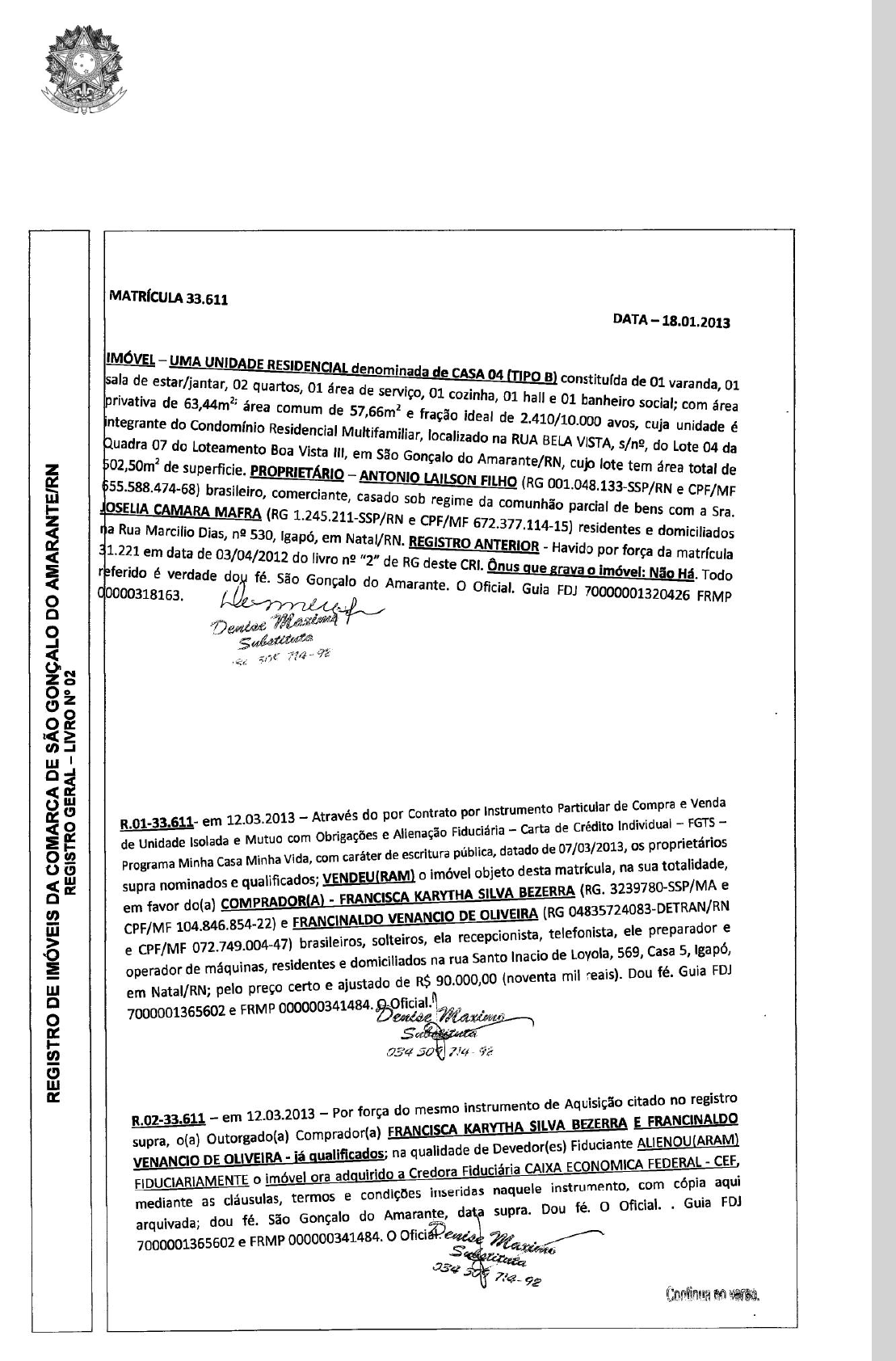 ESTADO DO RIO GRANDE DO NORTE 1º OFÍCIO DE NOTAS E REGISTROS DE SÃO GONÇALO DO AMARANTE CNPJ/MF Nº 08.565.335/0001-69 - CEI (INSS) 80.015.08735/09 Rua do Largo, 11 – Amarante, São Gonçalo do Amarante-RN, CEP: 59296-617 TELEFONE/WHATSAPP: (84) 3614-0167 - E-mail: primeirocartoriosga@gmail.com – site: www.1oficiosga.com.br Aldemir Vasconcelos de Souza Júnior - Tabelião e Oficial de Registro CERTIDÃO DE INTEIRO TEOR A ss in ad o el et ro ni ca m en te p or : A LD E M IR V A S C O N C E LO S D E S O U Z A J U N IO R :7 91 05 03 34 20 ; I ns tit ui çã o: S Ã O G O N Ç A LO D O A M A R A N T E - 1 º O F ÍC IO ; e m : 1 7/ 02 /2 02 4 15 :2 6: 48 mailto:primeirocartoriosga@gmail.com http://www.1oficiosga.com.br/ CERTIFICO que a presente cópia é reprodução autêntica e integral da MATRÍCULA nº 33.611, no inteiro teor do(s) seu(s) ato(s), com todo o seu conteúdo, até a presente data, a qual é suficiente para fins de comprovação de propriedade, direitos, existência ou inexistência de ônus reais e restrições sobre o imóvel, sem necessidade de certificação específica nesse sentido, extraída nos termos do Art. 19 parágrafo 1º, 5º, 6º, 7º e 11º da Lei 6.015/73. Foi emitido o Relatório de Consulta de Indisponibilidade Hash nº 218b.173e.185e.26ac.b2a4.850e.9005.103e.a8b1.98d1, expedida(s) pela Central Nacional de Indisponibilidade de Bens nesta data, restando consulta Negativa. Selo de recepção eletrônica nº RN202400953230008893KDP. Todo o referido é verdade, dou fé. Eu, José Ítalo Paulino Fernandes, o digitei, e Eu, Maria do Socorro Bezerra Moura Soares, Oficial do Registro assinei eletronicamente em público; de que uso, dou fé. São Gonçalo do Amarante/RN, 17 de fevereiro de 2024 Maria do Socorro Bezerra Moura Soares Assinado eletronicamente (Através do Certificado Digital ICP-Brasil) Provimento nº 1272022-CNJ Inteiro Teor Eletrônica Emolumentos R$111,55 Recepção Eletrônica Emolumentos R$18,81 FDJ R$7,59 FRMP 0000002618261 R$1,50 FCRCPN R$2,53 ISS Lei 610/2017 R$0,94 Total R$142,92 Protocolo 32297 Poder Judiciário do RN Selo de Fiscalização Selo Normal RN202400953230008892POU Conferir em: https://selodigital.tjrn.jus.br A ss in ad o el et ro ni ca m en te p or : A LD E M IR V A S C O N C E LO S D E S O U Z A J U N IO R :7 91 05 03 34 20 ; I ns tit ui çã o: S Ã O G O N Ç A LO D O A M A R A N T E - 1 º O F ÍC IO ; e m : 1 7/ 02 /2 02 4 15 :2 6: 48 ALDEMIR VASCONCELOS DE SOUZA JUNIOR:79105033420 2024-02-17T15:26:48-0300 RN Motivo