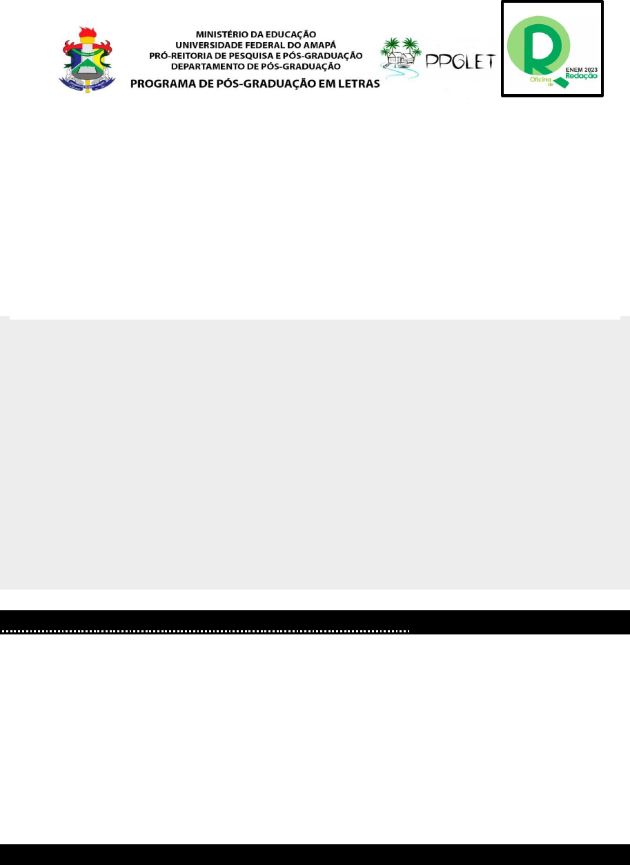 1 PROJETO DE EXTENSÃO OBJETIVOS A SEREM ATINGIDOS: Objetivo Geral: Produzir um texto dissertativo-argumentativo. Objetivos Específicos: • Depreender efeitos de sentido decorrentes do uso da pontuação, escolha de palavras ou expressão e exploração de recursos ortográficos. • Compreender a estrutura do gênero textual dissertativo, reconhecendo sua tipologia. • Diferenciar tema de título. • Identificar a tese de um texto e os argumentos que a sustentam. • Distinguir um fato de uma opinião. • Mobilizar e distinguir um repertório legitimado, pertinente e produtivo. • Estabelecer relações entre as partes de um texto. • Propor uma intervenção com todos os elementos do texto (padrão ENEM). REDAÇÃO ARGUMENTATIVA (DETALHES) TEXTO DISSERTATIVO-ARGUMENTATIVO O texto dissertativo-argumentativo (Redação) é aquele por meio do qual o redator defende seu ponto de vista (tese) com base em argumentos (fatos históricos, exemplos, citações, dados) sobre determinada temática proposta. • Esse tipo de texto compreende 3 partes básicas: introdução, desenvolvimento (que se subdivide em desenvolvimento 1 e desenvolvimento 2) e a intervenção. ✓COMO ELABORAR A INTRODUÇÃO, OS DESENVOLVIMENTOS e A INTERVENÇÃO? INTRODUÇÃO DA REDAÇÃO É a parte introdutória (inicial) do texto, em que o redator irá apresentar um pouco sobre o TEMA (assunto pedido) no comando da avaliação. Além disso, terá que afirmar algo (elaborar a tese) em relação ao tema. Também precisa antecipar de que modo irá desdobrar (desenvolver) esse tema, apontando 2 problemas básicos ligados à temática e, de preferência, ir encaminhando-se para a intervenção. OFICINA DE REDAÇÃO MODELO ENEM REALIZAÇÃO: Professora Ana Viana (Mestranda – PPGLET 2022/2) Monitores: Emylly Castro e Enzo Ferreira (Graduação em Letras – UNIFAP) • Período: de 05 de março a 02 de abril de 2023, assim distribuídos: MARÇO: DIAS 05, 12,19 e 26 e DIA 2 de abril de 2023. • Carga Horária total do curso: 25 h • Público-alvo: alunos da 2ª e da 3ª série do ensino médio Comunidade Quilombola do Torrão do Matapi 2 TIPOS DE INTRODUÇÃO A estrutura ideal de um texto dissertativo argumentativo no ENEM precisa ser composta por três partes não escritas diretamente, mas perceptíveis no texto: Na aula de hoje serão estudadas 4 maneiras de se introduzir um texto redacional, como contextualizar e apresentar uma tese (ideia, argumento principal) coerente e de que forma será apresentada pelo redator. Existem várias maneiras de se iniciar um texto: a) por meio de definição ou conceito b) recorrendo a uma alusão histórica; c) com base em um argumento de autoridade; d) promovendo uma analogia (comparação) e) citando a Constituição Federal ou outra lei; A introdução do texto dissertativo-argumentativo é uma parte tão importante quanto o desenvolvimento; também exige estratégia, pois é a parte que pode fazer com que o corretor continue ou pare a leitura. Por isso, ela deve ser clara, objetiva e bem direcionada para o que será desenvolvido ao longo do texto. A introdução na Redação do Enem é composta de duas partes importantes: a contextualização e a tese. Na contextualização, é necessário inserir as palavras-chave do texto e, por isso, ela deve ser expositiva/dissertativa. TESE - a tese deve demarcar bem o ponto de vista assumido pelo redator, bem como direcionar o corretor para o que será discutido no(s) desenvolvimento(s). Por isso, esta segunda parte da introdução precisa ter uma forma mais argumentativa. • É na tese que o avaliador irá identificar se o redator fez o projeto de texto (planejamento) do texto. Por isso, ela precisa ser bem elaborada. a) Introdução por Definição (ou conceito) Esta estratégia, uma das mais comuns e utilizadas pelos estudantes, não deixa de oferecer credibilidade para o leitor. A definição ou conceituação pode ser de vários tipos: histórica, teórica, de dicionário e até mesmo pessoal — baseada em suas experiências de vida e visão de mundo. Observe o exemplo: (Conceituação) repert. Para a legislação fiscal brasileira, carga tributária é toda fonte de renda que deriva da arrecadação estatal de tributos, das contribuições de melhoria e das rendas especiais, todas prefixadas em lei. No entanto, apesar de existir a obrigatoriedade do pagamento de tributos pelos cidadãos (Imposto de Renda, IPVA), pouco se vê esses valores retornarem em forma de benefícios aos brasileiros. Prova disso são as parcas condições estruturais das estradas, normalmente esburacadas; vias escuras ou sem asfalto, além do número insuficiente de funcionários, nos postos fiscalizadores, o que prejudica a segurança rodoviária brasileira e, consequentemente gera transtornos à população. Logo, é preciso que o Estado reveja essa postura, o quanto antes. Observe o exemplo da aluna Renata, no tema Causas do Analfabetismo Funcional no Brasil, em que ela iniciou conceituando o assunto principal do tema: 3 “De acordo com a definição da UNESCO, a pessoa é considerada alfabetizada do ponto de vista funcional à medida em que domina as competências mínimas de leitura, escrita e interpretação textual, incluindo a realização de cálculos básicos, dando, assim, à escolaridade uma função na sua vida.” b) Introdução por meio de ALUSÃO HISTÓRICA Outra estratégia interessante e que pode atrair a atenção do corretor para o direcionamento do seu texto é fazer alusões (referências) históricas. Nestas, o recorte temático pode ser justificado pelo contexto histórico, fato ou hábito cultural. A finalidade é explicar que determinada situação permanece ou sofre transformações devido a esses fatores. Observe exemplo da Stephanny Ferreira, no tema “Formas de coibir os baixos índices de acesso à escola no Brasil contemporâneo”: Nos anos 2000, os negativos índices de escolarização infantil fomentaram a reunião da Cú