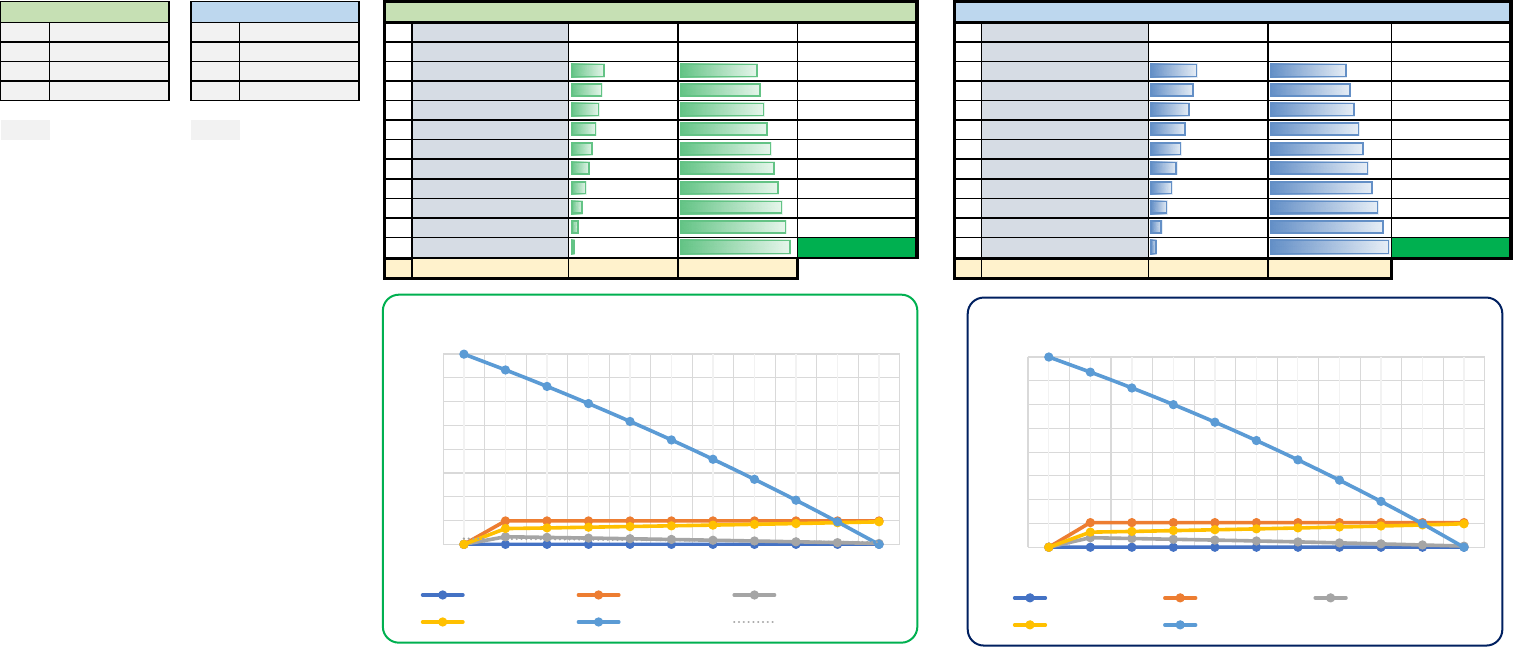 PV R$ 40.000,00 PV 40.000,00R$ N Pagamento (PMT) Juros Amortização S. Devedor N Pagamento (PMT) Juros Amortização S. Devedor n 10 n 10 0 -R$ -R$ -R$ 40.000,00R$ 0 -R$ -R$ -R$ 40.000,00R$ i 3,994411% i 5% 1 4.930,27R$ 1.597,76R$ 3.332,50R$ 36.667,50R$ 1 5.180,18R$ 2.000,00R$ 3.180,18R$ 36.819,82R$ PMT R$ 4.930,27 PMT 5.180,18R$ 2 4.930,27R$ 1.464,65R$ 3.465,62R$ 33.201,88R$ 2 5.180,18R$ 1.840,99R$ 3.339,19R$ 33.480,62R$ 3 4.930,27R$ 1.326,22R$ 3.604,05R$ 29.597,84R$ 3 5.180,18R$ 1.674,03R$ 3.506,15R$ 29.974,47R$ PMT¹ R$ 4.930,27 PMT¹ R$ 5.180,18 4 4.930,27R$ 1.182,26R$ 3.748,01R$ 25.849,83R$ 4 5.180,18R$ 1.498,72R$ 3.681,46R$ 26.293,01R$ 5 4.930,27R$ 1.032,55R$ 3.897,72R$ 21.952,11R$ 5 5.180,18R$ 1.314,65R$ 3.865,53R$ 22.427,48R$ 6 4.930,27R$ 876,86R$ 4.053,41R$ 17.898,71R$ 6 5.180,18R$ 1.121,37R$ 4.058,81R$ 18.368,67R$ 7 4.930,27R$ 714,95R$ 4.215,32R$ 13.683,39R$ 7 5.180,18R$ 918,43R$ 4.261,75R$ 14.106,92R$ 8 4.930,27R$ 546,57R$ 4.383,70R$ 9.299,69R$ 8 5.180,18R$ 705,35R$ 4.474,84R$ 9.632,09R$ 9 4.930,27R$ 371,47R$ 4.558,80R$ 4.740,89R$ 9 5.180,18R$ 481,60R$ 4.698,58R$ 4.933,51R$ 10 4.930,27R$ 189,37R$ 4.740,89R$ 0,00R$ 10 5.180,18R$ 246,68R$ 4.933,51R$ 0,00R$ ∑ 49.302,66R$ 9.302,66R$ 40.000,00R$ ∑ 51.801,83R$ 11.801,83R$ 40.000,00R$ Dados [SAF] Dados [PRICE] SAF (i = Taxa Proporcional Simples = 3,994411% a.m.) PRICE (i = Taxa Proporcional Simples = 5% a.m.) R$ 40.000,00 R$ 36.667,50 R$ 33.201,88 R$ 29.597,84 R$ 25.849,83 R$ 21.952,11 R$ 17.898,71 R$ 13.683,39 R$ 9.299,69 R$ 4.740,89 R$ 0,00 0 5000 10000 15000 20000 25000 30000 35000 40000 1 2 3 4 5 6 7 8 9 10 11 TABELA SAF N Pagamento (PMT) Juros Amortização S. Devedor Linear (Juros) R$ 40.000,00 R$ 36.819,82 R$ 33.480,62 R$ 29.974,47 R$ 26.293,01 R$ 22.427,48 R$ 18.368,67 R$ 14.106,92 R$ 9.632,09 R$ 4.933,51 R$ 0,00 0 5000 10000 15000 20000 25000 30000 35000 40000 1 2 3 4 5 6 7 8 9 10 11 TABELA PRICE N Pagamento (PMT) Juros Amortização S. Devedor PV 146.000,00R$ N S. Devedor Amortização Juros Prestação n 120 0 146.000,00R$ -R$ -R$ -R$ i 2% 1 144.783,33R$ 1.216,67R$ 2.920,00R$ 4.136,67R$ PMT 3.219,02R$ 2 143.566,67R$ 1.216,67R$ 2.895,67R$ 4.112,33R$ 3 142.350,00R$ 1.216,67R$ 2.871,33R$ 4.088,00R$ PV/((1-(1+i)^-n)/i) 4 141.133,33R$ 1.216,67R$ 2.847,00R$ 4.063,67R$ PMT¹ R$ 3.219,02 5 139.916,67R$ 1.216,67R$ 2.822,67R$ 4.039,33R$ 6.083,33R$ 14.356,67R$ 20.440,00R$ N S. Devedor Amortização Juros Prestação 0 146.000,00R$ -R$ -R$ -R$ PV R$ 146.000,00 1 145.700,98R$ 299,02R$ 2.920,00R$ 3.219,02R$ n 120 2 145.395,98R$ 305,00R$ 2.914,02R$ 3.219,02R$ i 2% 3 145.084,87R$ 311,10R$ 2.907,92R$ 3.219,02R$ PMT R$ 1.216,67 4 144.767,55R$ 317,32R$ 2.901,70R$ 3.219,02R$ 5 144.443,88R$ 323,67R$ 2.895,35R$ 3.219,02R$ 1.556,12R$ 14.538,99R$ 16.095,11R$ Dados [SAC] Dados [SAF] SAC - 8a SAF - 8b ∑ ∑