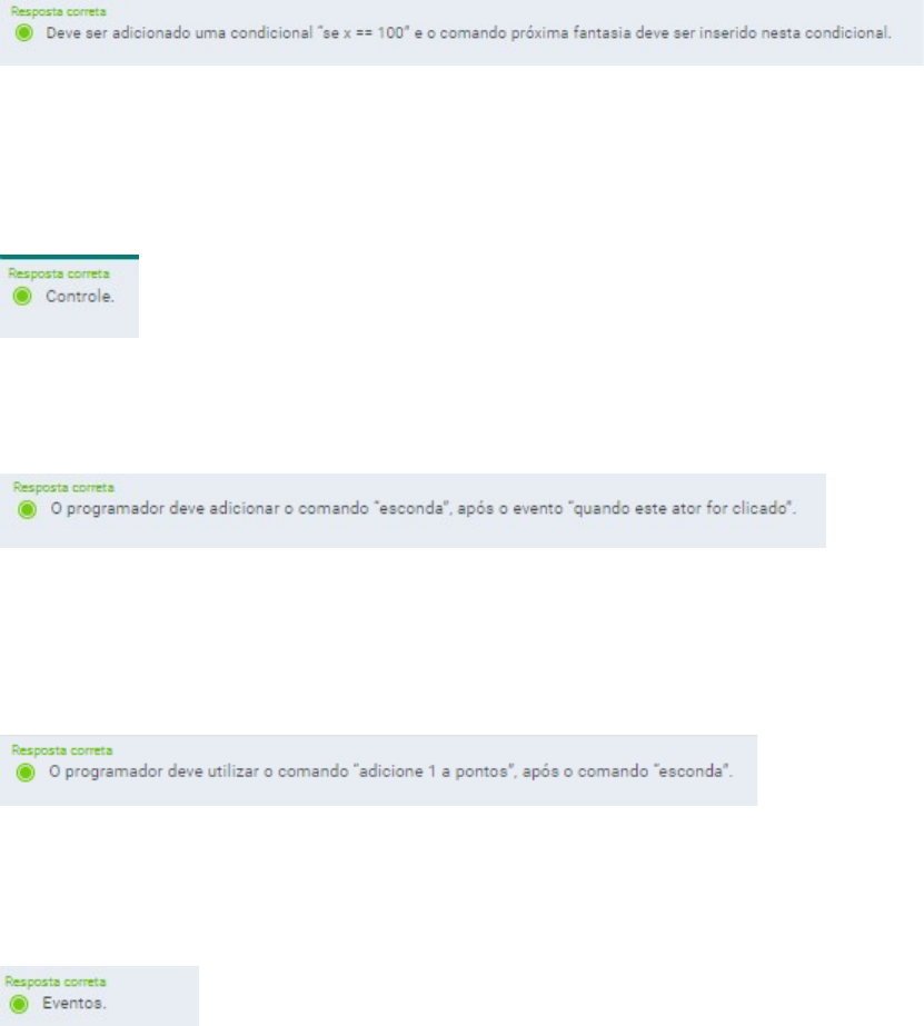 Um programador deseja mudar a fantasia de um ator quando este chegar na posição x = 100. O programador iniciou o seu algoritmo com o evento “Quando a tecla seta para direita for pressionada”, após isso adicionou o comando “adicione 10 a x”. Para mudar o traje é preciso utilizar o comando “próxima fantasia”. Com base no que aprendeu, qual comando deve ser utilizado antes do comando “próxima fantasia”? Um programador deseja criar um jogo no Scratch que permite a coleta de vários itens. Dentre os tipos de itens, um possibilita o aumento do número de chances no jogo (life). Para fazer esta distinção entre os tipos de itens é necessário um comando específico. Com base em seus conhecimentos, o comando a ser utilizado pertence a qual categoria? Um programador deseja criar um jogo em que um ator deve sumir após ser clicado. O programador utilizou o evento “quando este ator for clicado” para iniciar a sequência de instruções. No entanto, ele não sabe como prosseguir para criar a funcionalidade. Com base no que aprendeu, qual comando deve ser utilizado após o evento? Um programador deseja criar um jogo em que um ator deve sumir após ser clicado e, após isso, uma pontuação é adicionada à variável pontos. O programador utilizou o evento “quando este ator for clicado” para iniciar a sequência de instruções, em seguida o comando “mostre”. No entanto, ele não sabe como prosseguir para criar a funcionalidade. Com base no que aprendeu, qual comando deve ser utilizado após o evento? Um programador deseja criar um jogo no Scratch que contém um Ator representado por uma figura de um Carro que se irá se locomover utilizando o comando mova 10 passos. No entanto, o usuário quer executar isso várias vezes, sem a necessidade de repetir este bloco. Com base em seus conhecimentos, os comandos que possibilitam essa repetição pertencem a qual categoria? image1.png image2.png image3.png image4.png image5.png