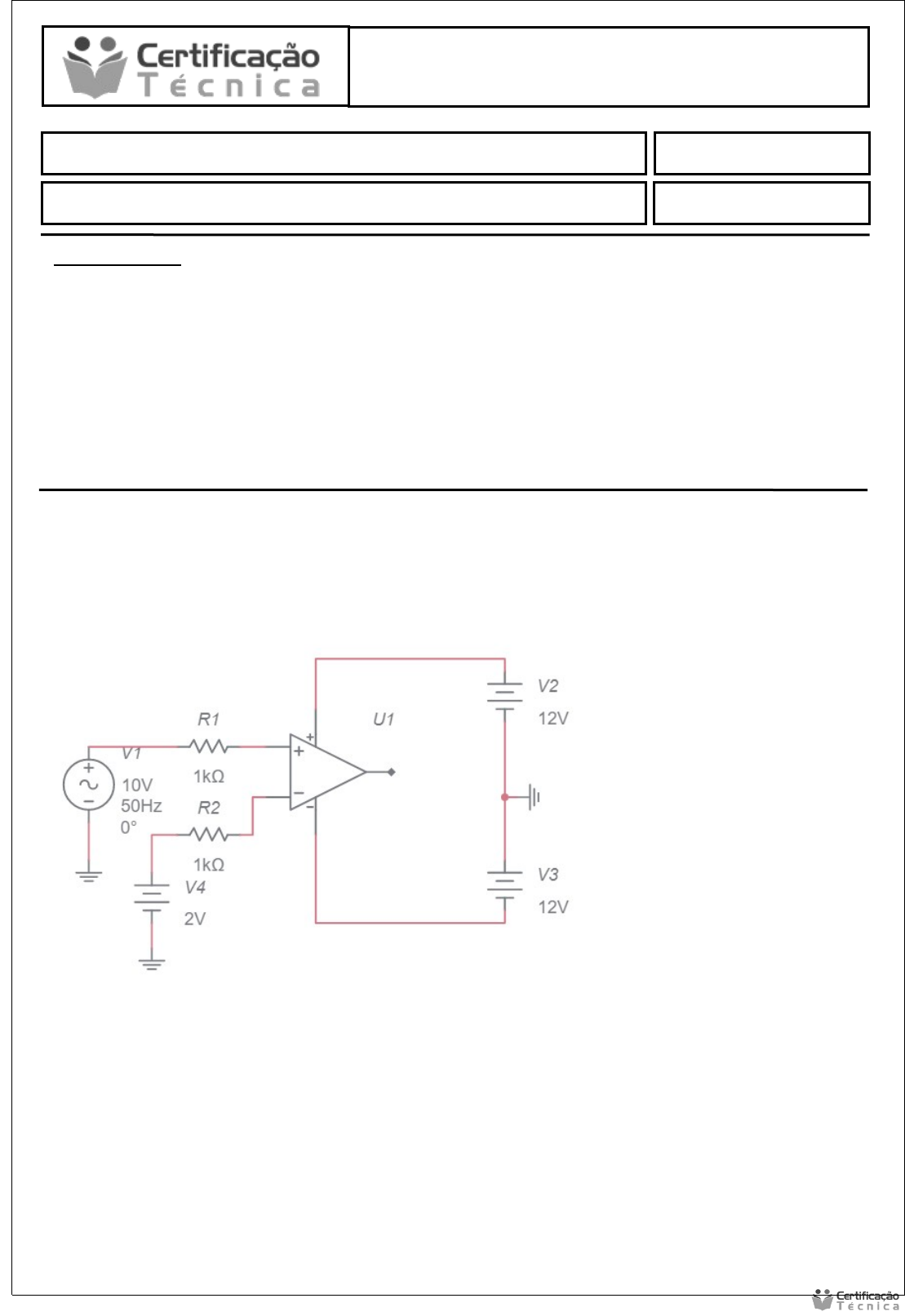 Amplificadores Operacionais Data: . Aluno (a): Avaliação Pratica INSTRUÇÕES: · Esta Avaliação contém 1 (uma) questão, totalizando 10 (dez) pontos; · Baixe o arquivo disponível com a Atividade Pratica; · Você deve preencher dos dados no Cabeçalho para sua identificação: · Nome / Data de entrega. · As respostas devem ser digitadas abaixo de cada pergunta; · Ao terminar grave o arquivo com o nome Atividade Prática; · Quando solicitado · Envio o arquivo pelo sistema no local indicado; · Em caso de dúvidas consulte o seu Tutor. Simule o circuito abaixo, use um osciloscópio para medir o sinal de saída e o apresente aqui: image1.emf image2.png