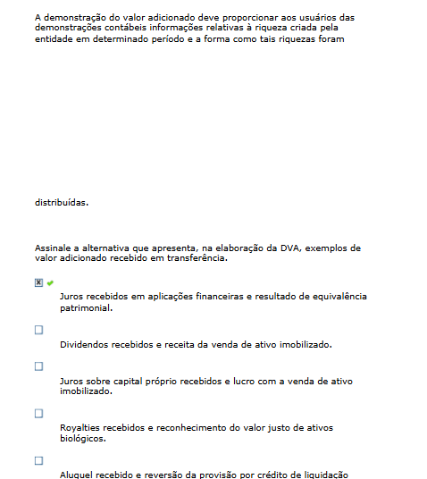 A demonstração do valor adicionado deve proporcionar aos usuários das demonstrações contábeis informações relativas à riqueza criada pela entidade em determinado e a forma como tais riquezas foram distribuídas. Assinale a alternativa que apresenta, na elaboração da DVA, exemplos de valor adicionado recebido em transferência. Juros recebidos em aplicações financeiras e resultado de equivalência patrimonial. Dividendos recebidos e receita da venda de ativo imobilizado. Juros sobre capital próprio recebidos e lucro com a venda de ativo imobilizado. Royalties recebidos e reconhecimento do valor justo de ativos biológicos. Aluguel recebido e reversão da provisão por crédito de liquidação.