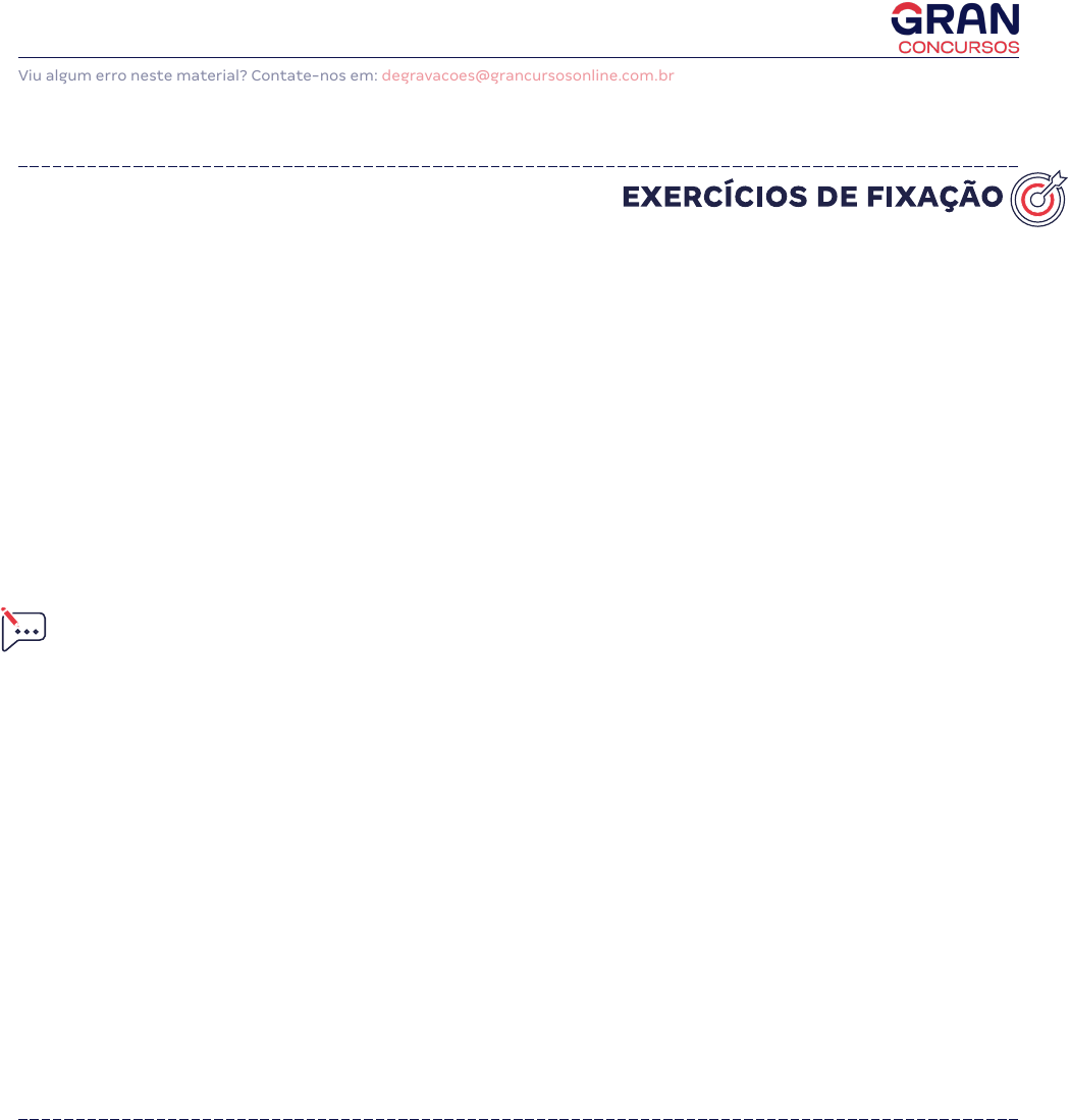 1www.grancursosonline.com.br Viu algum erro neste material? Contate-nos em: degravacoes@grancursosonline.com.br Termos Ligado Ao Nome – Exercícios GRAMÁTICA TERMOS LIGADO AO NOME – EXERCÍCIOS 001. A poluição da água (1) ocorre devido à eliminação do esgoto (2) não tratado, de produtos químicos e resíduos industriais e domésticos, uso de fertilizantes na agricultura e uso de mercúrio no garimpo. Os termos sublinhados no período acima desempenham função sintática, respectivamente, de a. adjunto adnominal e adjunto adnominal. b. adjunto adnominal e complemento nominal. c. complemento nominal e complemento nominal. d. complemento nominal e adjunto adnominal. Retome os termos sublinhados: “da água”: • Está preposicionado. • Está ligado ao termo “poluição” – derivado do verbo “poluir”. • Análise agente/paciente: a água é poluída (é paciente). • Conclusão: é um complemento nominal. • “do esgoto”: • Está preposicionado. • Está ligado ao termo “eliminação” – cognato do verbo “eliminar”. • Análise agente/paciente: o esgoto é eliminado (é paciente). • Conclusão: é um complemento nominal. 002. ...que serve de pretexto para o atentado contra biorritmos. (L.42- 43) O termo sublinhado no período acima desempenha função sintática de a. objeto indireto. b. complemento nominal. c. adjunto adnominal. d. predicativo do objeto. 2www.grancursosonline.com.br Viu algum erro neste material? Contate-nos em: degravacoes@grancursosonline.com.br Termos Ligado Ao Nome – Exercícios GRAMÁTICA Retome o termo destacado: “contra biorritmos”: • Está preposicionado. – Lembre-se que “contra” é uma preposição. Obs.: � decore as classes gramaticais fechadas. • Está ligado ao termo “atentado” – derivado do verbo “atentar”. • Análise agente/paciente: os biorritmos são alvo desse atentado (é paciente). • Conclusão: é um complemento nominal. 003. No fragmento “o segundo grupo são pessoas frequentemente expostas a altos níveis de mercúrio”, o termo destacado exerce a função sintática de: a. Adjunto adnominal. b. Complemento nominal. c. Predicativo do sujeito. d. Predicativo do objeto. Retome o termo destacado: “a altos níveis de mercúrio”: • Está preposicionado. 1) Perceba que o “a” não tem como ser artigo, pois “níveis” é um termo masculino e plural. • Está ligado ao termo “expostas” – um adjetivo que está caracterizando “pessoas”. • Conclusão: expressão preposicionada ligada a adjetivo só pode ser comple- mento nominal. Entretanto, essa abordagem não é unânime no campo da linguística. Para muitos estudiosos, a interpretação sexista do masculino genérico ignora as origens latinas da língua portuguesa. 3www.grancursosonline.com.br Viu algum erro neste material? Contate-nos em: degravacoes@grancursosonline.com.br Termos Ligado Ao Nome – Exercícios GRAMÁTICA 004. No trecho “a interpretação sexista do masculino genérico” (segundo período do terceiro parágrafo), os vocábulos “a” e “sexista” classificam-se, sintaticamente, como adjuntos adnominais do termo “interpretação”, e a expressão “do masculino genérico” classifica-se como complemento nominal desse mesmo termo. Veja: “a interpretação sexista do masculino genérico” • “interpretação” – substantivo. • “a” – adjunto adnominal. – Artigo ligado ao nome. • “sexista” – adjunto adnominal. – Porque é um adjetivo que está junto do nome, sem preposição. • “do masculino genérico”: – Está preposicionado. – Ligado ao termo “interpretação” – derivado do verbo “interpretar”. – Análise agente/paciente: alguém interpreta o masculino genérico (é paciente). – Conclusão: é um complemento nominal. 005. Assinale a alternativa que indica o número do termo que exerce a função sintática de adjunto adnominal no período a seguir. O número relativo ao termo está inserido imediatamente após o termo sublinhado. Para quem não está familiarizado, a CID é um grande manual (1) que elenca os tipos de doença (2) e seus sintomas (3) para servir de base de consulta (4) e padronização de enfermidades — ela é usada em 115 países. a. 1. b. 2. c. 3. d. 4. Veja: “a CID é um grande manual (1)” 5m 4www.grancursosonline.com.br Viu algum erro neste material? Contate-nos em: degravacoes@grancursosonline.com.br Termos Ligado Ao Nome – Exercícios GRAMÁTICA • “a CID” – sujeito. • “um grande manual” – predicativo do sujeito. – Refere-se a CID. – É uma característica fora do sujeito. • “é” – verbo de ligação. “que elenca os tipos de doença (2)” • “elenca” – VTD. • “os tipos de doença” – OD. “e seus sintomas (3)” • “seus sintomas” – OD do verbo “elenca” também. • “e” – conjunção ligando termos de mesma função sintática. “para servir de base de consulta (4)” • “base” – substantivo concreto. • “de consulta” – adjunto adnominal. 006. Agora estamos testemunhando o desaparecimento de estrelas. O termo sublinhado no período acima exerce função sintática de a. complemento nominal. b. adjunto adverbial. c. objeto indireto. d. adjunto adnominal. e. agente da passiva. Retome o termo: “de estrelas” • Está preposicionado. • Ligado ao termo “desaparecimento” – derivado do verbo “desaparecer”. • Análise agente/paciente: as estrelas desaparecem (é agente). • Conclusão: é um adjunto adnominal. 5www.grancursosonline.com.br Viu algum erro neste material? Contate-nos em: degravacoes@grancursosonline.com.br Termos Ligado Ao Nome – Exercícios GRAMÁTICA O uso da palavra está, necessariamente, ligado à questão da eficácia. 007. No primeiro período do texto, o termo “da palavra” complementa o sentido do substantivo “uso”. Veja: • “da palavra”: – Expressão preposicionada. – L