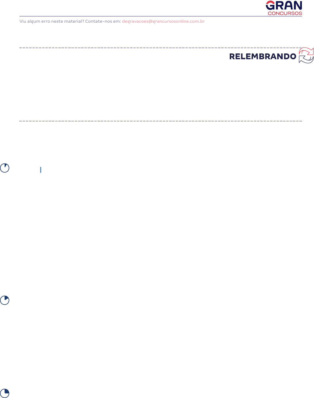 1www.grancursosonline.com.br Viu algum erro neste material? Contate-nos em: degravacoes@grancursosonline.com.br Ortografia e Acentuação II GRAMÁTICA ORTOGRAFIA E ACENTUAÇÃO II Acentuação gráfica: princípios Menor grupo de palavras da Língua Portuguesa: proparoxítonas; Grupo intermediário de palavras da Língua Portuguesa: oxítonas; Maior grupo de palavras da Língua Portuguesa: paroxítonas; Terminações mais frequentes na Língua Portuguesa: A(s); E(s); O(s); EM(ns); Acentuação gráfica: regra especial 1 Acentuam-se os monossílabos tônicos (uma sílaba tônica) terminados em “A”, “E”, “O”. Exemplos: Chá, fé, só Obs.: � não acentuamos “vi” pois é um monossílabo tônico terminado em “i”. Acentuação gráfica: regra especial 2 Acentuam-se os ditongos abertos: “EU”, “EI”, “OI”, quando estiverem em posição oxí- tona, ou seja, ao final da palavra. Ditongos abertos podem ser pronunciados de diferen- tes formas. Exemplos: Chapéu, pastéis, corrói Novo Acordo Ortográfico: Ideia, boia. Nos exemplos citados, os ditongos estão em posição paroxítona, logo, perderam a acentuação. Acentuação gráfica: regra especial 3 Acentuam-se as vogais “I” e “U”, quando forem a segunda vogal de um hiato. As vogais precisam ser a segunda vogal do hiato. Exemplos: saúde, país. Novo Acordo Ortográfico: feiura. Na palavra feiura, temos um hiato, Contudo, é um hiato precedido por um ditongo. O Novo Acordo Ortográfico definiu que em caso de hiato precedido por ditongo, e estiver na posição paroxítona, não deve ser acentuado. No caso da palavra Piauí, o hiato está na posição oxítona, logo, a acentuação da palavra permanece. Acentuação gráfica: regra especial 4 Na Língua Portuguesa, alguns acentos diferenciais foram mantidos. Perderam o acento Para / Pára (classes gramaticais diferentes, sendo uma proposição e outra um verbo); 5m 10m 15m 2www.grancursosonline.com.br Viu algum erro neste material? Contate-nos em: degravacoes@grancursosonline.com.br Ortografia e Acentuação II GRAMÁTICA Pelo / Pêlo (preposição “Por” + artigo “O”. Com acento é substantivo); Pela / Pêla Pera / Pêra (Sem acento refere-se ao português arcaico. Com acentuação substantivo); Polo / Pólo Foram mantidos (acento diferencial) Mantém / mantêm (3º pessoa do singular e 3º pessoa do plural) No caso acima, mantém é uma oxítona terminada em “em”, logo, recebe acentuação pois são palavras derivadas. O mesmo acontece com intervém e intervêm. Tem / Têm (Verbo na 3º pessoa do singular e verbo na 3º pessoa do plural); Vem / Vêm (Verbo na 3º pessoa do singular e verbo na 3º pessoa do plural); Pode / Pôde (verbo no presente e verbo no pretérito perfeito); Por / Pôr (preposição e verbo). Acentuação gráfica: regra especial 5 Os acentos em vogais iguais foram todos retirados. Exemplos: Voo, veem, enjoo. Acentuação Gráfica: exceções Regra do hiato Não são acentuados as vogais “I” e “U”, quando formam hiato e são seguidos de “M”, “N”, “NH”, “R” ou ‘Z”. Exemplos: juiz, ruim, ruir, constituinte, rainha. É importante ressaltar que o plural de algumas palavras são acentuados, como em raízes e juízes. Outra exceção é o caso de “ruína”, o “n” não permanece na mesma sílaba, logo, recebe acentuação. No caso de “rainha”, não se separa o “N”, logo, também não recebe acentuação. Mapa mental Devido à grandeza do conteúdo e suas especificidades, um mapa mental pode facili- tar o entendimento do conteúdo. Logo, é indicado confeccionar um esquema que sinte- tiza todo o aprendizado de uma forma simples, prática e de acesso rápido para futuras revisões. 20m 25m 30m 3www.grancursosonline.com.br Viu algum erro neste material? Contate-nos em: degravacoes@grancursosonline.com.br Ortografia e Acentuação II GRAMÁTICA 1. Assinale a alternativa que apresenta apenas palavras que estão corretamente acentuadas, segundo a ortografia da língua portuguesa: a. aliás - também - feiura - bárbaro. b. vocês - enjoo - asteróide - pássaro. c. após - veem - geleia - médico. d. pajé - armazem - bocaiúva - trânsito. e. mocotó - perdoo - joia - líquido. Oxítona terminada em a seguida de s ainda é acentuada. Alguns ditongos permanecem com acentuação, são casos de exceção. Ditongos abertos em o e e perderam acentuação. 2. Assinale a alternativa em que a justificativa para o uso do acento gráfico está correta e a palavra entre parênteses também está corretamente acentuada e com a mesma justificativa de uso. a. Zodíaco: proparoxítona. (paranóico) b. Imóvel: paroxítona terminada em “l”. (dócil) c. Céus: oxítona terminada em ditongo no plural. (véu) d. Astronômica: oxítona terminada em “a”. (evidência) e. Superfície: proparoxítona terminada em ditongo decrescente. (série) Ditongos abertos em o e e em posição paroxítona perderam o acento. 3. A Organização Mundial da Saúde convocou uma reunião de urgência para tratar do vírus na Guiné Equatorial, que já provocou a morte de pessoas e obrigou o país a declarar alerta sanitário. Assinale a opção CORRETA de acordo com as regras de acentuação gráfica. a. ‘Saúde’, ‘vírus’ e ‘país’ são acentuadas pela mesma regra. b. ‘Urgência’ e ‘sanitário’ são acentuadas por serem proparoxítonas. c. ‘Saúde’ e ‘país’ são acentuadas pela regra dos hiatos, envolvendo as vogais ‘i’ e ‘u’. d. ‘Guiné’, ‘reunião’ e ‘já’ são acentuadas por serem oxítonas terminadas em ‘e’ ‘o’ e ‘a’, respectivamente. e. ‘Guiné’ e ‘já’ são acentuadas por serem oxítonas terminadas em ‘e’ e ‘a’, respectivamente. 35m 40m 4www.grancursosonline.com.br Viu algum erro neste material? Contate-nos em: degravacoes@grancursosonline.com.br Ortografia e Acentuação II GRAMÁTICA Pela regra do hiato, algumas palavras ainda são acentuada