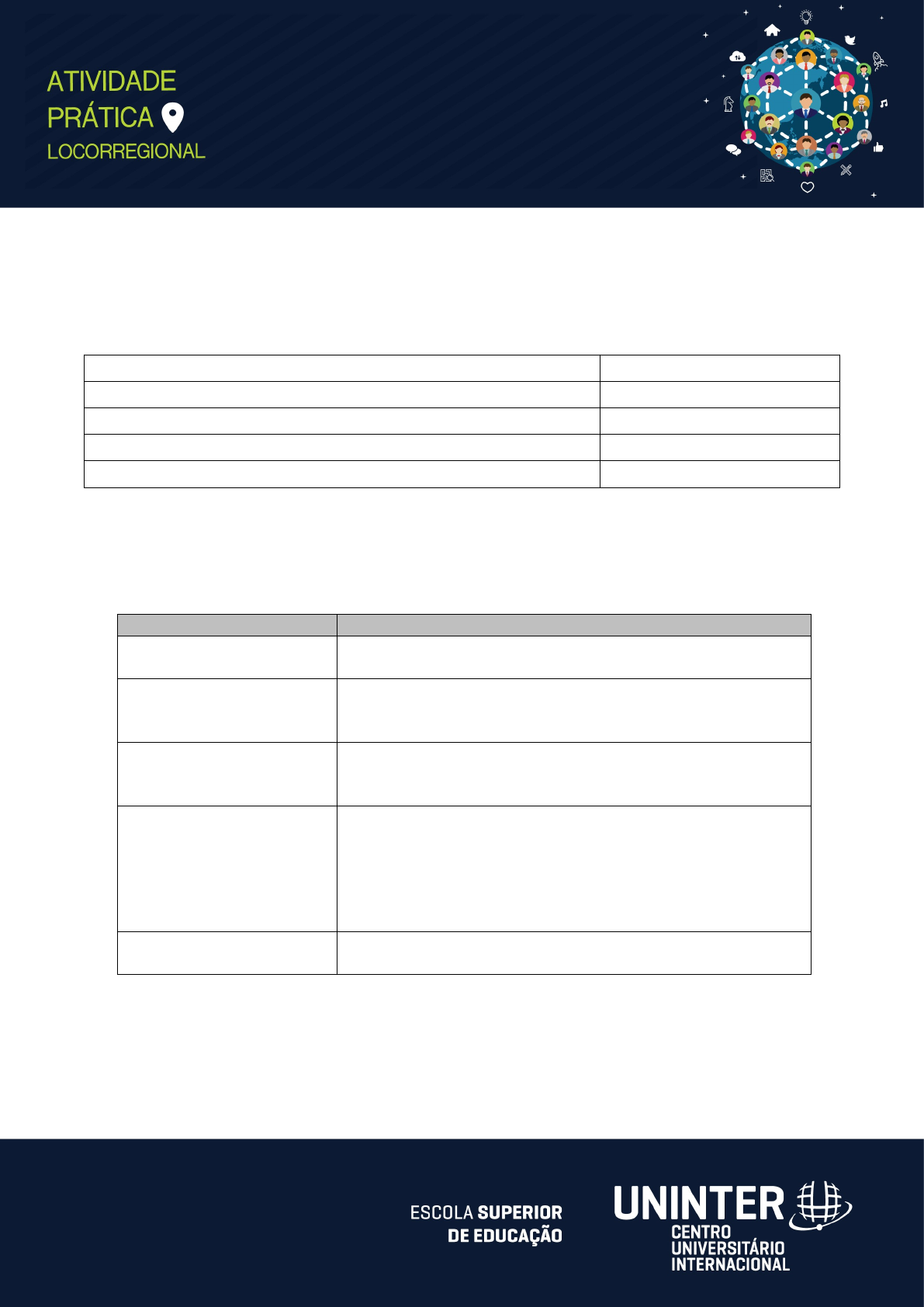 FICHA-RESPOSTA EDUCAÇÃO FÍSICA PRÁTICA LOCORREGIONAL DISCIPLINA: BIOMECÂNICA NOME DO ALUNO RU DO ALUNO 1.Katia da Silva Oliveira 3928106 2. 3. 4. PREENCHA A TABELA ABAIXO COM AS DESCRIÇÕES SOLICITADAS: DESCRIÇÃO PÉ NEUTRO Apresenta uma anatomia que permite com que a pisada seja bem distribuída em todos os pontos dos pés. PÉ CAVO É uma condição que se caracteriza pelo arco do pé alto e bem curvado. Em alguns casos a curvatura é tão grande, que boa parte da planta do pé não toca o chão. PÉ PLANO (CHATO) Apresenta diminuição do arco plantar, o que determina que, ao ficar em pé, a planta do pé toque o chão por inteiro. CURVATURAS NORMAIS DA COLUNA VERTEBRAL Apresenta as curvaturas anatômicas ideais ao longo de toda coluna vertebral, ou seja, ausência de desvios posturais como hiperlodoses (cervical ou lombar) e hipercifoses (torácica ou sacral). Esses desvios, quando funcionais, são ocasionados por desequilíbrios musculares CIFOSE Curvatura anatômica normal da coluna torácica. ESCOLIOSE Essa alteração é caracterizada por presença de desvio lateral no plano frontal e lordose no plano sagital, associada ou não à rotação dos corpos vertebrais no plano transverso. A escoliose pode se localizar na região cervical (menos comum), torácica, lombar ou ainda ocupar essas duas últimas, sendo considerada tóraco-lombar. A nomenclatura é realizada de acordo com a convexidade e o posicionamento da curvatura. HIPERLORDOSE É o aumento do grau da curvatura da coluna cervical e/ou lombar. A hiperlordose lombar está associada a uma anteversão pélvica e consequentemente um realinhamento de todas as outras curvas da coluna para uma compensação. Essa condição, sendo ela funcional, está associada a desequilíbrios musculares como a fraqueza dos músculos do abdômen e glúteos e o encurtamento da musculatura lombar. ALINHAMENTO NORMAL DOS JOELHOELHOS São joelhos com alinhamento neutro, ou seja, nem para dentro, nem para fora. Isso porque, apesar do osso do fêmur e da tíbia terem um ângulo entre si, quando traçamos uma linha imaginária do centro do quadril ao centro do tornozelo, ela passa normalmente no centro do joelho. JOELHOS EM VALGO É o desvio da articulação para dentro com relação à linha central do membro. Nesse tipo de alinhamento, os joelhos estão mais próximos um do outro e os pés mais afastados. JOELHOS EM VARO É uma condição que afeta a articulação do joelho, causando desalinhamento dos ossos do joelho. Isso acontece quando os ossos da tíbia e do fêmur não estão corretamente alinhados, dando a forma diferente à linha da perna. Insira a imagem da avaliação realizada da pisada, no respectivo espaço do quadro PÉ NEUTRO PÉ CAVO PÉ PLANO (CHATO) Insira as imagens da avaliação realizada da coluna vertebral no (s) respectivo (s) espaço (s) do quadro CURVATURAS NORMAIS CIFOSE ESCOLIOSE HIPERLORDOSE Insira a imagem da avaliação realizada do alinhamento dos joelhos, no respectivo quadro ALINHAMENTO NORMAL DOS JOELHOS GENO VARO GENO VALGO APLICAÇÃO LOCORREGIONAL DA PRÁTICA Com base em sua pesquisa, cite, pelo menos, 2 recomendações e 2 exercícios físicos indicados para o fortalecimento e a manutenção da saúde da coluna vertebral de crianças e adultos. Depois disso, faça um levantamento e uma pesquisa da realidade da sua cidade e aponte pelo menos um local (escola, UPA, empresas, centros esportivos etc.) no qual seja possível a realização de orientação e prática dos exercícios físicos indicados para manutenção da coluna vertebral, citando o nome do local e realizando uma breve descrição da sua estrutura. 1 image4.jpeg image1.jpeg image2.jpeg image3.jpeg image5.png