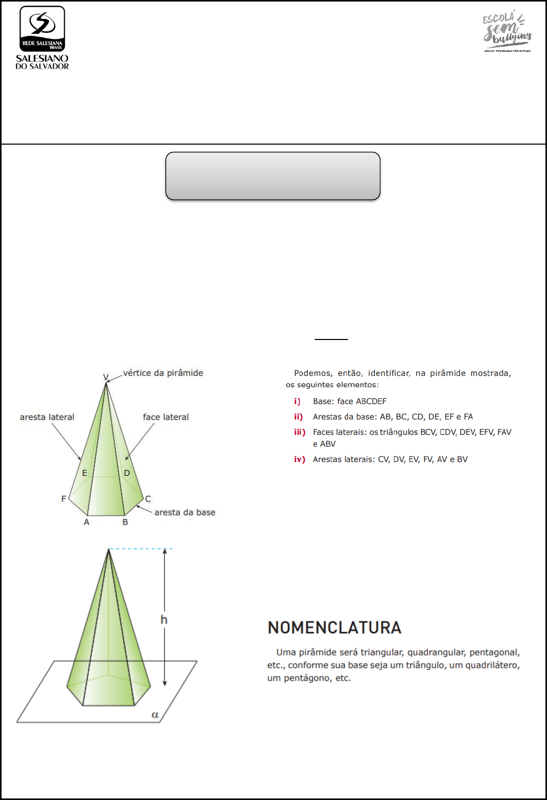 COLÉGIO SALESIANO DO SALVADOR Aluno (a):________________________________________________________________ Nº: ________ Série: 3ª Ens. Médio Turma:_____ Trimestre: 1º Data:_____/_____/_____ Componente Curricular: Matemática Professor(a): Ronaldo Pereira Conteúdos Verificados: Pirâmides Pirâmides DEFINIÇÃO Pirâmide é todo poliedro convexo construído unindo-se os vértices de um polígono qualquer (base da pirâmide) a um mesmo ponto (vértice da pirâmide) situado fora do plano desse polígono. Na figura a seguir, temos uma pirâmide de base ABCDEF e vértice V. Com exceção da base, as demais faces são formadas por um lado da base e pelo vértice da pirâmide. São sempre triângulos e denominadas faces laterais. A altura de uma pirâmide é a distância h entre o vértice e o plano da base. Geometria Espacial – I 2ª Parte 2 Geometria Espacial - I_Prismas e Pirâmides_2ª Parte_Aluno PIRÂMIDE REGULAR Pirâmide regular é uma pirâmide cuja base é um polígono regular, e a projeção ortogonal do vértice sobre o plano da base é o centro da base. Numa pirâmide regular, as arestas laterais são congruentes, e as faces laterais são triângulos isósceles congruentes. Chama-se apótema de uma pirâmide regular a altura (relativa ao lado da base) de uma face lateral. RELAÇÕES NUMA PIRÂMIDE REGULAR Considere a pirâmide quadrangular regular VABCD: Dos triângulos sombreados na figura anterior, tiramos as seguintes relações, válidas para toda pirâmide regular: 3 Geometria Espacial - I_Prismas e Pirâmides_2ª Parte_Aluno ÁREAS LATERAL E TOTAL Para uma pirâmide qualquer, a área lateral corresponde à soma das áreas de todas as faces laterais. Como em uma pirâmide regular as faces laterais são triângulos isósceles congruentes, para calcularmos a área lateral, fazemos a área de uma face lateral multiplicada pelo número de faces laterais. A área total de uma pirâmide corresponde à soma da área lateral com a área da base: VOLUME Sejam AB a área da base e h a altura de uma pirâmide qualquer. O volume V dessa pirâmide é dado por: ATIVIDADE SALA - 1 01. De um tetraedro regular de aresta a, calcular A) a área total AT. B) a medida h da altura. C) o seu volume V. 4 Geometria Espacial - I_Prismas e Pirâmides_2ª Parte_Aluno SECÇÃO DE UMA PIRÂMIDE POR UM PLANO PARALELO À BASE Quando seccionamos uma pirâmide por um plano paralelo à base, separamos essa pirâmide em dois sólidos. O sólido que contém o vértice é uma nova pirâmide, e o sólido que contém a base da pirâmide é um tronco de pirâmide de bases paralelas. A nova pirâmide e a pirâmide primitiva têm bases semelhantes, e os elementos lineares homólogos (arestas das bases, arestas laterais, alturas, etc.) são proporcionais. Assim, dizemos que elas são semelhantes. Razão de semelhança Dadas duas pirâmides semelhantes, a razão entre dois elementos lineares homólogos é denominada razão de semelhança. Essa razão será representada por k Para razões entre áreas homólogas, temos: Para razões entre volumes das pirâmides semelhantes, em que V e v são os volumes das pirâmides grande e pequena, respectivamente, temos: 5 Geometria Espacial - I_Prismas e Pirâmides_2ª Parte_Aluno Podemos, então, generalizar da seguinte maneira: i) A razão entre áreas homólogas de quaisquer dois sólidos semelhantes é igual ao quadrado da razão de semelhança. ii) A razão entre os volumes de dois sólidos semelhantes é igual ao cubo da razão de semelhança. VOLUME DO TRONCO DE PIRÂMIDE Dadas a área AB da base maior, a área aB da base menor e h a medida da altura do tronco, o volume do tronco da pirâmide pode ser obtido por meio da fórmula: ATIVIDADE SALA – 2 02. (UFSC) A base quadrada de uma pirâmide tem 144 m2 de área. A 4 m do vértice, traça-se um plano paralelo à base, e a secção assim feita tem 64 m2 de área. Qual a altura da pirâmide? Resolução: 6 Geometria Espacial - I_Prismas e Pirâmides_2ª Parte_Aluno ATIVIDADE SALA – 3 1. (Ufpr 2020) A pirâmide regular a seguir tem 12 cm de altura e sua base é um quadrado com 10 cm de lado. a) Calcule o volume da pirâmide. b) Calcule a área total da pirâmide. Resposta: 2. (Unicamp 2020) A figura abaixo exibe a planificação de um poliedro convexo, com faces triangulares congruentes e faces retangulares, em que são indicados os comprimentos a, b e c. a) Determine o número de vértices e de arestas desse poliedro. b) Para a 13 cm, b 16 cm e c 10 cm, calcule o volume desse poliedro. Resposta: 7 Geometria Espacial - I_Prismas e Pirâmides_2ª Parte_Aluno 3. (Ime 2023) Sejam P1 um tetraedro regular e P2 um prisma triangular reto. Ambos os poliedros possuem uma base comum, e a razão entre as áreas totais de P2 e P1 é 2. Determine a razão entre os volumes de P2 e P1. Resposta: Atividades Complementares (Questões de vestibulares) 1. (G1 - ifpe 2018) Podemos calcular o volume de uma caixa retangular, como na figura abaixo, de dimensões a, b e c fazendo V a b c. Sabendo que 31mL 1cm , calcule, em litros, o volume de água necessária para encher um tanque retangular de largura a 80 cm, profundidade b 40 cm e altura c 60 cm. a) 1.920 L. b) 192 L. c) 19,2 L. d) 19.200 L. e) 192.000 L. 2. (Famerp 2018) A figura indica um prisma reto triangular e uma pirâmide regular de base quadrada. A altura desses sólidos, em relação ao plano em que ambos estão apoiados, é igual a 4 cm, como indicam as figuras. Se os sólidos possuírem o mesmo volume, a aresta da base da pirâmide, em centímetros, será igual a a) 4 3 3 b) 3 3 2 c) 3 d) 3 3 e) 6 3 5 8 Geometria Espacial - I_Prismas e Pirâmides_2ª Parte_Aluno 3. (Upe-ssa 1 2018) Um engenheiro construiu uma piscina em formato de bloco retangular a qual mede 7 m de comprimento, 4 m de largura e 1,5 m de profundidade. Após encher a piscina completamente, o engenheiro abriu um ralo que tem a capacidade de esvaziá-la à razão de 20 litros por minuto. Utilizando esse ralo, em qu
