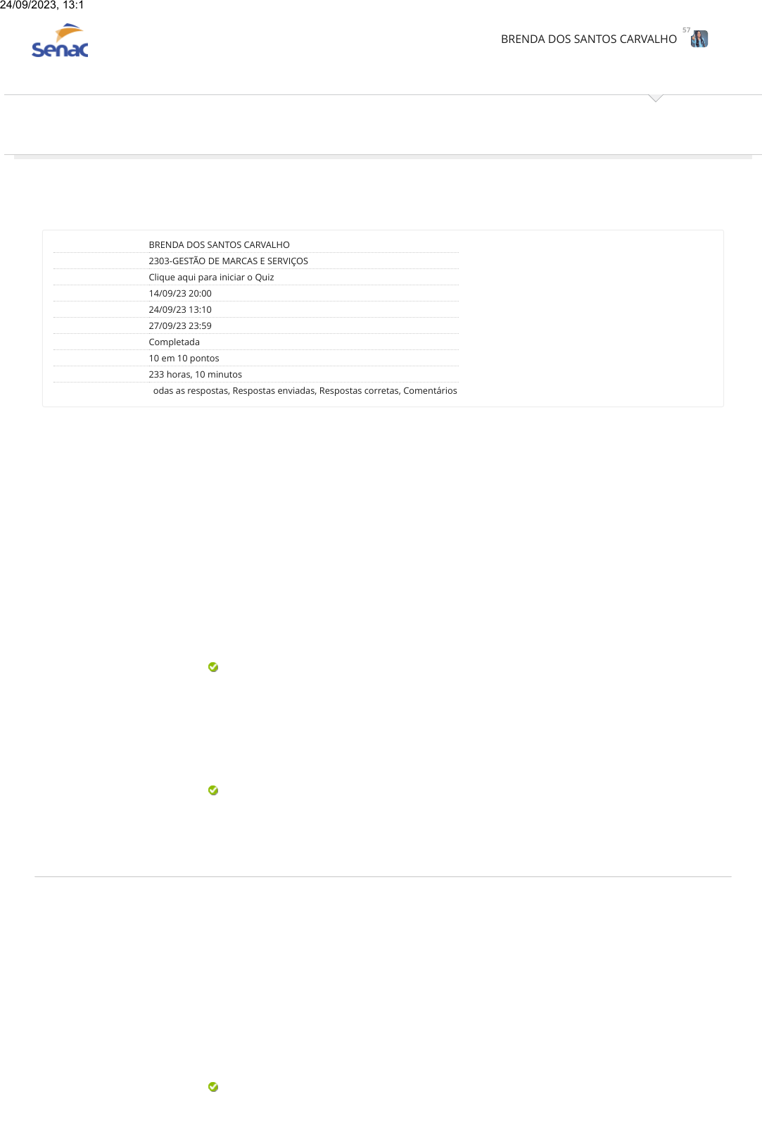 24/09/2023, 13:11 Revisar envio do teste: Clique aqui para iniciar o Quiz &ndash... https://senacsp.blackboard.com/webapps/assessment/review/review.jsp?attempt_id=_33496963_1&course_id=_219336_1&content_id=_987873… 1/6 Revisar envio do teste: Clique aqui para iniciar o QuizBADMCAS5DA_2303-2303-704692 2303-GESTÃO DE MARCAS E SERVIÇOS Quiz REVISAR ENVIO DO TESTE: CLIQUE AQUI PARA INICIAR O QUIZ Usuário BRENDA DOS SANTOS CARVALHO Curso 2303-GESTÃO DE MARCAS E SERVIÇOS Teste Clique aqui para iniciar o Quiz Iniciado 14/09/23 20:00 Enviado 24/09/23 13:10 Data de vencimento 27/09/23 23:59 Status Completada Resultado da tentativa 10 em 10 pontos Tempo decorrido 233 horas, 10 minutos Resultados exibidos Todas as respostas, Respostas enviadas, Respostas corretas, Comentários Pergunta 1 Resposta Selecionada: e. Respostas: a. b. c. d. e. Comentário da resposta: I. Brandy equity diz respeito ao fato de se obter, com uma marca, resultados diferentes daqueles que se obteriam se o mesmo produto ou serviço não fosse identificado por ela. II. CBBE (Consumer Based Brand Equity) estabelece que, para aumentar o brandy equity, é preciso seguir algumas etapas na mente do consumidor: identificar as marcas, esclarecer seus significados, compreender a resposta dos consumidores às marcas e, por fim, promover relacionamento com os consumidores, criando elos mais duradouros entre eles e as marcas. III. Brandy equity está intimamente ligado à lembrança da marca na mente do consumidor, que pode acontecer de forma espontânea ou de forma estimulada. A lembrança espontânea mostra maior elo com a marca, uma vez que lembrar espontaneamente significa que os consumidores não precisam ser estimulados pelo aspecto visual para saberem o que comprar. IV. O valor da marca é intangível e, portanto, não pode ser estimado por cálculos financeiros, apesar da tentativa de algumas empresas de consultoria. Quanto ao conceito de brandy equity, analise as afirmativas a seguir: A respeito das afirmações anteriores, assinale a alternativa correta. As afirmações I, II e III são verdadeiras, e a IV é falsa As afirmações I, II, III e IV são verdadeiras. As afirmações I e III são verdadeiras, e a II e a IV são falsas. As afirmações II e III são falsas, e a I e a IV são verdadeiras. As afirmações I e II são verdadeiras, e a III e a IV são falsas. As afirmações I, II e III são verdadeiras, e a IV é falsa Resposta: e) As afirmações I, II, III são verdadeiras, e a IV é falsa. Feedback: Somente a afirmativa IV é falsa, pois o valor da marca é intangível e pode ser estimado por cálculos financeiros, o que é realizado por algumas empresas de consultoria. Pergunta 2 Resposta Selecionada: b. Respostas: a. I. Quando tratamos de ambientes físicos em serviços é preciso pensar em todos os detalhes: cores, identidade visual, formas, textura, mobiliário etc. II. É preciso harmonizar elementos que afetam o ambiente: temperatura, iluminação, cheiros e sons. III. Os aspectos ambientais interferem diretamente no estímulo ou desestímulo da venda. IV. O ambiente interfere também nos aspectos emocionais dos clientes durante a entrega dos serviços, podendo ser mais emocionante, relaxante ou mesmo desagradável e tedioso. Quanto ao ambiente de serviços, analise as afirmações a seguir. É correto o que se afirma em: I, II, III e IV. I e II apenas. Sala de Aula Tutoriais 1 em 1 pontos 1 em 1 pontos BRENDA DOS SANTOS CARVALHO 57 https://senacsp.blackboard.com/webapps/blackboard/execute/courseMain?course_id=_219336_1 https://senacsp.blackboard.com/webapps/blackboard/content/listContent.jsp?course_id=_219336_1&content_id=_9878712_1&mode=reset https://www.ead.senac.br/ https://senacsp.blackboard.com/webapps/portal/execute/tabs/tabAction?tab_tab_group_id=_260_1 https://senacsp.blackboard.com/webapps/portal/execute/tabs/tabAction?tab_tab_group_id=_210_1 https://senacsp.blackboard.com/webapps/login/?action=logout 24/09/2023, 13:11 Revisar envio do teste: Clique aqui para iniciar o Quiz &ndash... https://senacsp.blackboard.com/webapps/assessment/review/review.jsp?attempt_id=_33496963_1&course_id=_219336_1&content_id=_987873… 2/6 b. c. d. e. Comentário da resposta: I, II, III e IV. II apenas. IV apenas. I, II e III apenas. Resposta: b) I, II, III e IV. Feedback: Todas as afirmações são verdadeiras. Quando se trata de ambientes físicos, é preciso pensar em todos os detalhes: cores, identidade visual, formas, mobiliário e todos os aspecto que impactam no ambiente, como: temperatura, iluminação, cheiros e sons. Tudo isso pode influenciar os consumidores, estimulando-os ou espantando-os. Há boas práticas para ambientar os serviços de acordo com o que se quer influenciar no consumo: trazer estímulo, acalmar, relaxar, motivar a atenção. De modo geral, podemos compreender que ambientes com som alto, músicas agitadas e com cores quentes (vermelho, laranja e amarelo) trazem agitação e inquietude e podem ser usados para estimular emoções. Ambientes de cores frias ou neutras invocam seriedade e tranquilidade: azul, índigo, violeta. Os sons mais suaves são ideais para ambientes que querem ser mais relaxantes. Na tentativa de manter ambientes atrativos e agradáveis, além das cores e dos sons, devem-se considerar aspectos olfativos. A ciência dos aromas, a aromaterapia, tem efeitos conhecidos pelo uso de determinadas essências. Pergunta 3 Resposta Selecionada: a. Respostas: a. b. c. d. e. Comentário da resposta: Considere o exemplo do Google: ao entrar em sua página inicial, observa-se que, em alguns dias, o logo é estilizado de forma a homenagear um personagem da história ou uma data comemorativa. Do ponto de vista da marca, sabemos que se deve preservar a identidade, a imagem e os valores. Assinale a alternativa correta. A marca é tão conhecida e presente na vida de todos os usuários que pode sofrer mudanças de letras e estilo para transmitir parte de seus valores, sem alterar sua ide