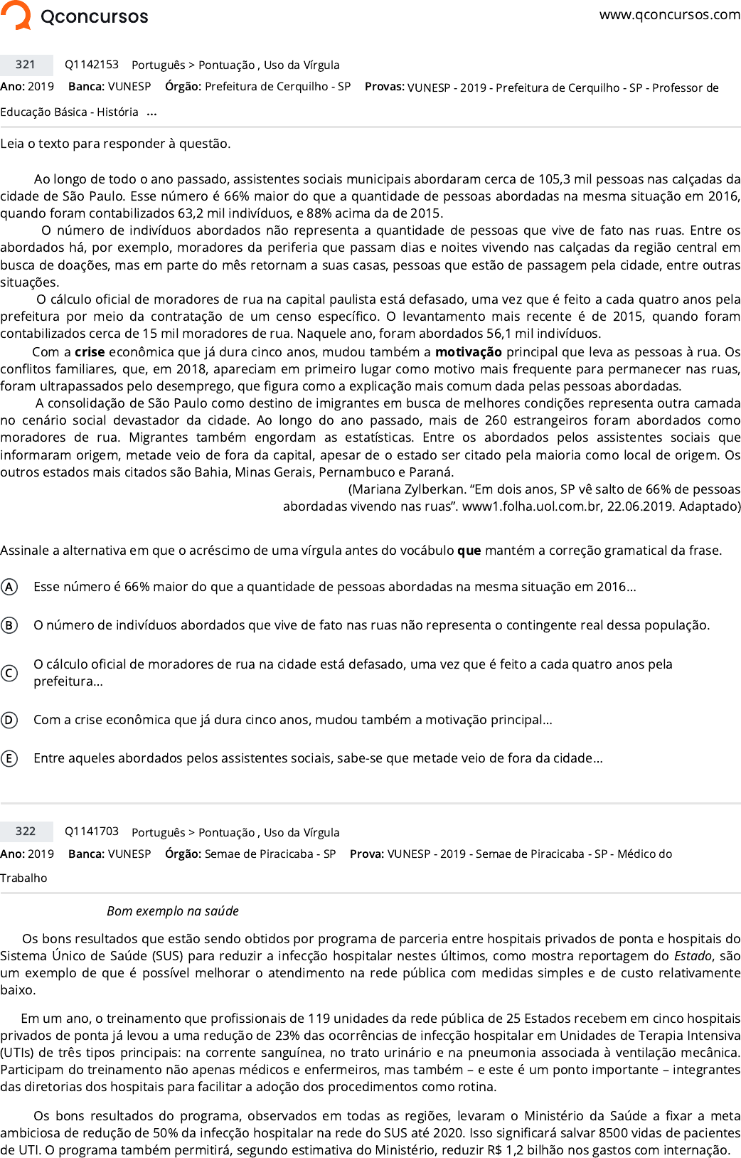 www.qconcursos.com Ano: 2019 Banca: VUNESP Órgão: Prefeitura de Cerquilho - SP Leia o texto para responder à questão. Ao longo de todo o ano passado, assistentes sociais municipais abordaram cerca de 105,3 mil pessoas nas calçadas da cidade de São Paulo. Esse número é 66% maior do que a quantidade de pessoas abordadas na mesma situação em 2016, quando foram contabilizados 63,2 mil indivíduos, e 88% acima da de 2015. O número de indivíduos abordados não representa a quantidade de pessoas que vive de fato nas ruas. Entre os abordados há, por exemplo, moradores da periferia que passam dias e noites vivendo nas calçadas da região central em busca de doações, mas em parte do mês retornam a suas casas, pessoas que estão de passagem pela cidade, entre outras situações. O cálculo o�cial de moradores de rua na capital paulista está defasado, uma vez que é feito a cada quatro anos pela prefeitura por meio da contratação de um censo especí�co. O levantamento mais recente é de 2015, quando foram contabilizados cerca de 15 mil moradores de rua. Naquele ano, foram abordados 56,1 mil indivíduos. Com a crise econômica que já dura cinco anos, mudou também a motivação principal que leva as pessoas à rua. Os con�itos familiares, que, em 2018, apareciam em primeiro lugar como motivo mais frequente para permanecer nas ruas, foram ultrapassados pelo desemprego, que �gura como a explicação mais comum dada pelas pessoas abordadas. A consolidação de São Paulo como destino de imigrantes em busca de melhores condições representa outra camada no cenário social devastador da cidade. Ao longo do ano passado, mais de 260 estrangeiros foram abordados como moradores de rua. Migrantes também engordam as estatísticas. Entre os abordados pelos assistentes sociais que informaram origem, metade veio de fora da capital, apesar de o estado ser citado pela maioria como local de origem. Os outros estados mais citados são Bahia, Minas Gerais, Pernambuco e Paraná. (Mariana Zylberkan. “Em dois anos, SP vê salto de 66% de pessoas abordadas vivendo nas ruas”. www1.folha.uol.com.br, 22.06.2019. Adaptado) Assinale a alternativa em que o acréscimo de uma vírgula antes do vocábulo que mantém a correção gramatical da frase. A Esse número é 66% maior do que a quantidade de pessoas abordadas na mesma situação em 2016… B O número de indivíduos abordados que vive de fato nas ruas não representa o contingente real dessa população. C O cálculo o�cial de moradores de rua na cidade está defasado, uma vez que é feito a cada quatro anos pela prefeitura… D Com a crise econômica que já dura cinco anos, mudou também a motivação principal… E Entre aqueles abordados pelos assistentes sociais, sabe-se que metade veio de fora da cidade… Ano: 2019 Banca: VUNESP Órgão: Semae de Piracicaba - SP Bom exemplo na saúde Os bons resultados que estão sendo obtidos por programa de parceria entre hospitais privados de ponta e hospitais do Sistema Único de Saúde (SUS) para reduzir a infecção hospitalar nestes últimos, como mostra reportagem do Estado, são um exemplo de que é possível melhorar o atendimento na rede pública com medidas simples e de custo relativamente baixo. Em um ano, o treinamento que pro�ssionais de 119 unidades da rede pública de 25 Estados recebem em cinco hospitais privados de ponta já levou a uma redução de 23% das ocorrências de infecção hospitalar em Unidades de Terapia Intensiva (UTIs) de três tipos principais: na corrente sanguínea, no trato urinário e na pneumonia associada à ventilação mecânica. Participam do treinamento não apenas médicos e enfermeiros, mas também – e este é um ponto importante – integrantes das diretorias dos hospitais para facilitar a adoção dos procedimentos como rotina. Os bons resultados do programa, observados em todas as regiões, levaram o Ministério da Saúde a �xar a meta ambiciosa de redução de 50% da infecção hospitalar na rede do SUS até 2020. Isso signi�cará salvar 8500 vidas de pacientes de UTI. O programa também permitirá, segundo estimativa do Ministério, reduzir R$ 1,2 bilhão nos gastos com internação. 321 Q1142153 >Português Pontuação , Uso da Vírgula Provas: VUNESP - 2019 - Prefeitura de Cerquilho - SP - Professor de Educação Básica - História ... 322 Q1141703 >Português Pontuação , Uso da Vírgula Prova: VUNESP - 2019 - Semae de Piracicaba - SP - Médico do Trabalho https://www.qconcursos.com/ https://www.qconcursos.com/questoes-de-concursos/bancas/vunesp https://www.qconcursos.com/questoes-de-concursos/institutos/prefeitura-de-cerquilho-sp https://www.qconcursos.com/questoes-de-concursos/bancas/vunesp https://www.qconcursos.com/questoes-de-concursos/institutos/semae-de-piracicaba-sp https://www.qconcursos.com/questoes-de-concursos/questoes/6cecfd33-6b https://www.qconcursos.com/questoes-de-concursos/disciplinas/letras-portugues https://www.qconcursos.com/questoes-de-concursos/disciplinas/letras-portugues/pontuacao https://www.qconcursos.com/questoes-de-concursos/disciplinas/letras-portugues/uso-da-virgula https://www.qconcursos.com/questoes-de-concursos/provas/vunesp-2019-prefeitura-de-cerquilho-sp-professor-de-educacao-basica-historia https://www.qconcursos.com/questoes-de-concursos/provas/vunesp-2019-prefeitura-de-cerquilho-sp-professor-de-educacao-basica-historia https://www.qconcursos.com/questoes-de-concursos/questoes/395fe935-6a https://www.qconcursos.com/questoes-de-concursos/disciplinas/letras-portugues https://www.qconcursos.com/questoes-de-concursos/disciplinas/letras-portugues/pontuacao https://www.qconcursos.com/questoes-de-concursos/disciplinas/letras-portugues/uso-da-virgula https://www.qconcursos.com/questoes-de-concursos/provas/vunesp-2019-semae-de-piracicaba-sp-medico-do-trabalho https://www.qconcursos.com/questoes-de-concursos/provas/vunesp-2019-semae-de-piracicaba-sp-medico-do-trabalho Tudo isso sem fazer reformas e obras n