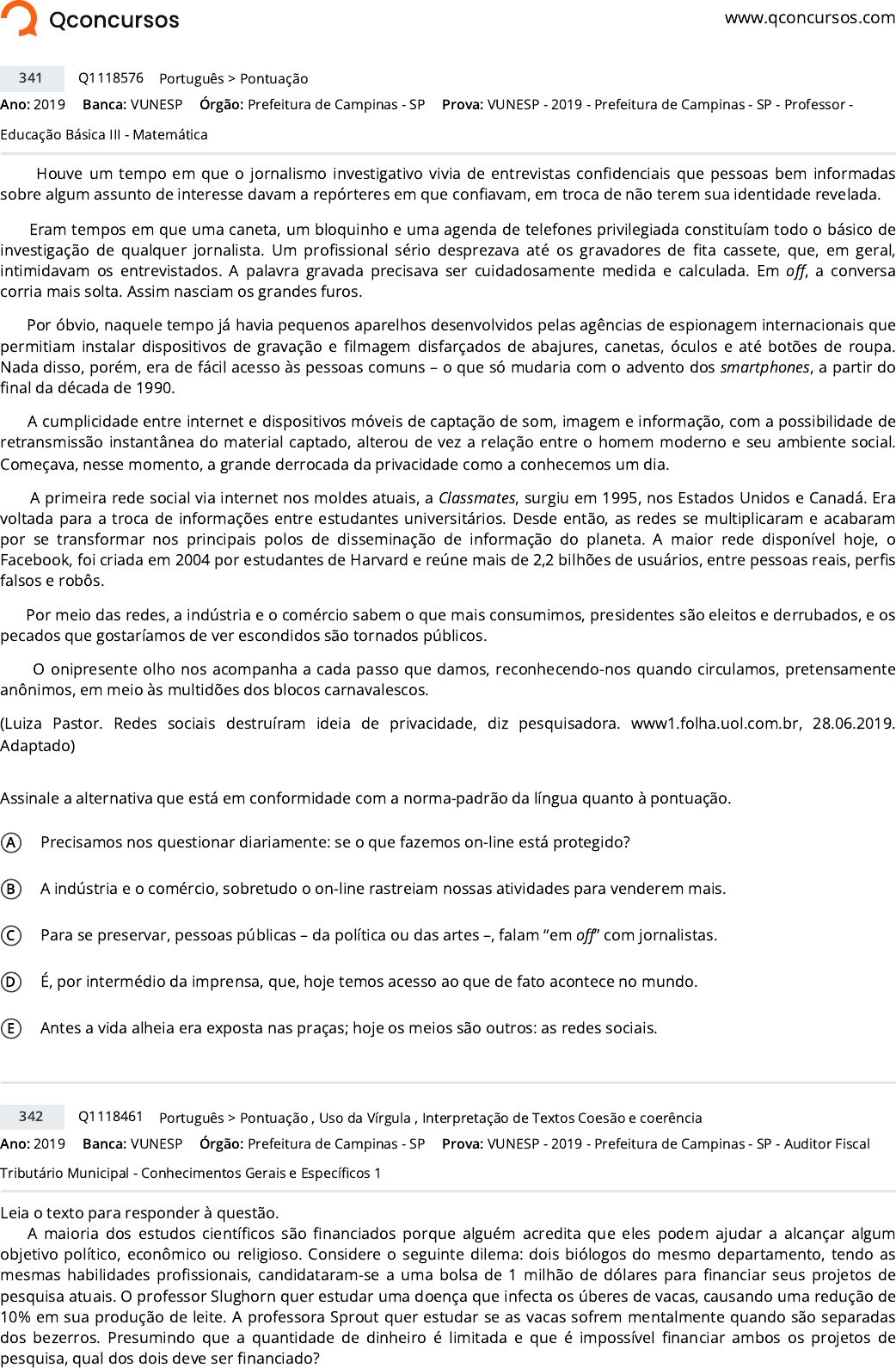 www.qconcursos.com Ano: 2019 Banca: VUNESP Órgão: Prefeitura de Campinas - SP Houve um tempo em que o jornalismo investigativo vivia de entrevistas con�denciais que pessoas bem informadas sobre algum assunto de interesse davam a repórteres em que con�avam, em troca de não terem sua identidade revelada. Eram tempos em que uma caneta, um bloquinho e uma agenda de telefones privilegiada constituíam todo o básico de investigação de qualquer jornalista. Um pro�ssional sério desprezava até os gravadores de �ta cassete, que, em geral, intimidavam os entrevistados. A palavra gravada precisava ser cuidadosamente medida e calculada. Em o�, a conversa corria mais solta. Assim nasciam os grandes furos. Por óbvio, naquele tempo já havia pequenos aparelhos desenvolvidos pelas agências de espionagem internacionais que permitiam instalar dispositivos de gravação e �lmagem disfarçados de abajures, canetas, óculos e até botões de roupa. Nada disso, porém, era de fácil acesso às pessoas comuns – o que só mudaria com o advento dos smartphones, a partir do �nal da década de 1990. A cumplicidade entre internet e dispositivos móveis de captação de som, imagem e informação, com a possibilidade de retransmissão instantânea do material captado, alterou de vez a relação entre o homem moderno e seu ambiente social. Começava, nesse momento, a grande derrocada da privacidade como a conhecemos um dia. A primeira rede social via internet nos moldes atuais, a Classmates, surgiu em 1995, nos Estados Unidos e Canadá. Era voltada para a troca de informações entre estudantes universitários. Desde então, as redes se multiplicaram e acabaram por se transformar nos principais polos de disseminação de informação do planeta. A maior rede disponível hoje, o Facebook, foi criada em 2004 por estudantes de Harvard e reúne mais de 2,2 bilhões de usuários, entre pessoas reais, per�s falsos e robôs. Por meio das redes, a indústria e o comércio sabem o que mais consumimos, presidentes são eleitos e derrubados, e os pecados que gostaríamos de ver escondidos são tornados públicos. O onipresente olho nos acompanha a cada passo que damos, reconhecendo-nos quando circulamos, pretensamente anônimos, em meio às multidões dos blocos carnavalescos. (Luiza Pastor. Redes sociais destruíram ideia de privacidade, diz pesquisadora. www1.folha.uol.com.br, 28.06.2019. Adaptado) Assinale a alternativa que está em conformidade com a norma-padrão da língua quanto à pontuação. A Precisamos nos questionar diariamente: se o que fazemos on-line está protegido? B A indústria e o comércio, sobretudo o on-line rastreiam nossas atividades para venderem mais. C Para se preservar, pessoas públicas – da política ou das artes –, falam “em o�” com jornalistas. D É, por intermédio da imprensa, que, hoje temos acesso ao que de fato acontece no mundo. E Antes a vida alheia era exposta nas praças; hoje os meios são outros: as redes sociais. Ano: 2019 Banca: VUNESP Órgão: Prefeitura de Campinas - SP Leia o texto para responder à questão. A maioria dos estudos cientí�cos são �nanciados porque alguém acredita que eles podem ajudar a alcançar algum objetivo político, econômico ou religioso. Considere o seguinte dilema: dois biólogos do mesmo departamento, tendo as mesmas habilidades pro�ssionais, candidataram-se a uma bolsa de 1 milhão de dólares para �nanciar seus projetos de pesquisa atuais. O professor Slughorn quer estudar uma doença que infecta os úberes de vacas, causando uma redução de 10% em sua produção de leite. A professora Sprout quer estudar se as vacas sofrem mentalmente quando são separadas dos bezerros. Presumindo que a quantidade de dinheiro é limitada e que é impossível �nanciar ambos os projetos de pesquisa, qual dos dois deve ser �nanciado? 341 Q1118576 >Português Pontuação Prova: VUNESP - 2019 - Prefeitura de Campinas - SP - Professor - Educação Básica III - Matemática 342 Q1118461 >Português Pontuação , Uso da Vírgula , Interpretação de Textos Coesão e coerência Prova: VUNESP - 2019 - Prefeitura de Campinas - SP - Auditor Fiscal Tributário Municipal - Conhecimentos Gerais e Especí�cos 1 https://www.qconcursos.com/ https://www.qconcursos.com/questoes-de-concursos/bancas/vunesp https://www.qconcursos.com/questoes-de-concursos/institutos/prefeitura-de-campinas-sp https://www.qconcursos.com/questoes-de-concursos/bancas/vunesp https://www.qconcursos.com/questoes-de-concursos/institutos/prefeitura-de-campinas-sp https://www.qconcursos.com/questoes-de-concursos/questoes/3863921b-43 https://www.qconcursos.com/questoes-de-concursos/disciplinas/letras-portugues https://www.qconcursos.com/questoes-de-concursos/disciplinas/letras-portugues/pontuacao https://www.qconcursos.com/questoes-de-concursos/provas/vunesp-2019-prefeitura-de-campinas-sp-professor-educacao-basica-iii-matematica https://www.qconcursos.com/questoes-de-concursos/provas/vunesp-2019-prefeitura-de-campinas-sp-professor-educacao-basica-iii-matematica https://www.qconcursos.com/questoes-de-concursos/questoes/510cd97f-43 https://www.qconcursos.com/questoes-de-concursos/disciplinas/letras-portugues https://www.qconcursos.com/questoes-de-concursos/disciplinas/letras-portugues/pontuacao https://www.qconcursos.com/questoes-de-concursos/disciplinas/letras-portugues/uso-da-virgula https://www.qconcursos.com/questoes-de-concursos/disciplinas/letras-portugues/interpretacao-de-textos https://www.qconcursos.com/questoes-de-concursos/disciplinas/letras-portugues/coesao-e-coerencia https://www.qconcursos.com/questoes-de-concursos/provas/vunesp-2019-prefeitura-de-campinas-sp-auditor-fiscal-tributario-municipal-conhecimentos-gerais-e-especificos-1 https://www.qconcursos.com/questoes-de-concursos/provas/vunesp-2019-prefeitura-de-campinas-sp-auditor-fiscal-tributario-municipal-conhecimentos-gerais-e-especificos-1 Não há uma resposta cientí�ca para essa pergunta. 