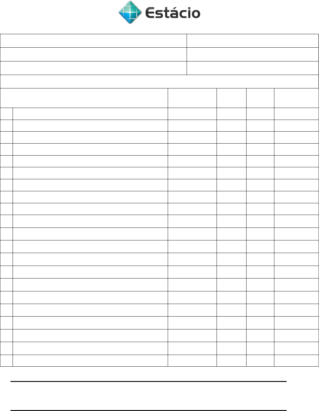 ANEXO 2 – FICHA DE ACOMPANHAMENTO DE ATIVIDADES Nome do(a) Estagiário(a): Michele Margarida de Souza Curso: Pedagogia IES: Centro Universitário Estácio de Ribeirão Preto Polo: Polo Floresta – Belo Horizonte - MG Nome da disciplina de Estágio: Estágio supervisionado em gestão escolar Código da disciplina de Estágio:DGT3041 Estágio na área/segmento: Escola de educação infantil Empresa concedente do estágio: Centro de entretenimento mais -Ltd ATIVIDADES REALIZADAS DATA HORA INÍCIO HORA FINAL Visto do Supervisor 1 Participação em reunião pedagógica 10/04/2024 12:00 15:00 2 Participação em reunião pedagógica 11/04/2024 12:00 15:00 3 Participação em grupo de estudos 12/04/2024 12:00 15:00 4 Participação em grupo de estudos 13/04/2024 12:00 15:00 5 Cadastro de novos alunos a agenda online 15/04/2024 12:00 15:00 6 Cadastro de novos alunos a agenda online 16/04/2024 12:00 15:00 7 Cadastro de novos alunos a agenda online 17/04/2024 12:00 15:00 8 Organização de arquivos e documentos escolares 18/04/2024 12:00 15:00 9 Organização de arquivos e documentos escolares 19/04/2024 12:00 15:00 10 Acompanhamento e suporte a equipe pedagógica nos pedidos de materiais pelo corpo docente 22/04/2024 12:00 15:00 11 Acompanhamento e suporte a equipe pedagógica nos pedidos de materiais pelo corpo docente 23/04/2024 12:00 15:00 12 Acompanhamento e suporte a equipe pedagógica nos pedidos de materiais pelo corpo docente 24/04/2024 12:00 15:00 13 Separação de materiais solicitados pelo corpo docente 25/04/2024 12:00 15:00 14 Separação de pedidos de materiais pelo corpo docente 26/04/2024 12:00 15:00 15 Entrega de materiais solicitados pelas professoras 29/04/2024 12:00 15:00 16 Auxilio de elaboração cronograma escolar 30/04/2024 12:00 15:00 17 Feriado – Dia do trabalho 01/05/2024 -- -- 18 Participação no planejamento festa da familia 02/05/2024 12:00 15:00 19 Participação no planejamento festa da familia 03/05/2024 12:00 15:00 20 Assistencia a equipe gestora na digitação de documentos 06/05/2024 12:00 15:00 Total de horas 57horas ASSINATURA E CARIMBO DO SUPERVISOR(A) DA ORGANIZAÇÃO CONCEDENTE ASSINATURA DO ALUNO image1.jpeg image2.png