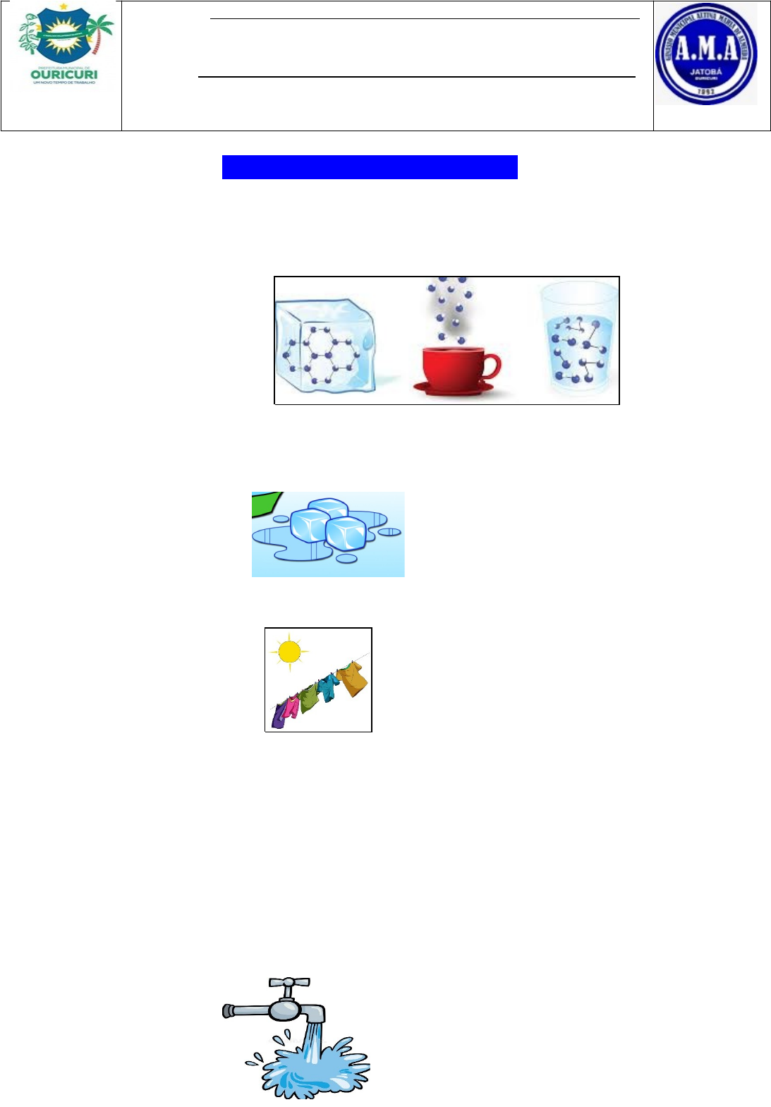 ESCOLA: Ginásio Altina Maria de Almeida____________________ ALUNO (A):____________________________________________ PROfª: ______________________________________________ TURMA: ___________ DATA: ____/____/ ____ AVALIAÇÃO DE CIÊNCIAS/ I UNIDADE QUESTÃO 1. Na natureza, os estados físicos da água mudam com a variação da temperatura do ambiente. Observe a imagem e responda. Quais são os estados físicos da água? a) fusão, plasma ou líquido. b) gasoso, sólido ou fusão. c) líquido, gasoso ou plasma. d) sólido, líquido ou gasoso. QUESTÃO 2. Analise a seguinte situação. Rafaela acabou esquecendo o gelo fora do congelador e ele derreteu. Quando isto aconteceu o gelo passou do estado: a) sólido para o gasoso. b) sólido para o líquido. c) gasoso para o líquido. d) líquido para o gasoso. QUESTÃO 3. As mudanças do estado físico da água podem ser notadas em muitas situações do nosso dia a dia. Qual mudança de estado físico acontece quando as roupas estão secando no varal da sua casa? a) Vaporização. b) Condensação. c) Solidificação. d) Fusão. QUESTÃO 4. Bruno colocou água numa vasilha e levou ao congelador. Duas horas depois, ele viu que a água congelara completamente. Nesse caso, a água passou do estado ___________ para o estado ___________. A alternativa que completa o texto é: a) Sólido e líquido. b) Líquido e sólido. c) Gasoso e sólido. d) Gasoso e líquido. QUESTÃO 5. Observe a imagem ao lado. Podemos dizer que a água que sai pela torneira está no estado: a) Plasma. b) Líquido. c) Gasoso. d) Sólido. Observe a imagem e responda. QUESTÃO 6- A água pode percorrer desde o mais simples até o mais complexo dos caminhos. Observe a ilustração abaixo e perceba o movimento constante da água em nosso Planeta. Este movimento é chamado de... . A) O ciclo da água. B) Os estados físicos da água. C) Movimento da água. QUESTÃO 7. Leia o cartaz e resolva à questão: O texto incentiva: a) Deixar de tomar banho. b) Lavar calçadas e carros. c) Consertar as torneiras. d) Moderar o uso da água. QUESTÃO 8. A água é um recurso natural abundante no planeta, essencial para a existência e sobrevivência das diferentes formas de vida. Marque a opção que apresenta utilidades da água doce em nossa vida: a) apenas para a produção de alimentos industrializados. b) usamos água doce somente para a nossa higiene e para a limpeza do carro. c) usamos água doce na higiene, alimentação, irrigação, lazer e para fins industriais. d) usamos água doce apenas em nossa alimentação. QUESTÃO 9. Beber muita água equilibra o nosso organismo. É recomendado que seja ingerido ao longo do dia: a) pelo menos 2 litros de água. b) bastante água quente para queimar as calorias. c) 2 litros de água de uma só vez. d) mais água gelada para refrescar o dia. QUESTÃO 10- 10. Em relação à água, podemos afirmar que: a) é um recuso natural renovável. b) é um recurso natural não renovável. c) não é um recurso natural. d) só existe em estado líquido. image6.jpeg image7.jpeg image8.jpeg image9.png image1.jpeg image2.jpeg image3.jpeg image4.png image5.jpeg