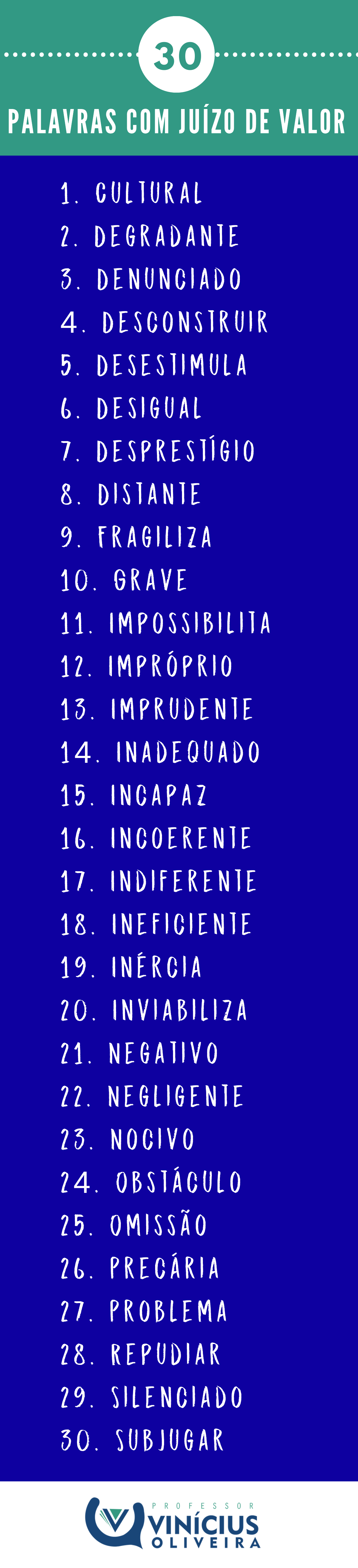 PALAVRAS COM JUÍZO DE VALOR 30 1 . C u l t u r a l 2 . D e g r a d a n t e 3 . D e n u n c i a d o 4 . D e s c o n s t r u i r 5 . D e s e s t i m u l a 6 . D e s i g u a l 7 . D e s p r e s t í g i o 8 . D i s t a n t e 9 . F r a g i l i z a 1 0 . G r a v e 1 1 . I m p o s s i b i l i t a 1 2 . I m p r ó p r i o 1 3 . I m p r u d e n t e 14 . I n a d e q u a d o 1 5 . I n c a p a z 1 6 . I n c o e r e n t e 1 7 . I n d i f e r e n t e 1 8 . I n e f i c i e n t e 1 9 . I n é r c i a 2 0 . I n v i a b i l i z a 2 1 . N e g a t i v o 2 2 . N e g l i g e n t e 2 3 . N o c i v o 24 . O b s t á c u l o 2 5 . O m i s s ã o 2 6 . P r e c á r i a 2 7 . P r o b l e m a 2 8 . R e p u d i a r 2 9 . S i l e n c i a d o 3 0 . S u b j u g a r https://link.pagar.me/lrydJJj8c7 https://link.pagar.me/lrydJJj8c7