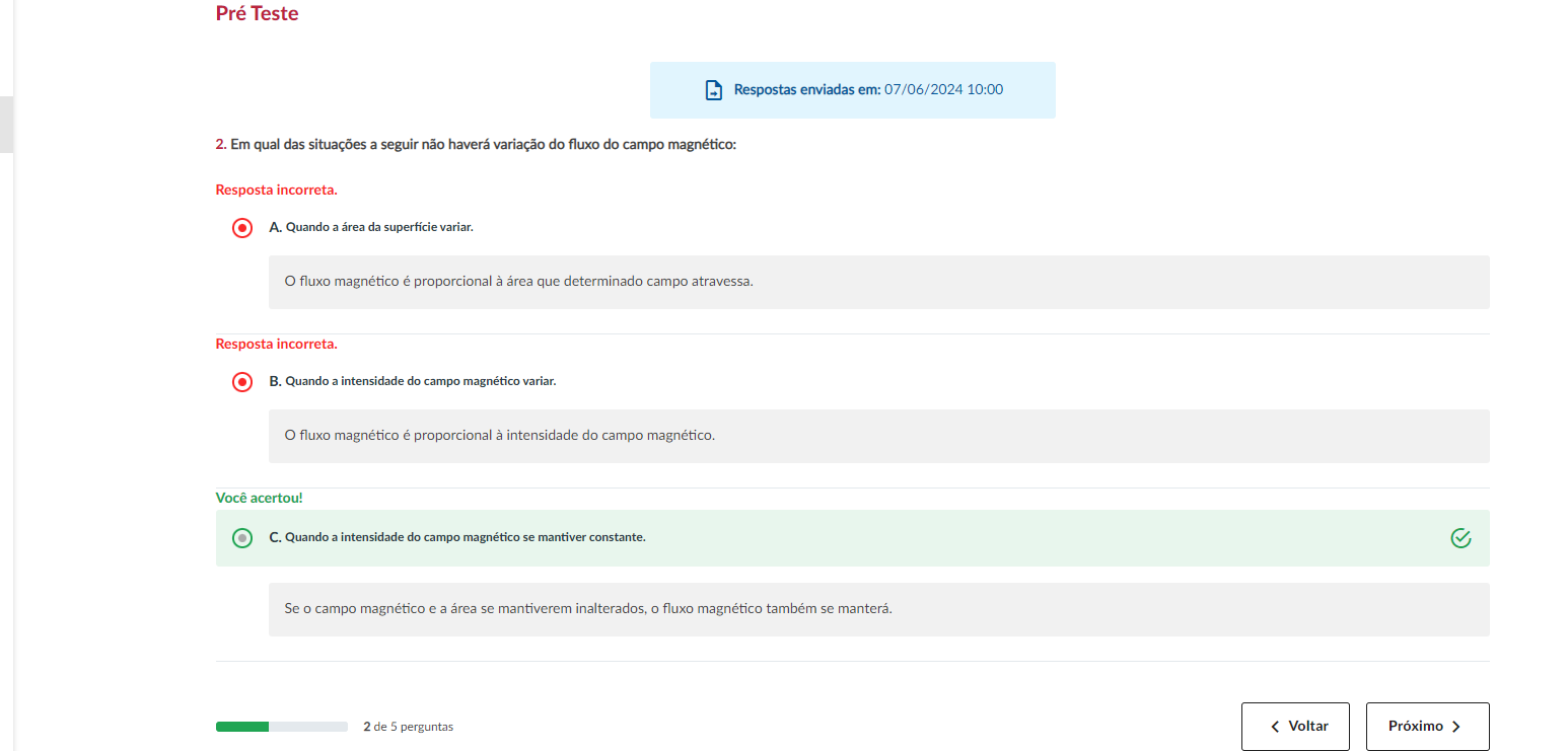 Em qual das situações a seguir não haverá variação do fluxo do campo magnético? A. Quando a área da superfície variar. fluxo magnético é proporcional à área que determinado campo atravessa. B. Quando a intensidade do campo magnético variar. fluxo magnético é proporcional à intensidade do campo magnético. C. Quando a intensidade do campo magnético se mantiver constante. Se o campo magnético e a área se mantiverem inalterados, fluxo magnético também se.