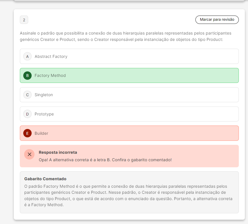 Assinale padrão que possibilita a conexão de duas hierarquias paralelas representadas pelos participantes genéricos Creator e sendo O Creator responsável pela instanciação de objetos do tipo Product: A Abstract Factory B Factory Method C Singleton D Prototype E Builder