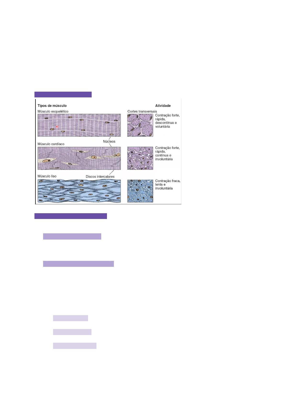 Tecid� Muscular Biologia Tecidual - prova 2 locomoção células altamente diferenciadas especializadas em contração tecido altamente vascularizado e inervado células derivadas da mesoderme numerosas mitocôndrias MONOFILAMENTOS: actina e miosina, elementos contráteis MÚSCULO ESQUELÉTICO a célula muscular é formada por miofibrilas, em seu interior os filamentos de actina e miosina deslizam um sobre o outro produzindo a contração muscular ● VASOS E NERVOS penetram o músculo através de septos de tecido conjuntivo e formam uma rede de capilares que correm entre as fibras musculares ● TECIDO CONJUNTIVO mantém as fibras celulares unidas, permitindo a contração transmite a força de contração para outras estruturas como o tendão, ligamento e ossos compõem as estrias transversais que mantém as fibras organizadas em grupos de feixes de fibra o tecido muscular esquelético é revestido por tecido conjuntivo denso modelado rico em colágeno ○ EPIMÍSIO: reveste externamente, formado por conjuntivo denso e fibras colágenas ○ PERIMÍSIO: reveste o fascículo (junção das fibras), formado de conjuntivo frouxo ○ ENDOMÍSIO: reveste cada uma das fibras as células são chamadas de fibras devido o seu tamanho alongado algumas partes da célula recebem nomes diferentes no músculo: ○ MIÓCITOS: células musculares ○ SARCOLEMA OU PLASMALEMA: membrana plasmática ○ SARCOPLASMA: citoplasma ○ SARCOSSOMOS: mitocôndrias ○ RETÍCULO SARCOPLASMÁTICO: retículo endoplasmático liso ● CÉLULAS SATÉLITE chamadas de PERICITOS uninucleadas, encontradas no endomísio indiferenciadas funcionam como célula tronco para a formação de novas fibras musculares esqueléticas, principalmente após lesão as fibras musculares são incapazes de realizar divisão, mas podem aumentar seu tamanho pela adição de novas miofibrilas periféricas fibras musculares em corte longitudinal mostram elementos contráteis intracelulares, os quais são arranjos paralelos das miofibrilas dispostas longitudinalmente este arranjo produz efeito geral de “estriações” com bandas claras e escuras alternadas transversalmente em cada fibra muscular esquelética ● BANDAS ○ ESCURA: banda A ○ CLARA: banda I no interior de cada banda serão encontrados uma zona e um disco ○ na BANDA A encontra-se a ZONA H, que é mais pálida ○ na BANDA I encontra-se o DISCO Z delgado (ou linha Z) que é mais escuro SARCÔMERO: região da miofibrila que se estende de uma linha Z a outra, unidade de contração do MEE onde ocorre o deslizamento das miofibrilas, para que ocorra a contração TÚBULOS T E TRÍADE: conforme as cisternas opostas dos sarcômeros se encontram, uma invaginação da sarcolema forma túbulos transversais, os túbulos T, que estão associados às cisternas terminais do retículo sarcoplasmático, de modo que cada túbulo T tenha ao seu lado duas cisternas do retículo sarcoplasmático, formando uma tríade ● ARRANJO CELULAR E FILAMENTOS CONTRÁTEIS ○ FASCÍCULO MUSCULAR: envolve a fibra muscular ○ SARCÔMERO: unidade de contração encontrada dentro da célula, compreende os espaços entre as linhas Z, e banda A e a banda H ○ ACTINA E MIOSINA: o cálcio precisa se ligar na actina, para que ocorra uma modificação dessa estrutura e a cabeça da miosina consiga se ligar no lugar correto para realizar a contração ○ FILAMENTOS: possui regiões onde a miosina se liga e regiões onde o cálcio de liga, que são chamados de FILAMENTOS FINOS ● CONTRAÇÃO MUSCULAR medida pela transformação de energia química em mecânica com gastos de ATP ao chegar à fibra muscular, o impulso nervoso de íons Ca2+ para o citoplasma, o que desencadeia a contração a contração ocorre pelo deslizamento dos filamentos de actina sobre os de miosina dentro do sarcômero, com consequente encurtamento da distância entre as linhas Z ocorre um impulso nervoso, que libera cálcio, que se liga a lugares específicos, que liberam a possibilidade da actina se ligar em locais também específicos, para que ocorra a movimentação MÚSCULO ESTRIADO CARDÍACO células musculares estriadas e podem ser multinucleadas, porém com núcleo localizado centralmente aparência histológica estriada terminação do retículo sarcoplasmático conectados ao sistema T (túbulos transversais) formam as DÍADES (1 túbulo e 1 retículo sarcoplasmático) ● DISCOS INTERCALARES: formados por essas células que formam regiões de junções especializadas à medida que interdigitam umas com as outras ○ ZÔNULA DE ADESÃO: âncora filamentos de actina dos sarcômeros terminais ○ DESMOSSOMOS: une células impedindo a separação durante a contração ○ JUNÇÕES COMUNICANTES: permitem a passagem de íons, principalmente do cálcio, fundamentais para a contração MÚSCULO LISO possui contração involuntária cada célula muscular lisa, de formato fusiforme, contém um único núcleo centralmente localizado, o qual assume um formato de saca rolha durante a contração da célula encontrado nas vísceras ● SARCOLEMA CONTENDO ORGANELAS: retículo sarcoplasmático, sarcossomos, complexo de golgi e núcleo ● ELEMENTOS CONTRÁTEIS: miofilamentos de actina e miosina ● ESTRUTURAS ESPECÍFICAS ○ CAVÉOLAS: vesículas de pinacitose contendo Ca2+ e são responsáveis pelo início do processo de contração ○ FILAMENTOS INTERMEDIÁRIOS: ancorados aos corpos densos, proporcionam infraestrutura citoesquelética adicional ○ CORPOS DENSOS: contém actina e são comparáveis às linhas Z dos músculos cardíaco e esquelético ● CONTRAÇÃO MUSCULAR o cálcio migra das cavéolas para o sarcoplasma e se combinam com a proteína calmodulina ativando a enzima cinase da miosina II e sua fosforilação, que promove o deslizamento entre actina e miosina conforme deslizam entre si influenciam a rede de filamentos intermediários e corpos densos associados, encurtando a célula e fazendo a contração ● NERVOS podem ser do