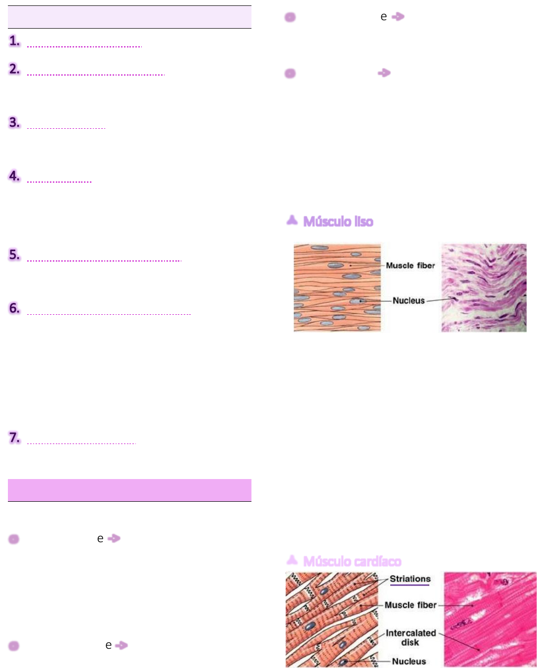 1 Sistema muscular Funções Movimento corporal Manutenção da postura: mantém a postura ereta do corpo. Comunicação: falar, olhar, gesticular, entre outros. Respiração: aumento do volume da caixa torácica. Produção de calor corporal: contração muscular. Constrição de órgãos e vasos: todos os órgãos ocos têm uma ou mais camadas musculares. A constrição dos vasos regula a pressão sanguínea. Batimento cardíaco Propriedades Excitabilidade -> o músculo responde a estímulos (maioritariamente nervosos) que chegam ao músculo através de neurónios. Contractilidade -> encurtamento abaixo do comprimento de repouso. Extensibilidade -> esticar para além da sua dimensão de repouso. Elasticidade -> depois de esticar ou encurtar o músculo é capaz de voltar á posição inicial. Tipos de tecido muscular Músculo liso células fusiformes; controlo involuntário, (auto)ritmicidade; existe nas paredes de órgãos ocos e tubulares (vasos sanguíneos); responsável pela digestão mecânica, esvaziamento da bexiga, vasoconstrição, vasodilatação, midríase (dilatação da pupila) e miose (contração da pupila). Músculo cardíaco células cilíndricas e ramificadas; 2 controlo involuntário, (auto)ritmicidade; principal força impulsionadora do sangue no sistema circulatório. Músculo esquelético células longas, cilíndricas; múltiplos núcleos (localização periférica); regra geral, controlo voluntário. (reflexos musculares -> involuntário); inserção nos ossos - movimento corporal. Estrutura do músculo esquelético ➢ As células deste músculo são denominadas de fibras musculares esqueléticas – células longas e cilíndricas com múltiplos núcleos localizados na periferia da célula. É constituído por estas células, por tecido conjuntivo, vasos sanguíneos e nervos. 1. Endomísio – tecido conjuntivo frouxo, constituído por numerosas fibras reticulares que envolve cada fibra muscular. 2. Perimísio – tecido conjuntivo mais denso, que envolve grupos de fibras musculares com o respetivo endomísio, envolve feixes musculares. 3. Epimisio ou fáscia – tecido conjuntivo denso, fibroso de colagénio que cobre toda a superfície muscular, envolve o músculo constituído por diversos feixes musculares. 1 2 3 Componentes de tecido conjuntivo do músculo contínuos uns com os outros e com tecido conjuntivo dos tendões e periósteo dos ossos. 3 Fibra Muscular Cada célula está rodeada por uma membrana – o sarcolema – e possui inúmeros filamentos – as miofibrilhas -> dispostas no citoplasma da célula – o sarcoplasma. Para além das miofibrilhas, as fibras musculares possuem no seu sarcoplasma um elevado número de mitocôndrias bem como um reticulo sarcoplasmático rugoso. As miofibrilhas são estruturas filamentosas constituídas por unidades contrácteis, sarcómeros – dispostos sequencialmente topo a topo. Os sarcómeros são constituídos por miofilamentos proteicos: actina (finos) e miosina (grossos). É a organização espacial geométrica dos sarcómeros que fornece um aspeto estriado – observação longitudinal Sarcómero 4 banda A (banda escura) –> estende-se ao longo do comprimento dos miofilamentos de miosina; existe sobreposição dos 2 miofilamentos nas extremidades zona H (centro da banda A) –> não há sobreposição dos miofilamentos; contém apenas miofilamentos de miosina linha M (linha escura no meio da zona H) –> filamentos que se ligam ao centro dos miofilamentos de miosina (mantém miofilamentos de miosina únidos). disco Z (rede filamentosa proteica) –> ligação de miofilamentos de actina. banda I (banda clara) –> estende-se para um e para outro lado do disco Z até às extremidades dos miofilamentos de miosina de sarcómeros adjacentes; inclui apenas miofilamentos de actina Deslizamento dos miofilamentos Para que ocorra contração, tem de existir deslizamento dos miofilamentos. Os miofilamentos de actina deslizam sobre os de miosina ⇒ encurtamento do sarcómero (aproximação dos discos Z), da miofibrilha, da fibra muscular, do feixe muscular e que resulta no encurtamento do músculo (contração). !! Os miofilamentos de miosina não encurtam durante a contração pelo que existe uma manutenção da banda A relativa à miosina. 5 Miofilamentos Actina Actina F – constituída por 2 cadeias de actina filamentosa em dupla hélice, e por moléculas de tropomiosina, que nas suas extremidades possuem proteínas –> troponina. Actina G – locais ativos, de interação com a miosina. Miosina Este miofilamento tem a forma de tacos de golfe, é constituída por uma cauda (moléculas de miosina em dupla hélice) e duas cabeças. É através das cabeças da miosina que a mesma se liga às zonas ativas da actina. As cabeças da miosina possuem dois pontos específicos: Verde – onde se liga a actina G – podem estabelecer pontes cruzadas. Laranja – possui atividade ATPase -> produz energia. São a troponina e a tropomiosina que regulam a interação entre locais ativos de actina globular – actina G – e a miosina. 6 Cada ciclo consome ATP (ciclos sucedem-se, na dependência de ATP e cálcio, que mantêm os locais ativos da actina livres). Para que ocorra contração é necessário que ocorra o deslizamento dos dois miofilamentos. Essa contração só ocorre porque o cálcio se liga às troponinas, o que permite o estiramento da tropomiosina e que deixa expostos os locais ativos da actina G – onde se vão ligar as cabeças da miosina que vão “puxar” os filamentos de actina -> encurtamento do sarcómero e consequente contração. Unidade motora Cada musculo esquelético vai ser inervado por neurónios do encéfalo ou da medula espinhal, dependendo da localização do mesmo. Ao conjunto de fibras musculares esqueléticas inervadas por um só neurónio motor dá-se o nome de unidade motora. Assim sendo, um músculo apresenta várias unidades motoras. Os axónios dos neurónios motores ramificam-se e cada r