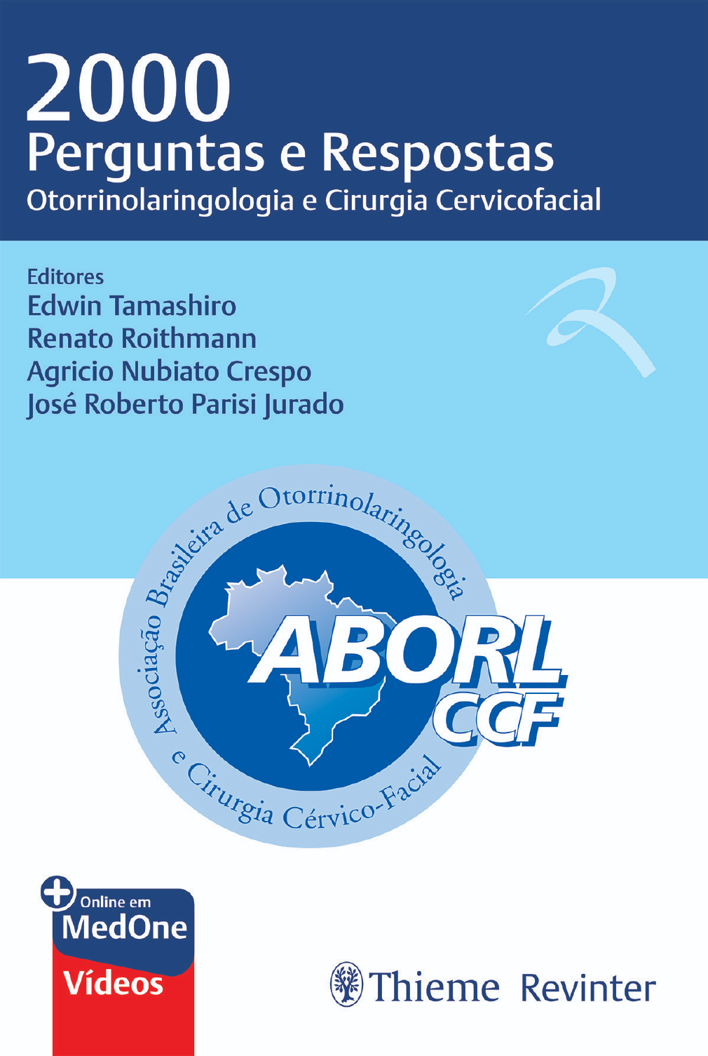 Dados Internacionais de Catalogação na Publicação (CIP) de acordo com ISBD T153 Tamashiro, Edwin. 2000 Perguntas e Respostas: Otorrinolaringologia e Cirurgia Cervicofacial/Edwin Tamashiro, Renato Roithmann, Agricio Nubiato Crespo; et al. – Rio de Janeiro: Thieme Revinter Publicações Ltda, 2022. 772 p., il.; 18,5 x 27 cm Inclui bibliografia ISBN 978-65-5572-144-7 eISBN 978-65-5572-145-4 1. Medicina e saúde 2. Otorrinolaringologia. 3. Preparatório. I. Roithmann, Renato. II. Nubiato, Agricio Crespo. III. Jurado, José Roberto Parisi. IV. Título. CDD: 616.8 CDU: 616.21 Nota: O conhecimento médico está em constante evolução. À medida que a pesquisa e a experiência clínica ampliam o nosso saber, pode ser necessário alterar os métodos de tratamento e medicação. Os autores e editores deste material consultaram fontes tidas como confiáveis, a fim de fornecer informações completas e de acordo com os padrões aceitos no momento da publicação. No entanto, em vista da possibilidade de erro humano por parte dos autores, dos editores ou da casa editorial que traz à luz este trabalho, ou ainda de alterações no conhecimento médico, nem os autores, nem os editores, nem a casa editorial, nem qualquer outra parte que se tenha envolvido na elaboração deste material garantem que as informações aqui contidas sejam totalmente precisas ou completas; tampouco se responsabilizam por quaisquer erros ou omissões ou pelos resultados obtidos em consequência do uso de tais informações. É aconselhável que os leitores confirmem em outras fontes as informações aqui contidas. Sugere-se, por exemplo, que verifiquem a bula de cada medicamento que pretendam administrar, a fim de certificar-se de que as informações contidas nesta publicação são precisas e de que não houve mudanças na dose recomendada ou nas contraindicações. Esta recomendação é especialmente importante no caso de medicamentos novos ou pouco utilizados. Alguns dos nomes de produtos, patentes e design a que nos referimos neste livro são, na verdade, marcas registradas ou nomes protegidos pela legislação referente à propriedade intelectual, ainda que nem sempre o texto faça menção específica a esse fato. Portanto, a ocorrência de um nome sem a designação de sua propriedade não deve ser interpretada como uma indicação, por parte da editora, de que ele se encontra em domínio público. Elaborada por Bibliotecária Janaina Ramos – CRB-8/9166 Contato com os autores: revista@aborlccf.org.br © 2022 Associação Brasileira de Otorrinolaringologia e Cirurgia Cérvico-Facial – ABORL-CCF Todos os direitos reservados. Thieme Revinter Publicações Ltda. Rua do Matoso, 170 Rio de Janeiro, RJ CEP 20270-135, Brasil http://www.ThiemeRevinter.com.br Thieme USA http://www.thieme.com Design de Capa: Thieme Revinter Impresso no Brasil por BMF Gráfica e Editora Ltda. 5 4 3 2 1 ISBN 978-65-5572-144-7 Também disponível como eBook: eISBN 978-65-5572-145-4 Todos os direitos reservados. Nenhuma parte desta publicação poderá ser reproduzida ou transmitida por nenhum meio, impresso, eletrônico ou mecânico, incluindo fotocópia, gravação ou qualquer outro tipo de sistema de armazenamento e transmissão de informação, sem prévia autorização por escrito. A contínua e exponencial evolução na medicina tem trazido enormes desafios na formação, capacitação e atualização desses profissionais. Nas últimas décadas, a Otorrinolaringologia e a Cirurgia Cervicofacial têm apresentado uma notável ampliação do conhecimento científico, incorporação de novas tecnologias e modernização das práticas clínicas e cirúrgicas. Com a finalidade de atuar como uma ferramenta facilitadora na formação e atualização na área, esta edição de 2000 Questões em Otorrinolaringologia e Cirurgia Cervicofacial traz uma parte do conhecimento contemporâneo, englobando desde aspectos teóricos consolidados até as práticas atuais. A educação médica realizada por meio de pequenos desafios escritos, representados neste livro por questões objetivas e de múltipla escolha, certamente é um método valioso de ensino e que complementa as demais competências necessárias aos médicos e médicas de nossa especialidade. Nesta edição trouxemos uma grande novidade para discutirmos algumas das questões mais relevantes: a incorporação de vídeos de curta duração (ou verdadeiras miniaulas), acessadas por QR code para melhor explanação da questão apresentada. Graças aos esforços e expertise de todos os coordenadores e autores desta obra, envolvendo 210 colaboradores, conseguimos atingir o grande desafio de elaborar 2.000 questões objetivas e de alta qualidade. Deixamos aqui os nossos especiais agradecimentos a todos os envolvidos na elaboração deste livro, cujo interesse único e exclusivo foi o de promover a Educação Médica Continuada e elevar as boas práticas de nossa especialidade! Uma boa leitura a todos! Edwin Tamashiro Renato Roithmann ADRIANA HACHIYA Médica Assistente do Hospital das Clínicas da Faculdade de Medicina da Universidade de São Paulo (HCFMUSP) Doutora em Medicina pela FMUSP ALI MAHMOUD Médico e Otorrinolaringologista pela Faculdade de Medicina da Universidade de São Paulo (FMUSP) Fellowship em Faringolaringologia pelo Hospital das Clínicas da FMUSP Médico Assistente e Chefe do Ambulatório de Estomatologia da Divisão de Clínica Otorrinolaringológica do Hospital das Clínicas da FMUSP ANDREIA ARDEVINO DE OLIVEIRA Médica Assistente do Departamento de Oftalmologia, Otorrinolaringologia e Cirurgia de Cabeça e Pescoço da Faculdade de Medicina de Ribeirão Preto da Universidade de São Paulo (USP) Docente da Disciplina de Otorrinolaringologia da Faculdade de Medicina do Centro Universitário Estácio de Ribeirão Preto, SP Mestre e Doutor pela USP BIANCA MARIA LIQUIDATO Doutora em Otorrinolaringologia pela FCM da Santa Casa de São Paulo Professora Assistente do Departamento de