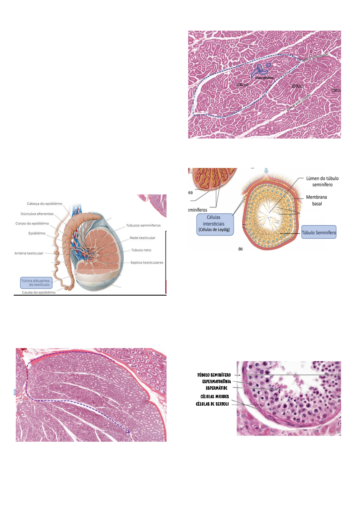 Histologia Testículos As duas principais funções são: Espermatogênese: Produção de espermatozoide Esteroidogênese: Síntese de andrógenos ● Túnica albugínea Cápsula de tecido conjuntivo denso muito espesso há Septos de tecido conjuntivo incompletos, que se projetam a partir da cápsula e isso dividi o testiculo em aproximadamente 250 lóbulos Cada lóbulo do testiculo consiste em um a quatro túbulos seminíferos + estroma de tecido conjuntivo(com células de Leydig) em azul é os túbulos seminíferos Túbulo Seminífero O epitélio seminífero é um epitélio estratificado complexo e incomum, formado por duas populações básicas de células: a) Células de Sertoli b) Células espermatogênicas c) Células mioides* (Lâmina basal) a) Células de Sertoli Células colunares, com extensos prolongamentos apicais e laterais que circundam as células espermatogênicas adjacentes células de suporte ou de sustentação As células de Sertoli estão ligadas entre si por uma zônula de oclusão extremamente firme que cria uma barreira de permeabilidade(Barreira Hematotesticular) e divide o epitélio seminífero em compartimentos basal e luminal A Barreira Hematotesticular: Impede que células imunes cheguem e reconheçam espermatozoides como agentes estranhos Compartimento basal: espermatogônias e os espermatócitos primários imaturos Compartimento luminal: espermatócitos mais maduros e as espermátides b) Células espermatogênicas As células espermatogênicas em diferenciação estão dispostas em tipos celulares específicos são agrupados entre si. Espermatozóide maduro, solta da parede do túbulo seminífero c) Células Mióides (lâmina basal) Características associadas às células musculares lisas(células contráteis) onde criam ondas peristálIcas que ajudam a mover os espermatozóides e o líquido testicular através dos túbulos seminíferos até o sistema de ductos excretores. ● Células de Leydig Células poligonais dispersas ou em grupos, presentes no tecido conjuntIvo, entre os túbulos seminíferos Responsáveis pela produção da testosterona ● Túbulos Retos Primeira metade: apenas células de Sertoli Próximo ao seu término: ficam estreitos, e o seu revestimento muda para um epitélio simples cuboide com curtos microvilos abaulados e um único flagelo. ● Rede Testicular Os canais da rede testicular são revestidos por um epitélio simples cuboide com um único cílio apical e uma quantidade relativamente pequena de microvilosidades apicais curtas semelhantes às dos túbulos retos ● Ductos Eferentes Revestidos por epitélio pseudoestratificado colunar com células altas e células baixas As células colunares altas são ciliadas As células baixas não ciliadas mas com vilosidades São rodeados por uma camada de músculo liso, que auxilia o transporte dos espermatozóides nos ductos Epidídimo O epidídimo é dividido em cabeça, corpo (ductos eferentes) e cauda (ducto do epidídimo/ local de amadurecimento dos espermatozóides) Revestido por um epitélio pseudoestratificado colunar contendo dois tipos de células: a) Células Principais Células colunares, com numerosas estereocílios de diferentes comprimentos Ajudam na maturação dos espermatozóides (secretando glicerofosfocolina e ácido siálico) b) Células basais Pequenas células esféricas que repousam sobre a lâmina basal São as células-tronco do epitélio ductal Cabeça e corpo: Uma fina camada de músculo liso com disposição circular Cauda: são acrescentadas camadas longitudinais interna e externa. O epidídimo é o principal reservatório para os espermatozoides maduros, que são forçados para dentro do ducto deferente por intensas contrações das três camadas de músculo liso após estimulação neural associada à ejaculação. Idade reprodutiva acima e após embaixo Ducto Deferente É parte mais longa do sistema de ductos excretores É uma continuação direta da cauda do epidídimo Revestido por epitélio pseudoestratificado colunar igual ao epidídimo células colunares altas com estereocílios células basais arredondadas sobre a lâmina basal No entanto, diferentemente do epidídimo, o lúmen do ducto não aparece liso, ele tem pregas longitudinais devido ao espesso revestImento muscular Vesícula seminal São glândulas tubulares muito pregueadas, alongadas e pareadas Secretam um fluido viscoso que constitui cerca de 70% do ejaculado. Possuem epitélio pseudoestratificado colunar contém células colunares altas não ciliadas e pequenas células esféricas que repousam sobre a lâmina basal. Envolvido por células musculares lisas dispostas em uma camada circular interna e uma camada longitudinal externa Próstata Tem como função secretar um líquido claro e ligeiramente alcalino (pH 7,29), que contribui para a formação do líquido seminal Aglomerado de 30 a 50 glândulas tubuloalveolares compostas individuais: ● Glândulas da mucosa (menores) ● Glândulas da submucosa (médias) ● Glândulas principais (maiores e mais numerosas) O parênquima prostático adulto é dividido em quatro zonas anatômica e clinicamente distintas: a) Zona Central A circunda os ductos ejaculatórios que atravessam a próstata. Células comum citoplasma mais proeminente e ligeiramente basófilo e núcleos maiores, deslocados em diferentes níveis nas células adjacentes b) Zona periférica Compreende 70% do tecido glandular da próstata De onde se origina a maioria dos carcinomas da próstata. Pode ser palpada durante o exame de toque retal e também é mais suscetível à inflamação c) Zona de transição Circunda a parte prostática da uretra Compreende cerca de 5% do tecido glandular prostático e contém as glândulas mucosas Nos indivíduos idosos, as células sofrem divisão extensa (hiperplasia) e formam nódulos de células epiteliais. Devido a sua proximidade com a uretra, esses nódulos causar dificuldade na micção. d) Zona periuretral Contém glândulas mucosas e