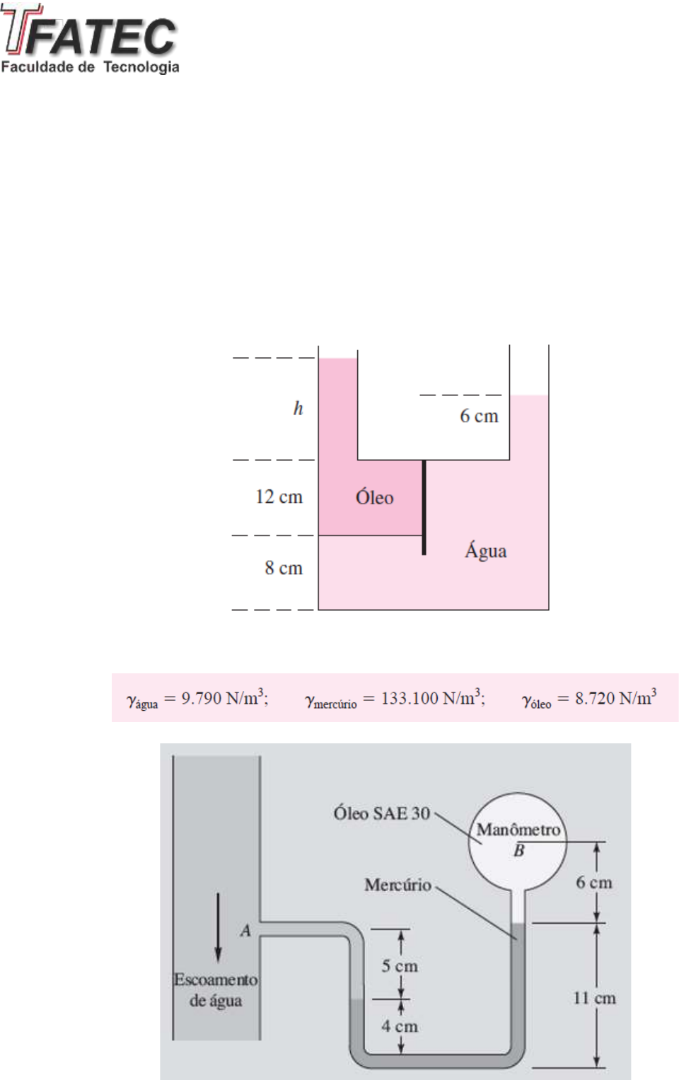 Mecânica dos Fluidos Lista de exercícios 1 Prof. Pedro Augusto Fernandes Pereira 1. Na Figura P2.12 o tanque contém água e óleo imiscíveis a 20°C. Qual é o valor de h em cm se a massa específica do óleo é de 898 kg/m3? (h = 8 cm) 2. O manômetro B serve para medir a pressão no ponto A em um escoamento de água. Se a pressão em B for de 87 kPa, calcule a pressão em A em kPa. Considere que todos os fluidos estejam a 20° C. Veja a Figura (PA = 96,4 kPa) 3. O Na Figura, a comporta de cobertura AB fecha uma abertura circular de 80 cm de diâmetro. A comporta é mantida fechada por uma massa de 200 kg como mostra a figura. Suponha a gravidade padrão a 20°C. Em que nível h da água a comporta será deslocada? Despreze o peso da comporta. (h = 0,40 m) 4. Uma esfera maciça e homogênea, de massa específica igual a 2,4 g/cm3, flutua mantendo 20% do seu volume acima da superfície livre de um líquido. Qual a massa específica desse líquido, em g/cm3 ? (3,0 g/cm3)