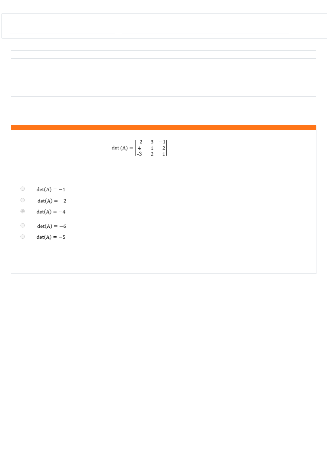Iniciado em sexta, 10 mai 2024, 13:31 Estado Finalizada Concluída em sexta, 10 mai 2024, 13:59 Tempo empregado 27 minutos 31 segundos Avaliar 0,50 de um máximo de 0,50(100%) Questão 1 Completo Atingiu 0,05 de 0,05 Calcular o valor do seguinte determinante: utilizar o método de sarrus. a. b. c. d. e. Sua resposta está correta. Painel / Minhas Disciplinas / BACHARELADO EM ENGENHARIA DE PRODUÇÃO-disc. 18- GEOMETRIA ANALÍTICA E ÁLGEBRA LINEAR E VETORIAL / ATIVIDADE DE ESTUDO 02 - VALOR 0,5 PONTOS / CLIQUE AQUI PARA REALIZAR A ATIVIDADE DE ESTUDO 02 - ATÉ 22/05/2024 https://www.eadunifatecie.com.br/course/view.php?id=35933 https://www.eadunifatecie.com.br/my/ https://www.eadunifatecie.com.br/course/view.php?id=35933 https://www.eadunifatecie.com.br/course/view.php?id=35933#section-7 https://www.eadunifatecie.com.br/mod/quiz/view.php?id=1187630 Questão 2 Completo Atingiu 0,05 de 0,05 Questão 3 Completo Atingiu 0,05 de 0,05 Qual das matrizes abaixo caracteriza uma matriz quadrada? a. b. c. d. e. Sua resposta está correta. Dada a equação do hiperboloide de uma folha determine o raio do círculo no plano z=3. a. b. c. 8 d. 2 e. Sua resposta está correta. Questão 4 Completo Atingiu 0,05 de 0,05 Questão 5 Completo Atingiu 0,05 de 0,05 Qual das equações abaixo representa um paraboloide hiperbólico? a. b. c. d. e. Sua resposta está correta. Qual das equações abaixo representa um hiperboloide de uma folha? a. b. c. d. e. Sua resposta está correta. Questão 6 Completo Atingiu 0,05 de 0,05 Questão 7 Completo Atingiu 0,05 de 0,05 Qual dos elementos abaixo configura uma quádrica? a. Reta. b. Quadrado. c. Círculo. d. Triângulo. e. Elipsoide. Sua resposta está correta. Qual das equações abaixo representa um hiperboloide de duas folhas? a. b. c. d. e. Sua resposta está correta. Questão 8 Completo Atingiu 0,05 de 0,05 Questão 9 Completo Atingiu 0,05 de 0,05 Determinar os valores de k para que o sistema de equações seja impossível: a. 2 e 3. b. 2 e 1. c. 3 e -3. d. 2 e -3. e. 1 e -3. Sua resposta está correta. Calcular o determinante da matriz considerando que a mesma é de Vandermonde. a. b. c. d. e. Sua resposta está correta. Questão 10 Completo Atingiu 0,05 de 0,05 Determine o valor do determinante da matriz a. b. c. d. e. Sua resposta está correta. ◄ ÁUDIO AULA 08 Seguir para... CLIQUE AQUI PARA REALIZAR O FÓRUM DA DISCIPLINA ► https://www.eadunifatecie.com.br/mod/url/view.php?id=1187629&forceview=1 https://www.eadunifatecie.com.br/mod/forum/view.php?id=1187631&forceview=1
