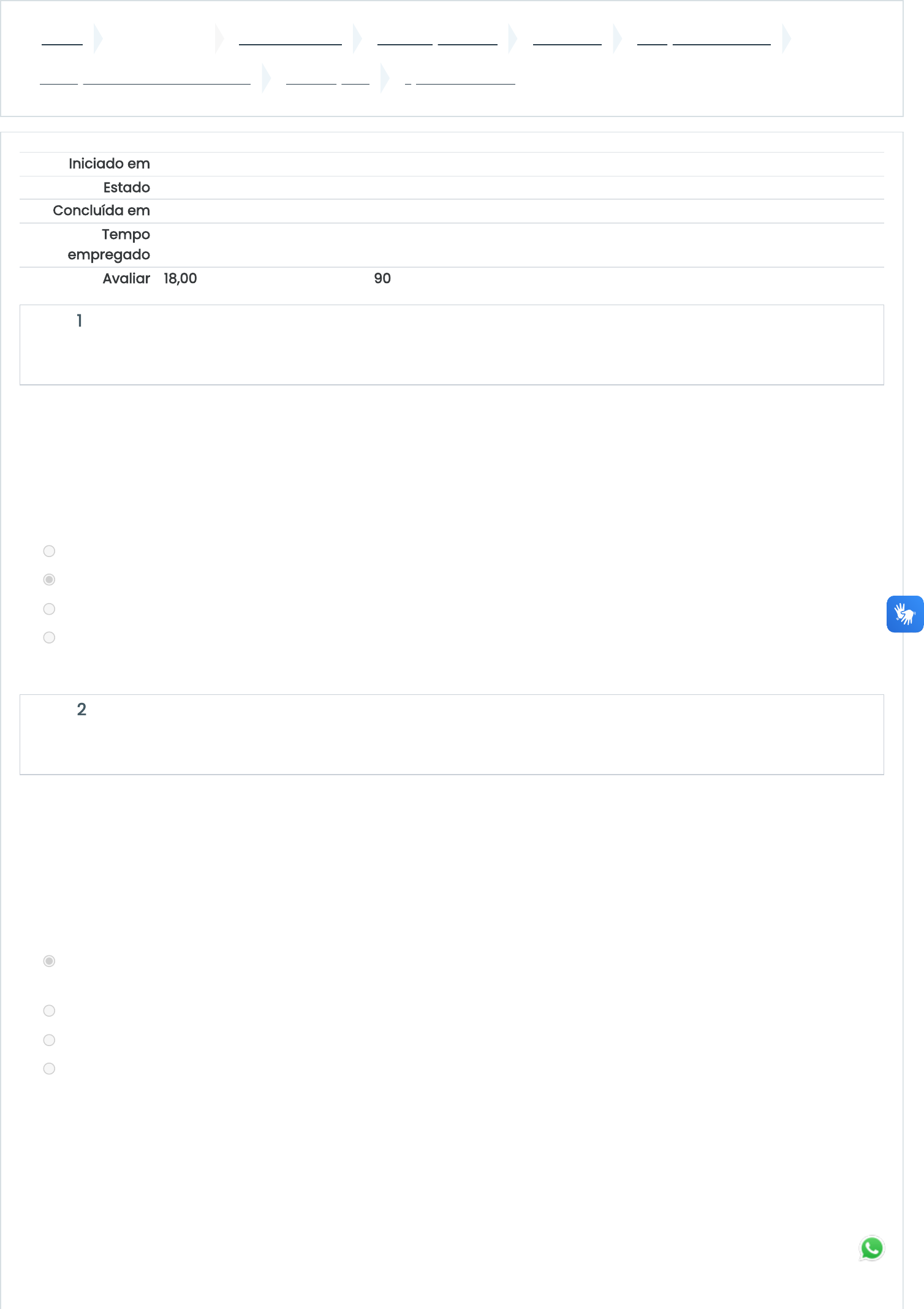 Painel Meus cursos CURSOS FUNEC Graduação - EAD Aluno EAD JUNÇÕES DE TURMA Proteção de Sistemas Elétricos AVALIAÇÕES QUESTIONÁRIO 2 Iniciado em Saturday, 8 Jun 2024, 21:53 Estado Finalizada Concluída em Saturday, 8 Jun 2024, 22:05 Tempo empregado 11 minutos 54 segundos Avaliar 18,00 de um máximo de 20,00(90%) Questão 1 Completo Atingiu 2,00 de 2,00 Questão 2 Completo Atingiu 2,00 de 2,00 Quais são as curvas características de tempo versus corrente encontradas nos relés direcionais de sobrecorrente de neutro? Escolha uma opção: a. Curva de tempo, curva de sobrecorrente e curva de selo. b. Curva inversa, muito inversa e extremamente inversa. c. Curva direcional, curva de ação instantânea e curva de proteção de neutro. d. Curva de ajuste, curva de conexão e curva de polarização. Por que é necessário utilizar relés de sobrecorrente temporizados com capacidade de identificar o sentido da corrente ou potência em redes de distribuição ou linhas de transmissão alimentadas pelas duas extremidades ou com configuração em anel? Escolha uma opção: a. Para permitir a proteção seletiva e desligar o disjuntor caso a corrente ou potência esteja fluindo em sentido contrário ao normal. b. Para detectar correntes de magnetização do transformador durante sua energização. c. Para evitar a saturação dos transformadores de corrente em diferentes níveis. d. Para evitar operações intempestivas do sistema. https://ava.funec.br/my/ https://ava.funec.br/course/index.php?categoryid=10 https://ava.funec.br/course/index.php?categoryid=17 https://ava.funec.br/course/index.php?categoryid=19 https://ava.funec.br/course/index.php?categoryid=77 https://ava.funec.br/course/view.php?id=2018 https://ava.funec.br/course/view.php?id=2018#section-6 https://ava.funec.br/mod/quiz/view.php?id=25329 Questão 3 Completo Atingiu 2,00 de 2,00 Questão 4 Completo Atingiu 2,00 de 2,00 Questão 5 Completo Atingiu 2,00 de 2,00 Qual é a função da proteção com relé direcional de potência em um sistema elétrico? Escolha uma opção: a. Reconhecer o sentido do fluxo de potência em determinado momento. b. Limitar o fluxo de potência em um determinado sentido. c. Todas as opções anteriores estão corretas. d. Detectar a presença de fluxo de potência reversa. Como os relés direcionais de sobrecorrente de neutro podem ser polarizados? Escolha uma opção: a. Por tensão ou corrente. b. Por tensão. c. Por frequência ou resistência. d. Por corrente. Quais são os relés necessários para constituir uma proteção contra falha do disjuntor? São unidades que proporcionam proteção primária e apoio perante a falha de atuação do disjuntor. Além disso, detectam a existência de arco interno ao disjuntor, evitando que o disjuntor sofra danos irreparáveis e acidentes pessoais. Escolha uma opção: a. Relé de distância e relé de frequência (27/81) b. Relé de sobrecorrente instantâneo (50) e relé temporizador (62BF) c. Relé de proteção diferencial e relé de sincronismo (87/25) d. Relé direcional e relé de sobretensão (67/59) Questão 6 Completo Atingiu 2,00 de 2,00 Questão 7 Completo Atingiu 2,00 de 2,00 Questão 8 Completo Atingiu 0,00 de 2,00 Qual das seguintes afirmações descreve corretamente a proteção diferencial compensada? Escolha uma opção: a. A proteção diferencial compensada compara as correntes que circulam nos dois pontos do sistema, como transformador, gerador ou motor. b. A proteção diferencial compensada é aplicada na proteção de barramento, comparando as correntes que circulam nos dois pontos do sistema. c. A proteção diferencial compensada é aquela que compara os módulos de corrente entre dois terminais de um sistema elétrico e as direções em que essas correntes circulam. d. A proteção diferencial compensada é aquela em que as correntes que circulam nos terminais do equipamento que se quer proteger devem ser rigorosamente iguais, caso contrário, o relé atuará intempestivamente. Qual é a corrente necessária para ativar a unidade temporizada de sobrecorrente nos relés direcionais de sobrecorrente de neutro? Escolha uma opção: a. Cerca de 20% do valor da corrente de ajuste. b. Cerca de 5% do valor da corrente de ajuste. c. Igual ao valor da corrente de ajuste. d. Cerca de 10% do valor da corrente de ajuste. Qual é a função da proteção diferencial direcional em um sistema elétrico composto por duas ou mais linhas de transmissão operando em paralelo? Escolha uma opção: a. Proteger os transformadores, geradores ou motores por meio da comparação direta das correntes que circulam nos dois pontos do sistema. b. Corrigir as diferenças de corrente nos terminais do equipamento protegido, evitando desligamentos desnecessários. c. Comparar os módulos de corrente entre dois terminais do sistema e as direções em que essas correntes circulam. d. Detectar e isolar falhas, garantindo a segurança e a continuidade do fornecimento de energia, evitando o desligamento de linhas saudáveis e minimizando o impacto de possíveis problemas no sistema. Questão 9 Completo Atingiu 2,00 de 2,00 Questão 10 Completo Atingiu 2,00 de 2,00 Quais são os tipos de relés direcionais? Escolha uma opção: a. Relé direcional de sobrecorrente de fase, relé direcional de sobrecorrente de terra e relé direcional de potência. b. Relé direcional de corrente alternada, relé direcional de corrente contínua e relé direcional de potência reativa. c. Relé direcional de sobretensão, relé direcional de sobrecorrente e relé direcional de potência. d. Relé direcional de sobrecarga, relé direcional de falta e relé direcional de potência. Qual das seguintes afirmações descreve corretamente a proteção diferencial direcional? Escolha uma opção: a. A proteção diferencial direcional é aplicada na proteção de barramento, comparando as correntes que circulam nos dois pontos do sistema. b. A proteção diferencial direcional compara os m