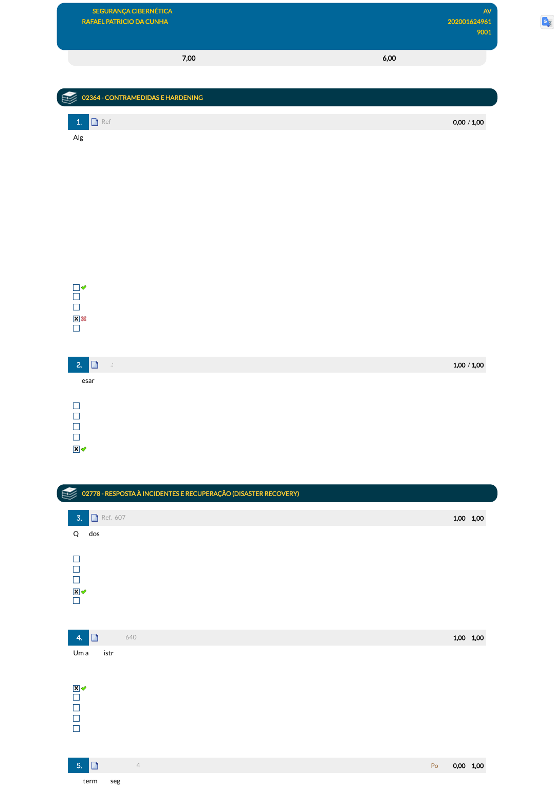 09/06/2024, 09:55 EPS https://simulado.estacio.br/alunos/ 1/3 Disciplina: SEGURANÇA CIBERNÉTICA AV Aluno: RAFAEL PATRICIO DA CUNHA 202001624961 Turma: 9001 ARA2074_AV_202001624961 (AG) 07/06/2023 22:08:49 (F) Avaliação: 7,00 pts Nota SIA: 6,00 pts 02364 - CONTRAMEDIDAS E HARDENING 1. Ref.: 6075329 Pontos: 0,00 / 1,00 Algoritmos criptológicos simétricos são conhecidos da humanidade desde os tempos mais primórdios, e na segunda guerra mundial a máquina ENIGMA �cou conhecida por ter sido usada pelos alemães para as comunicações sigilosas estratégicas. Já a criptogra�a simétrica passou a ser conhecida da década de 70 em diante. Sobre a criptologia e seu uso atual, avalie as assertivas a seguir e a relação entre elas: I - A principal fragilidade da criptogra�a simétrica é resolvida com a substituição pela criptogra�a assimétrica. PORQUE II - A criptogra�a assimétrica oferece mecanismos para troca segura de chaves sem a demanda de contato direto entre os pares de uma comunicação privada. A respeito dessas assertivas, assinale a opção correta: A assertiva I é uma proposição falsa, mas II é uma proposição verdadeira. As assertivas I e II são proposições falsas. A assertiva I é uma proposição verdadeira, mas II é uma proposição falsa. As assertivas I e II são proposições verdadeiras, e a II é uma justi�cativa correta para a I. As assertivas I e II são proposições verdadeiras, mas II não é uma justi�cativa correta para a I. 2. Ref.: 6075127 Pontos: 1,00 / 1,00 Apesar de pouco utilizado em ataques, o UDP pode ser usado para negação de serviço com e�cácia. Isso se deve ao uso re�exivo de outros protocolos, que geram respostas grandes direcionadas a um alvo que não as solicitou. Essa técnica é denominada de efeito: REFLEXIVO INTENSIFICADOR DISTRIBUÍDO PARALISANTE AMPLIFICADOR 02778 - RESPOSTA À INCIDENTES E RECUPERAÇÃO (DISASTER RECOVERY) 3. Ref.: 6076154 Pontos: 1,00 / 1,00 Qual dos seguintes tipos de teste utiliza um processo automatizado de identi�cação proativa de vulnerabilidades conhecidas nos sistemas de computação presentes em uma rede? Auditoria de segurança Teste de caixa-branca Teste de caixa-preta Varredura de vulnerabilidade Teste de estresse 4. Ref.: 6076402 Pontos: 1,00 / 1,00 Um administrador foi instruído a introduzir um sistema afetado de volta no ambiente da organização e certi�car-se de que isso não levará a outro incidente. Ele deve testar, monitorar e validar se o sistema não está sendo comprometido por nenhum outro meio. Qual dos processos de resposta a incidentes você concluiu? Recuperação Contenção Pós-incidente Correção de Vulnerabilidade Preparação 5. Ref.: 6076404 Pontos: 0,00 / 1,00 Os termos a seguir são etapas do processo de resposta a incidentes. Marque a opção que representa a ordem cronológica correta destas etapas. javascript:alert('C%C3%B3digo da quest%C3%A3o: 6075329.'); javascript:alert('C%C3%B3digo da quest%C3%A3o: 6075329.'); javascript:alert('C%C3%B3digo da quest%C3%A3o: 6075127.'); javascript:alert('C%C3%B3digo da quest%C3%A3o: 6075127.'); javascript:alert('C%C3%B3digo da quest%C3%A3o: 6076154.'); javascript:alert('C%C3%B3digo da quest%C3%A3o: 6076154.'); javascript:alert('C%C3%B3digo da quest%C3%A3o: 6076402.'); javascript:alert('C%C3%B3digo da quest%C3%A3o: 6076402.'); javascript:alert('C%C3%B3digo da quest%C3%A3o: 6076404.'); javascript:alert('C%C3%B3digo da quest%C3%A3o: 6076404.'); 09/06/2024, 09:55 EPS https://simulado.estacio.br/alunos/ 2/3 I - Preparação; II - Contenção, erradicação e recuperação; III - Atividade pós-incidente; e IV - Detecção e Análise. I, IV, II, III IV, I, II, III II, I, III, IV I, II, III, IV IV, II, I, III 02849 - VULNERABILIDADES COMUNS DA OPEN WEB APPLICATION SECURITY PROJECT (OWASP) 6. Ref.: 6078917 Pontos: 0,00 / 1,00 Quais dos ataques abaixo comumente acarretam na exposição de dados sensíveis? Ataques de ransomware, Ataques de ameaças internas, Ataques de Quebra de Autenticação. Ataques de força bruta, Ataques de Ransomware, Ataques de Quebra de Autenticação. Ataques de ameaças internas, Ataques de phishing, Ataques de força bruta. Ataque de Injeção de SQL, Ataque Negação de Serviço, Ataques de Phishing. Ataques de Quebra de Autenticação, Ataques de Negação de Serviço, Ataques de força bruta. 7. Ref.: 6079109 Pontos: 1,00 / 1,00 Quando estamos falando da vulnerabilidade de quebra de controle de acesso, existem diversas medidas que podem reduzir a falha. Assinale a alternativa que apresenta uma destas medidas quando estamos falando especi�camente, em aplicações web de Sistemas de Gerenciamento de Conteúdo. Registre eventos relacionados ao cadastro de novos posts em uma instalação do Joomla. Permitir que o administrador do Wordpress realize o acesso com senha padrão ou diretamente em uma instalação de wordpress. Mantenha somente uma conta de administrador em instalação Joomla. Desative os pontos de acesso (páginas de autenticação) até que sejam necessários. Manter a pasta padrão de acesso a página de login de uma instalação de wordpress. 03598 - PRINCÍPIOS E CONCEITOS DE SEGURANÇA CIBERNÉTICA 8. Ref.: 6113766 Pontos: 1,00 / 1,00 Uma empresa está realizando uma análise de riscos referente à segurança de todas as estações de trabalho que possuem um Sistema Operacional especí�co. Foi constatado que uma solução de antivírus seria a mais adequada para impedir a infecção do Sistema Operacional (SO) por malwares, porém, o valor para a aquisição de licenças seria 35% maior que a soma do valor conjunto de hardware e software de todas as estações de trabalho. Diante dessa mensuração de valor da aquisição da solução de antivírus e do valor das estações de trabalho, qual objetivo foi atendido durante essa fase da análise de riscos? Identi�cação dos ativos e seus valores. Estabelecimento do equilíbrio entre o custo de um incidente e de uma