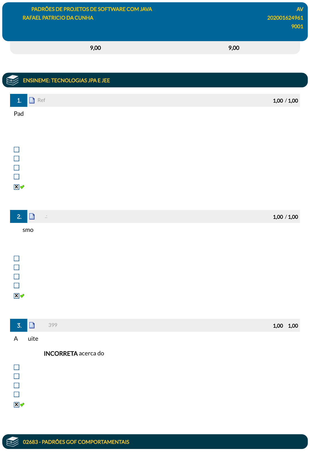 09/06/2024, 09:54 EPS https://simulado.estacio.br/alunos/ 1/3 Disciplina: PADRÕES DE PROJETOS DE SOFTWARE COM JAVA AV Aluno: RAFAEL PATRICIO DA CUNHA 202001624961 Turma: 9001 ARA1392_AV_202001624961 (AG) 18/11/2023 14:52:29 (F) Avaliação: 9,00 pts Nota SIA: 9,00 pts ENSINEME: TECNOLOGIAS JPA E JEE 1. Ref.: 3990967 Pontos: 1,00 / 1,00 Padrões arquiteturais de�nem os componentes estruturais de um sistema, e a forma de comunicação entre eles ou com outros sistemas, organizando as regras gerais para a concepção de aplicativos com algum per�l funcional especí�co. Plataformas de objetos distribuídos, como o CORBA, trabalham em um padrão arquitetural denominado: MVC Event-Driven Pipeline PAC Broker 2. Ref.: 3990963 Pontos: 1,00 / 1,00 Mesmo que as novas tecnologias adotem anotações, no lugar de arquivos XML, para efetuar diversas con�gurações, ainda temos a necessidade de utilizar um arquivo nesse formato, no ambiente do JPA, com a responsabilidade de de�nir parâmetros globais e a conexão com o banco de dados. Qual o nome do arquivo? readme.txt web.xml manifest context.xml persistence.xml 3. Ref.: 3990960 Pontos: 1,00 / 1,00 A arquitetura oferecida pelo JPA modi�cou a forma do Java lidar com os dados, e o conhecimento acerca de suas características é fundamental para todo programador que utilize a plataforma. Assinale a alternativa INCORRETA acerca do JPA: É o mecanismo padrão de ORM do Java. Permite mapear os relacionamentos da base de dados. Precisa de um arquivo de con�guração denominado persistence.xml. Trabalha com código anotado Java. Com a adoção do JPA eliminamos a necessidade do JDBC. 02683 - PADRÕES GOF COMPORTAMENTAIS javascript:alert('C%C3%B3digo da quest%C3%A3o: 3990967.'); javascript:alert('C%C3%B3digo da quest%C3%A3o: 3990967.'); javascript:alert('C%C3%B3digo da quest%C3%A3o: 3990963.'); javascript:alert('C%C3%B3digo da quest%C3%A3o: 3990963.'); javascript:alert('C%C3%B3digo da quest%C3%A3o: 3990960.'); javascript:alert('C%C3%B3digo da quest%C3%A3o: 3990960.'); 09/06/2024, 09:54 EPS https://simulado.estacio.br/alunos/ 2/3 4. Ref.: 6068906 Pontos: 1,00 / 1,00 O padrão Command pode ser utilizado para implementar situações nas quais precisamos desfazer ou refazer as ações realizadas em resposta a um comando do usuário, dando origem a operações conhecidas pelos nomes de undo e redo, respectivamente. Outro padrão pode ser aplicado conjuntamente nessa situação, para permitir salvar o estado anterior ao da execução de cada ação, de modo a possibilitar a sua restauração na execução de uma operação undo. Que padrão é esse? Memento State Observer Visitor Command 5. Ref.: 6068804 Pontos: 1,00 / 1,00 Na implementação desse padrão, cada objeto de uma estrutura hierárquica deve de�nir uma operação Accept, que recebe um objeto de uma classe X como parâmetro. A classe X, por sua vez, implementa uma interface genérica Z, de�nindo uma operação especí�ca de tratamento para cada tipo de objeto que pertença à estrutura hierárquica. Assinale a opção com o nome do padrão cuja estrutura de solução foi descrita no enunciado. State Observer Strategy Template Method Visitor 02684 - PADRÕES GOF DE CRIAÇÃO 6. Ref.: 6041109 Pontos: 0,00 / 1,00 Sobre o padrão Abstract Factory, assinale a alternativa correta: Sua implementação requer a de�nição de uma operação chamada clone em cada fábrica concreta. Seu propósito é abstrair o processo de construção de um objeto complexo formado por vários passos. Uma fábrica pode criar apenas um tipo de produto. Sua implementação pode envolver a aplicação do padrão Factory Method. O construtor de cada fábrica deve ser de�nido como private. 7. Ref.: 6041026 Pontos: 1,00 / 1,00 Você deseja criar um objeto complexo formado por diferentes partes. Para isso, você de�ne uma interface abstrata responsável com operações representando a criação dessas partes, permitindo que as implementações concretas dessa interface criem diferentes representações dessas partes. Qual padrão de projeto você utilizaria nessa situação? Prototype Factory Method Builder Singleton javascript:alert('C%C3%B3digo da quest%C3%A3o: 6068906.'); javascript:alert('C%C3%B3digo da quest%C3%A3o: 6068906.'); javascript:alert('C%C3%B3digo da quest%C3%A3o: 6068804.'); javascript:alert('C%C3%B3digo da quest%C3%A3o: 6068804.'); javascript:alert('C%C3%B3digo da quest%C3%A3o: 6041109.'); javascript:alert('C%C3%B3digo da quest%C3%A3o: 6041109.'); javascript:alert('C%C3%B3digo da quest%C3%A3o: 6041026.'); javascript:alert('C%C3%B3digo da quest%C3%A3o: 6041026.'); 09/06/2024, 09:54 EPS https://simulado.estacio.br/alunos/ 3/3 Abstract Factory 02685 - PADRÕES GOF ESTRUTURAIS 8. Ref.: 6041086 Pontos: 1,00 / 1,00 Serve como alternativa à utilização de subclasses na atribuição de responsabilidades, provendo uma forma mais �exível e dinâmica, por meio da superposição de objetos em que o objeto mais externo adiciona funcionalidades às operações do objeto mais interno. Assinale a alternativa com o nome do padrão que possui esse propósito: Proxy Composite Decorator Bridge Facade 02686 - PADRÕES GRASP 9. Ref.: 6076807 Pontos: 1,00 / 1,00 Assinale a alternativa com o nome do padrão GRASP que recomenda que uma responsabilidade seja atribuída à classe que possua o conhecimento necessário para realizá-la, evitando, assim, a de�nição de classes de negócio somente com operações de acesso, isto é, operações get/set dos seus atributos. Especialista na Informação. Memento. Indireção. Fábrica. Controlador. 10. Ref.: 6076725 Pontos: 1,00 / 1,00 O padrão GoF Proxy consiste em colocarmos entre dois objetos remotos um elemento intermediário que capture a requisição do objeto cliente e a encaminhe pela rede até o objeto destino. Dessa forma, o objeto cliente pode fazer chamadas de operações do objeto destino como se eles estivessem rodando localmente. Qual padrão GRASP está ma