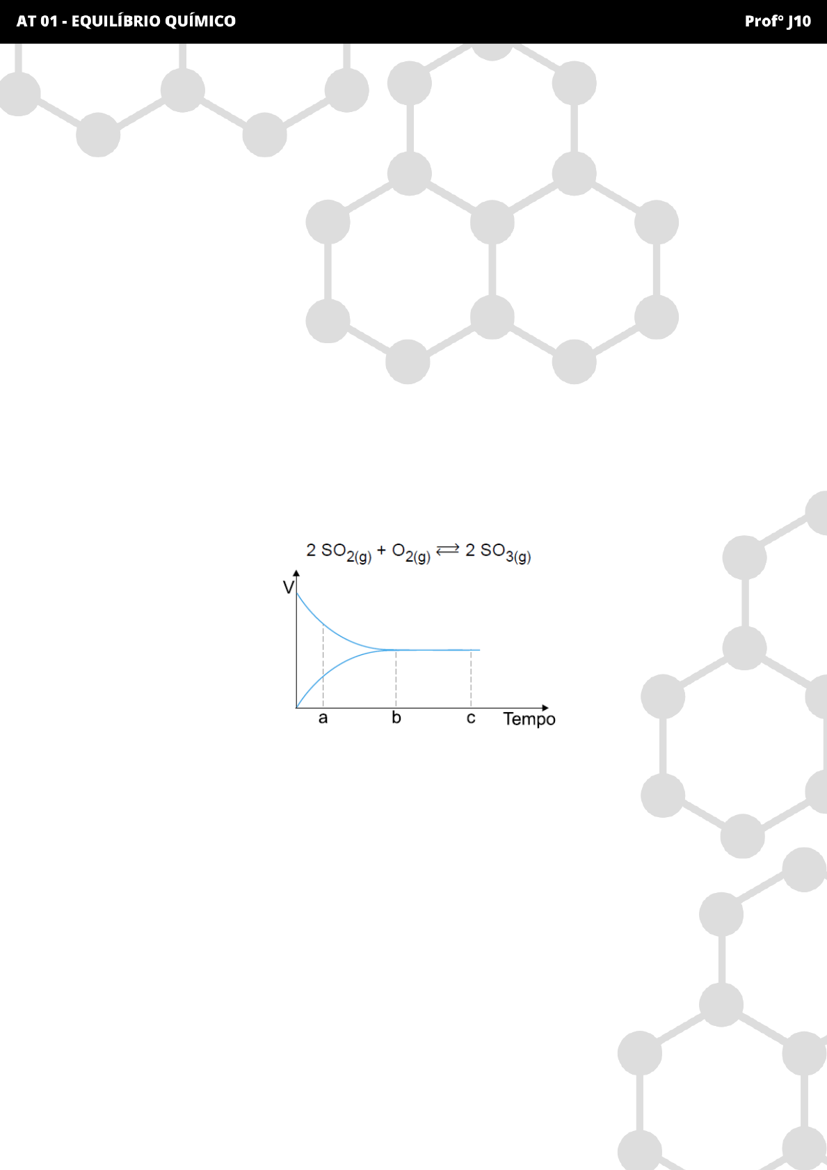 ➊ (UFRGS-RS) Uma reação química atinge o equilíbrio químico quando: a) ocorre simultaneamente nos sentidos direto e inverso. b) as velocidades das reações direta e inversa são iguais. c) os reagentes são totalmente consumidos. d) a temperatura do sistema é igual à do ambiente. e) a razão entre as concentrações de reagentes e produtos é unitária. ➋ (CEFET–PR) Com relação ao equilíbrio químico, afirma-se: I. O equilíbrio químico só pode ser atingido em sistema fechado (onde não há troca de matéria com o meio ambiente). II. Num equilíbrio químico, as propriedades macroscópicas do sistema (concentração, densidade, massa e cor) permanecem constantes. III. Num equilíbrio químico, as propriedades microscópicas do sistema (colisões entre as moléculas, formação de complexos ativados e transformações de umas substâncias em outras) permanecem em evolução, pois o equilíbrio é dinâmico. É (são) correta(s) a(s) afirmação(ões): a) Somente I e II. b) Somente I e III. c) Somente II e III. d) Somente I. e) I, II e III. ➌ (UEMG-MG) O gráfico mostra a variação das velocidades das reações direta e inversa em função do tempo para o processo representado pela equação: Sobre esse processo, todas as afirmativas são corretas, exceto: a) A velocidade da reação direta é maior que a da inversa no tempo “a”. b) No tempo “c”, o sistema é constituído apenas por SO3. c) As duas velocidades são iguais no tempo “c”. d) O equilíbrio é atingido no tempo “b”. ➍ (UFAL-AL) Num sistema em equilíbrio químico, em temperatura constante: ( ) coexistem reagentes e produtos. ( ) há sempre uma única fase envolvida, ou seja, é sempre homogêneo. ( ) existe uma relação constante, apropriadamente calculada, entre as concentrações de reagentes e de produtos. ( ) ocorrem reações químicas opostas, simultâneas, e com mesma rapidez. ( ) há troca de matéria e energia com o ambiente. ➎ (UFES- ES) Considere a reação hipotética A + 2 B → C. O gráfico abaixo representa a variação da concentração de reagentes e produtos em função do tempo à temperatura constante. Baseado no gráfico, pode-se afirmar: a) quando t1 < t < t2, a reação atinge o equilíbrio. b) quando t > t2, a reação atinge o equilíbrio. c) a velocidade inicial de consumo de A é maior que a velocidade inicial de consumo de B. d) a velocidade de formação de C é máxima quando t > t2. e) Quando t está próximo de zero, a relação [C] / [A] · [B]2 é maior que 1. ➏ (UFPE-PE) No início do século XX, a expectativa da Primeira Guerra Mundial gerou uma grande necessidade de compostos nitrogenados. Haber foi o pioneiro na produção de amônia, a partir do nitrogênio do ar. Se a amônia for colocada num recipiente fechado, sua decomposição ocorrerá de acordo com a seguinte equação química não balanceada: NH3(g) → N2(g) + H2(g) As variações das concentrações com o tempo estão ilustradas na figura abaixo. A partir da análise da figura acima, podemos afirmar que as curvas A, B e C representam a variação temporal das concentrações dos seguintes componentes da reação, respectivamente: a) H2, N2 e NH3 b) NH3, H2 e N2 c) NH3, N2 e H2 d) N2, H2 e NH3 e) H2, NH3 e N2