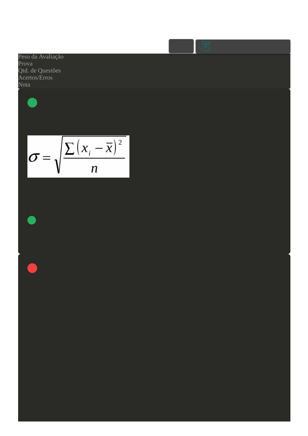 08/04/2024 20:45 Avaliação I - Individual about:blank 1/5 Prova Impressa GABARITO | Avaliação I - Individual (Cod.:955583) Peso da Avaliação 2,00 Prova 78342848 Qtd. de Questões 10 Acertos/Erros 7/3 Nota 7,00 Ao realizar-se uma pesquisa com acadêmicos do Curso de Estatística, foram coletados os dados a seguir, que se referem às idades de um grupo de 5 acadêmicos: 24, 26, 25, 23, 22. Com esses dados, estime a idade média e o desvio-padrão dos acadêmicos desse curso. Assinale a alternativa CORRETA: A Média 26 e desvio-padrão 2,6. B Média 24 e desvio-padrão 2,6. C Média 24 e desvio-padrão 1,6. D Média 26 e desvio-padrão 1,6. O principal objetivo da estatística é fazer inferência a respeito da população com base em um conjunto reduzido de informações, a mostra. A amostragem é essencial para obtermos dados de qualidade, que forneçam boas estimativas dos parâmetros populacionais e inferências confiáveis. Para isso, temos principalmente quatro tipos de amostragem e aplicações. Considerando as características de cada amostragem, associe os itens, utilizando o código a seguir: I- Amostragem Aleatória Simples. II- Amostragem Sistemática. III- Amostragem Estratificada. IV- Amostragem de Conveniência. ( ) Esse tipo de amostragem pode ser utilizada quando se sabe previamente, que a população é composta por subpopulações ou estratos e se presume que esses estratos influenciam a variável em estudo. ( ) Neste tipo de amostragem, todas as unidades amostrais que compõe a população tem igual chance de serem amostradas, estas são selecionadas de forma independente, por meio de sorteio ou até que o tamanho da amostra seja alcançado. ( ) Neste tipo de amostragem, as unidades amostrais não são escolhidas ao acaso, mas por um sistema predefinido, é necessário que as unidades amostrais da população estejam ordenadas de alguma forma, também é necessário estabelecer um critério de intervalo em que as unidades amostrais serão selecionadas para compor a amostra. VOLTAR A+ Alterar modo de visualização 1 2 08/04/2024 20:46 Avaliação I - Individual about:blank 2/5 ( ) Neste caso de amostragem, o pesquisador reúne unidades amostrais simplesmente porque dispõe delas ou porque são unidades de fácil acesso, essa amostragem tem maior propensão em ser tendenciosa, visto nem todas as unidades amostrais tiveram a mesma chance de serem amostradas. Assinale a alternativa que apresenta a sequência CORRETA: A I - II - IV - III. B III - I - IV - II. C III - I - II - IV. D IV - II - I - III. Segundo Crespo (2002), variável é, convencionalmente, o conjunto de resultados possíveis de um fenômeno, sendo que uma variável pode ser qualitativa ou quantitativa. Com relação à classificação de variáveis estatísticas, classifique V para as sentenças verdadeiras e F para as falsas: ( ) A cor de um automóvel é uma variável qualitativa ordinal. ( ) O número de defeitos de um produto é uma variável quantitativa discreta. ( ) A idade de uma pessoa é uma variável quantitativa contínua. ( ) A classificação de uma pessoa em um concurso é uma variável qualitativa nominal. FONTE: CRESPO, A. A. Estatística fácil. 17. ed. São Paulo: Saraiva, 2002. Assinale a alternativa que apresenta a sequência CORRETA A V - F - V - V. B F - F - F - V. C V - V - F - F. D F - V - V - F. A escala nominal é simples e bastante comum nas pesquisas. Sobre esse tipo de escala, classifique V para as sentenças verdadeiras e F para as falsas: ( ) São usadas em registros essencialmente qualitativos. ( ) É possível conseguir o cálculo de médias, porém não conseguimos encontrar o cálculo da moda. ( ) Partido político, credo religioso e questões de dicotomia são exemplos de escala nominal. Assinale a alternativa que apresenta a sequência CORRETA: A F - F - F. B V - F - V. C V - F - F. D F - V - V. Revisar Conteúdo do Livro 3 Revisar Conteúdo do Livro 4 08/04/2024 20:46 Avaliação I - Individual about:blank 3/5 F V V. O gráfico estatístico é um dos recursos mais utilizados quando queremos apresentar um dado estatístico. O objetivo do gráfico estatístico é de produzir no investigador, ou no público, uma impressão mais viva e rápida do fenômeno em estudo. Os principais tipos de gráficos são: diagramas, cartogramas e pictogramas. Analise as sentenças a seguir: I- O gráfico de setores é o gráfico ideal para apresentar séries temporais cíclicas, isto é, séries temporais que apresentam certa periodicidade. II- O cartograma é a representação sobre uma carta geográfica. III- O pictograma é um dos processos gráficos que melhor fala ao público, visto sua forma atraente e sugestiva. Muitas vezes, revistas voltadas ao público jovem se utilizam desse recurso. IV- O gráfico polar é normalmente utilizado nas séries geográficas, ou quando pretendemos apresentar dados relativos em percentuais. Assinale a alternativa CORRETA A As sentenças I e IV estão corretas. B As sentenças I e II estão corretas. C As sentenças II e III estão corretas. D As sentenças III e IV estão corretas. A referência sobre um conjunto de métodos e processos quantitativos que serve para estudar e medir os fenômenos coletivos, diz respeito à matemática aplicada. De que parte da matemática aplicada estamos falando? A Probabilidade estatística. B Dados estatísticos. C Probabilidade de dados. D Estatística. Qual o valor de x na proporção ?Assinale a alternativa CORRETA: A 7. B 6. C 8. D 4. 5 6 7 08/04/2024 20:46 Avaliação I - Individual about:blank 4/5 Em um trabalho de pesquisa, dependendo do tamanho da população a ser estudada, torna-se necessário o uso da técnica de amostragem. Mas é fundamental compreender a diferença entre população e amostra, e como aplicar a técnica. A partir do enunciado apresentado, classifique V para as sentenças verdadeiras e F para as falsas: ( ) O tamanho da população não influencia sobre o tamanho da amostragem. ( ) A 