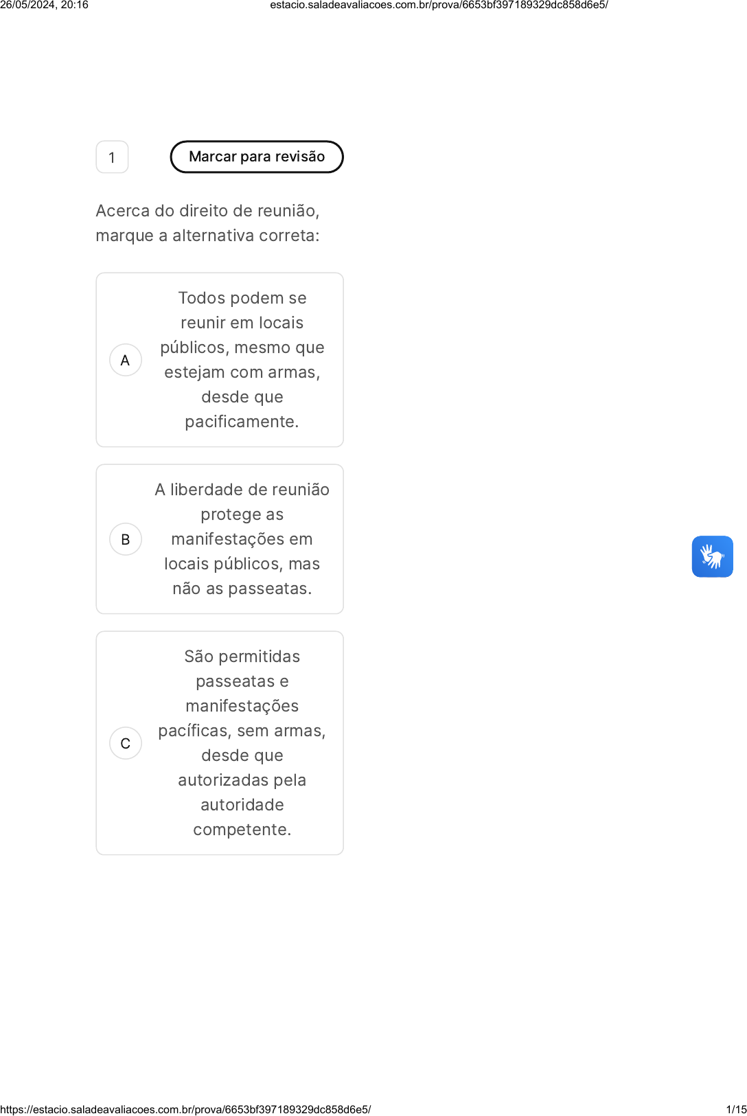 A B C 1 Marcar para revisão Acerca do direito de reunião, marque a alternativa correta: Todos podem se reunir em locais públicos, mesmo que estejam com armas, desde que pacificamente. A liberdade de reunião protege as manifestações em locais públicos, mas não as passeatas. São permitidas passeatas e manifestações pacíficas, sem armas, desde que autorizadas pela autoridade competente. 26/05/2024, 20:16 estacio.saladeavaliacoes.com.br/prova/6653bf397189329dc858d6e5/ https://estacio.saladeavaliacoes.com.br/prova/6653bf397189329dc858d6e5/ 1/15 D E Todos podem reunir- se pacificamente, sem armas, em locais abertos ao público, independentemente de autorização, desde que não frustrem outra reunião anteriormente convocada para o mesmo local. É permitida a reunião em locais públicos, mesmo com armas, desde que haja autorização da autoridade competente. 2 Marcar para revisão �FGV/2021� O grupo "Amigos da Diversidade" decidiu realizar manifestação pacífica na praça mais importante da Cidade Alfa, no último domingo do próximo mês. Após a tomada de decisão, surgiu uma dúvida, no âmbito da liderança, a respeito dos procedimentos a serem adotados. João, integrante do grupo e profundo conhecedor da ordem constitucional, explicou, corretamente, que a manifestação: 26/05/2024, 20:16 estacio.saladeavaliacoes.com.br/prova/6653bf397189329dc858d6e5/ https://estacio.saladeavaliacoes.com.br/prova/6653bf397189329dc858d6e5/ 2/15 A B C é projeção do princípio democrático, não carecendo de prévio aviso a qualquer autoridade pública ou mesmo de autorização. pode ser realizada na praça, desde que o requerimento seja apresentado e deferido pela autoridade competente até trinta dias antes. pode ser livremente realizada, mas em local privado, não na praça, isso sob pena de privar o restante da coletividade da fruição desse espaço. SM2 Ciências Humanas e Sociais 26/05/2024, 20:16 estacio.saladeavaliacoes.com.br/prova/6653bf397189329dc858d6e5/ https://estacio.saladeavaliacoes.com.br/prova/6653bf397189329dc858d6e5/ 3/15 D E não depende de autorização de qualquer órgão público, sendo exigida apenas a realização de prévio aviso à autoridade competente. pode ser realizada na praça, desde que o uso seja autorizado pela autoridade competente, com o correlato pagamento da taxa de uso exclusivo, fixada em valores módicos. 3 Marcar para revisão Para garantir o sucesso da garantia dos Direitos Humanos a todos os integrantes da família humana, foi necessário: 00 hora : 35 min : 04 seg Ocultar Questão 6 de 10 Respondidas �10� Em branco �0� Finalizar prova 1 2 3 4 5 6 7 8 9 10 26/05/2024, 20:16 estacio.saladeavaliacoes.com.br/prova/6653bf397189329dc858d6e5/ https://estacio.saladeavaliacoes.com.br/prova/6653bf397189329dc858d6e5/ 4/15 A B C Criar sistemas de proteção regionais e realizar, constantemente, novas reuniões e tratados para que os direitos se mantenham atualizados. Intimar os países derrotados na Segunda Guerra Mundial para se comprometerem ao cumprimento da Carta; Criar um amplo sistema de fiscalização que esteja presente em todos os países do mundo, usando, inclusive, de espionagem, se preciso for; 26/05/2024, 20:16 estacio.saladeavaliacoes.com.br/prova/6653bf397189329dc858d6e5/ https://estacio.saladeavaliacoes.com.br/prova/6653bf397189329dc858d6e5/ 5/15 D E Intimar países com boas condições financeiras a contribuir com o desenvolvimento econômico de países abaixo da linha da pobreza; É impossível garantir a ação dos Direitos Humanos, afinal eles são um princípio filosófico. 4 Marcar para revisão Sobre a história dos Direitos Humanos, é possível afirmar que: 26/05/2024, 20:16 estacio.saladeavaliacoes.com.br/prova/6653bf397189329dc858d6e5/ https://estacio.saladeavaliacoes.com.br/prova/6653bf397189329dc858d6e5/ 6/15 A B C A discussão sobre Direitos Humanos vem desde a Antiguidade, quando os gregos se reuniam nos templos religiosos para discutir os direitos dos cidadãos; Pouco conhecemos sobre os antigos Direitos Humanos, pois as primeiras sociedades que discutiram o assunto não deixaram registros escritos sobre isso; Não é possível falar sobre uma história dos Direitos Humanos, pois, até a criação das Nações Unidas, não havia uma preocupação sobre o assunto; 26/05/2024, 20:16 estacio.saladeavaliacoes.com.br/prova/6653bf397189329dc858d6e5/ https://estacio.saladeavaliacoes.com.br/prova/6653bf397189329dc858d6e5/ 7/15 D E Ele é uma invenção do pós-Guerra Mundial como resultado das atrocidades nazistas. O Iluminismo foi um movimento fundamental para iniciar a confecção das primeiras declarações, pois já defendiam conceitos como a liberdade e a igualdade. 5 Marcar para revisão A Sociologia é uma ferramenta poderosa que possibilita uma visão _________ da realidade concreta. Ao estudar as relações sociais, essa ciência permite perceber que somos _________ da história, capazes de ações coletivas e transformações no cotidiano. Assim, a Sociologia desafia os indivíduos a entenderem melhor o _________ em que estão inseridos e a influência das relações sociais em suas vidas. Assinale a alternativa que preenche corretamente as lacunas. 26/05/2024, 20:16 estacio.saladeavaliacoes.com.br/prova/6653bf397189329dc858d6e5/ https://estacio.saladeavaliacoes.com.br/prova/6653bf397189329dc858d6e5/ 8/15 A B C D E imparcial, participantes, mundo. objetiva, observadores, ambiente. crítica, atores, cenário. crítica, sujeitos, mundo. analítica, produtores, contexto. 6 Marcar para revisão João, estudante de sociologia, explora a capacidade reflexiva e interpretativa dos indivíduos em sua comunidade, observando como eles atribuem significados a objetos e ações. Considerando o texto, analise as afirmativas abaixo. I. A capacidade reflexiva e interpretativa é inerente apenas a especialistas. II. Os atores sociais atribuem significados a objetos e ações com base em sua própria perspectiva. III. A fenome