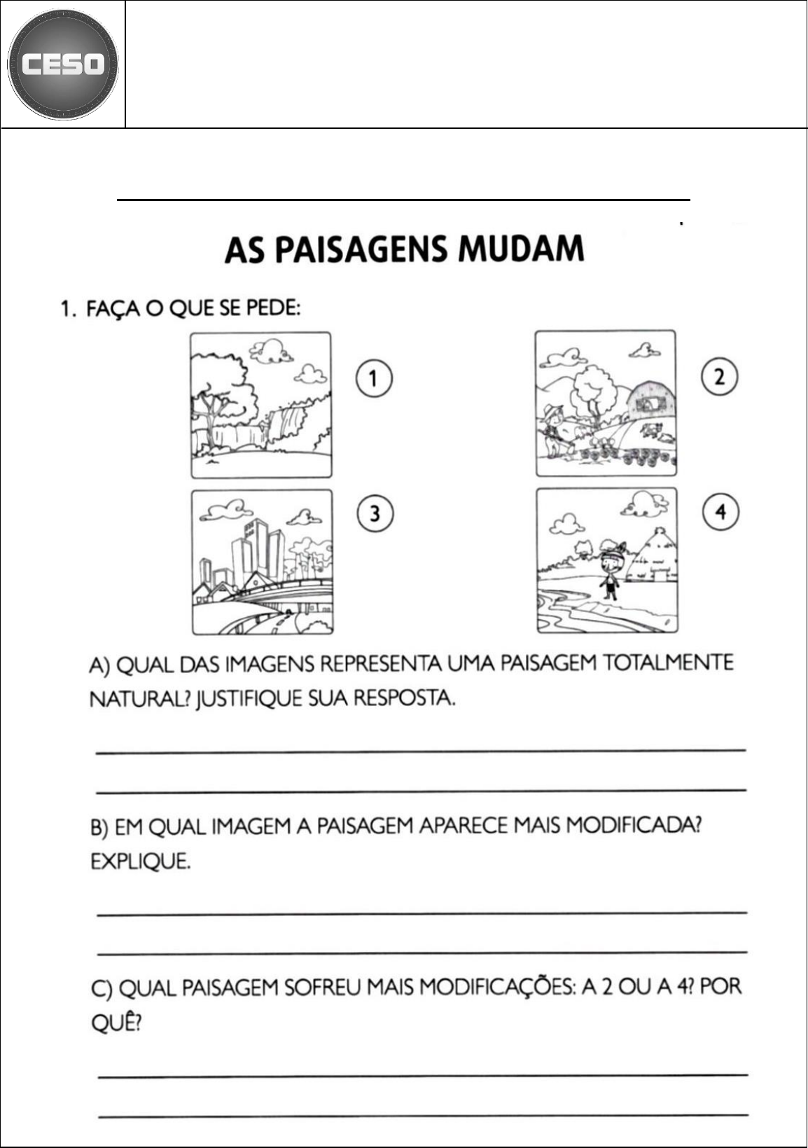CENTRO EDUCACIONAL SILVA OLIVEIRA – CESO Aluno(a):_____________________________________ Data:____/____/_______ Disciplina: Geografia Turma:_________ Professora: Claudia Oliveira Revisão para o 2º simulado (Geografia) 2 - Leia o texto: IR À ESCOLA É MUITO IMPORTANTE PARA AS CRIANÇAS. LÁ, A GENTE APRENDE MUITAS COISAS E TAMBÉM FAZ NOVOS AMIGOS. POIS ELA É O LUGAR ONDE SE ESTUDAM DIFERENTES ASSUNTOS E TAMBÉM CONHECEMOS PESSOAS DIFERENTES, O QUE É MUITO LEGAL! NA ESCOLA, ALÉM DE APRENDER SOBRE MATEMÁTICA, PORTUGUÊS E OUTRAS MATÉRIAS, A GENTE APRENDE A RESPEITAR E A CONVIVER COM OUTRAS PESSOAS. POR ISSO, IR À ESCOLA AJUDA A GENTE A CRESCER E A SE PREPARAR PARA O FUTURO. ➢ Agora, marque com um X a opção correta: A) Por que a escola é importante? ( ) A escola não é importante. ( ) Pois lá a gente estuda diferentes assuntos e também conhecemos gente nova. ( ) Pois na escola podemos fazer o que quisermos. ( ) Pois a escola é cheia de pessoas. B) Complete a frase abaixo com a resposta que você marcou: A escola é importante ____________________________________________________________ _______________________________________________________________________________________________ _______________________________________________________________________________________________ 3) Observe os tipos de visões: Agora, desenha um CARRO na visão: 4) Ligue a imagem ao ponto de vista correspondente: 5) Leia: OBLÍQUA VERTICAL FRONTAL Chama-se de croqui “a representação plana de um espaço a partir da visão vertical”. A) O que é um croqui? _______________________________________________________________________________________ _______________________________________________________________________________________ _______________________________________________________________________________________ B) Vá até o módulo 5 do livro de geografia, leia a página 66, busque a definição de MAQUETE e responda o que é uma maquete de acordo com o seu livro. _______________________________________________________________________________________ _______________________________________________________________________________________ _______________________________________________________________________________________