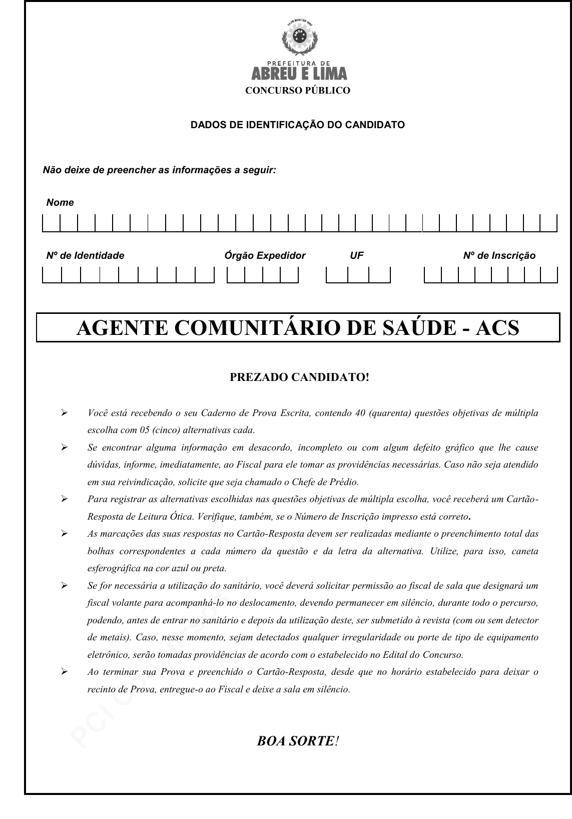 pcimarkpci MjgwNDowNDMxOmM3ZDA6YjMxYjphZWIxOjVlZWE6ZjBmMTphYmFm:U3VuLCAwOSBKdW4gMjAyNCAyMjowOTo0NSAtMDMwMA== www.pciconcursos.com.br CONCURSO PÚBLICO DADOS DE IDENTIFICAÇÃO DO CANDIDATO Não deixe de preencher as informações a seguir: Nome Nº de Identidade Órgão Expedidor UF Nº de Inscrição AGENTE COMUNITÁRIO DE SAÚDE - ACS PREZADO CANDIDATO! Você está recebendo o seu Caderno de Prova Escrita, contendo 40 (quarenta) questões objetivas de múltipla escolha com 05 (cinco) alternativas cada. Se encontrar alguma informação em desacordo, incompleto ou com algum defeito gráfico que lhe cause dúvidas, informe, imediatamente, ao Fiscal para ele tomar as providências necessárias. Caso não seja atendido em sua reivindicação, solicite que seja chamado o Chefe de Prédio. Para registrar as alternativas escolhidas nas questões objetivas de múltipla escolha, você receberá um Cartão- Resposta de Leitura Ótica. Verifique, também, se o Número de Inscrição impresso está correto. As marcações das suas respostas no Cartão-Resposta devem ser realizadas mediante o preenchimento total das bolhas correspondentes a cada número da questão e da letra da alternativa. Utilize, para isso, caneta esferográfica na cor azul ou preta. Se for necessária a utilização do sanitário, você deverá solicitar permissão ao fiscal de sala que designará um fiscal volante para acompanhá-lo no deslocamento, devendo permanecer em silêncio, durante todo o percurso, podendo, antes de entrar no sanitário e depois da utilização deste, ser submetido à revista (com ou sem detector de metais). Caso, nesse momento, sejam detectados qualquer irregularidade ou porte de tipo de equipamento eletrônico, serão tomadas providências de acordo com o estabelecido no Edital do Concurso. Ao terminar sua Prova e preenchido o Cartão-Resposta, desde que no horário estabelecido para deixar o recinto de Prova, entregue-o ao Fiscal e deixe a sala em silêncio. BOA SORTE! pcimarkpci MjgwNDowNDMxOmM3ZDA6YjMxYjphZWIxOjVlZWE6ZjBmMTphYmFm:U3VuLCAwOSBKdW4gMjAyNCAyMjowOTo0NSAtMDMwMA== www.pciconcursos.com.br 2 CONHECIMENTOS DA LÍNGUA PORTUGUESA TEXTO 1 para as questões de 01 a 03. Humanização emerge como necessidade no contexto da civilização técnica As situações “desumanizantes” presentes nas instituições de saúde fazem parte do contexto mais amplo da civilização moderna, segundo alguns autores. Muitos textos, ao longo dos anos, mostram a importância da humanização confrontando-a com o desenvolvimento tecnológico na sociedade atual. Ou seja, considera-se que o desenvolvimento tecnológico vem dificultando as relações humanas, tornando-as frias, objetivas, individualistas e calculistas. “Pela técnica, o homem projeta e realiza coisas impossíveis no campo da física, eletrônica, medicina. Com isso, modifica-se a relação homem- mundo. Torna-se indireta. Deixa de ser concreta e passa a ser um tanto abstrata, pois do cálculo, os aparelhos tomam conta. Daí o risco de o relacionamento homem-homem também tornar-se calculista, de aparelho, de fórmula, frio, pouco humano.” Disponível em: https://www.portaleducacao.com.br/conteudo/artigos/direito/humanizacao-do-atendimento-em-saude/1834 Acesso em: 05/01/2020. 01. De acordo com o texto, A) nas instituições de ensino, são evidentes e transbordantes as situações “desumanizantes”. B) a humanização e a tecnologia caminham em sintonia, nos tempos atuais. C) o avanço na tecnologia prejudica, de certo modo, as relações humanas. D) na atualidade, o relacionamento homem-homem tende a ser mais próximo. E) a técnica dificulta o progresso humano exclusivamente no campo da física. 02. Assinale a alternativa cujo termo sublinhado NÃO obedece à mesma regra de acentuação dos demais termos sublinhados indicados nas outras alternativas. A) “Pela técnica, o homem projeta e realiza coisas impossíveis...” B) “pois o cálculo, os aparelhos tomam conta.” C) “confrontando-a com o desenvolvimento tecnológico na sociedade atual.” D) “de aparelho, de fórmula, frio, pouco humano.” E) “Daí o risco de o relacionamento homem-homem também tornar-se calculista...” 03. Observe o segmento abaixo: “Com isso, modifica-se a relação homem-mundo. Torna-se indireta. Deixa de ser concreta e passa a ser um tanto abstrata, pois o cálculo, os aparelhos tomam conta.” Sobre ele, se o termo “relação” estivesse no plural, o segmento CORRETO está indicado na alternativa A) Com isso, modifica-se as relações homem-mundo. B) Tornam-se indiretos. D) Passam a ser um tanto abstratos. C) Deixam de ser concretas. E) Passam a serem um tanto abstrata. Texto 2 para as questões 04 e 05. Disponível em: https://www.google.com.br/search?q=cora+coralina+sobre+solidariedade&sxsrf Acesso em: 07/01/2020. pcimarkpci MjgwNDowNDMxOmM3ZDA6YjMxYjphZWIxOjVlZWE6ZjBmMTphYmFm:U3VuLCAwOSBKdW4gMjAyNCAyMjowOTo0NSAtMDMwMA== www.pciconcursos.com.br 3 04. Lendo o texto de Cora Coralina, percebe-se que A) ela é uma pessoa passiva diante dos acontecimentos do cotidiano. B) se trata de alguém que carrega consigo um forte sentimento de tristeza. C) ela considera a vida algo estático que demanda muito pouco do ser humano. D) nela existe um forte desejo de lutar sempre; para ela, a luta revela os fortes. E) ela pouco valoriza as pessoas que lutam por dias melhores. 05. Se o Texto 2 tivesse sido escrito por Cora Coralina e outra escritora, o segmento que NÃO apresentaria incorreções está indicado na alternativa A) Temos consciência de sermos autênticas e procuramos superar todos os dias nossa própria personalidade, despedaçando dentro de nós tudo que é velho. B) Temos consciência de sermos autênticos e procuremos superar todos os dias nossa própria personalidade, despedaçando dentro de nós tudo que é velho. C) Temos consciência de ser autênticas e procuramos superar todos os dias nossa própria personalidade, despedaçando dentro de vó