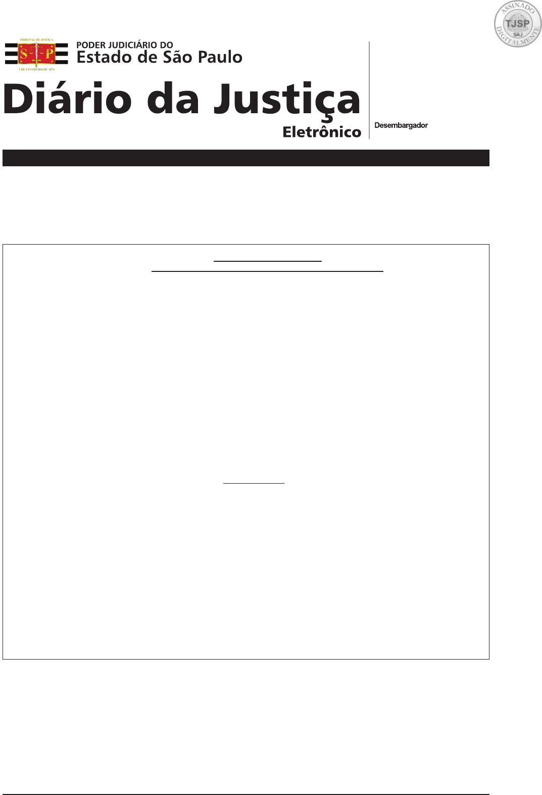 Publicação Oficial do Tribunal de Justiça do Estado de São Paulo - Lei Federal nº 11.419/06, art. 4º Ano XVII • Edição 3982 • São Paulo, sexta-feira, 7 de junho de 2024 www.dje.tjsp.jus.br caderno 1 ADMINISTRATIVO Presidente: Fernando Antonio Torres Garcia TRIBUNAL DE JUSTIÇA SEMA - Secretaria da Magistratura EDITAL DE CONVOCAÇÃO ELEIÇÃO PARA 03 (TRÊS) VAGAS NO ÓRGÃO ESPECIAL O PRESIDENTE DO TRIBUNAL DE JUSTIÇA, Desembargador Fernando Antonio Torres Garcia, com fundamento no artigo 93, XI da Constituição Federal e nos artigos 4º e 10 do RITJSP, bem como nos termos da Resolução CNJ n° 16/2006, convoca os Excelentíssimos Senhores Desembargadores e as Excelentíssimas Senhoras Desembargadoras para eleição de 03 (três) vagas no Órgão Especial deste Tribunal. DA ELEIÇÃO O escrutínio ocorrerá no dia 27 de junho de 2024, das 00:00 às 16:00 horas, e destina-se ao preenchimento de 03 (três) vagas de Desembargador(a) no Órgão Especial, para o biênio compreendido entre 02/07/2024 e 1°/07/2026, sendo: - 02 (duas) na Classe Carreira, decorrentes do término dos mandatos do Desembargador ROBERTO CARUSO COSTABILE E SOLIMENE e da Desembargadora MARCIA REGINA DALLA DÉA BARONE; e - 01 (uma) na Classe Quinto Constitucional – Advogado(a), em razão do término do mandato do Desembargador TASSO DUARTE DE MELO. DA VOTAÇÃO A votação será realizada exclusivamente em ambiente virtual mediante acesso ao software desenvolvido por este Tribunal de Justiça (endereço eletrônico: https://www.tjsp.jus.br/eleicoesorgaoespecial) DA TOTALIZAÇÃO DOS VOTOS A totalização dos votos será realizada no mesmo dia da eleição, no Palácio da Justiça, 5º andar, na sala 501, a partir das 16h15min. DAS INSCRIÇÕES Os interessados e as interessadas em concorrer às vagas deverão efetuar inscrição a partir de 03 de junho de 2024 até às 18 horas do dia 12 de junho de 2024, acessando o endereço eletrônico https://www.tjsp.jus.br/eleicoesorgaoespecial. Não serão aceitas inscrições por outros meios. DO COLÉGIO ELEITORAL O Colégio Eleitoral é composto pelo Tribunal Pleno, nos termos do artigo 4º, inciso II do RITJSP. COMUNICADO – TURMA ESPECIAL A Presidência da Seção de Direito Público comunica, de acordo com a Ordem de Serviço 12/2024, a designação do Desembargador Oscild de Lima Júnior, da 11ª Câmara de Direito Público, para compor a Turma Especial da Seção de Direito Público e participar dos julgamentos virtuais durante o período de 03/06/2024 a 12/06/24, em virtude da licença-prêmio do Desembargador Afonso Faro Júnior. (a) TORRES DE CARVALHO, Presidente da Seção de Direito Público. Publicação Oficial do Tribunal de Justiça do Estado de São Paulo - Lei Federal nº 11.419/06, art. 4º Disponibilização: sexta-feira, 7 de junho de 2024 Diário da Justiça Eletrônico - Caderno Administrativo São Paulo, Ano XVII - Edição 3982 2 DGJUD - Diretoria de Gestão do Conhecimento Judiciário DGJUD – DIRETORIA DE GESTÃO DO CONHECIMENTO JUDICIÁRIO COMUNICADO Nº 07/2024 O Excelentíssimo Senhor Desembargador RICARDO HENRY MARQUES DIP, Coordenador da Diretoria de Gestão do Conhecimento Judiciário, considerando a relevância da matéria, manda publicar, in verbis, a Lei Federal n. 14.879, de 4 de junho de 2024. LEI Nº 14.879, DE 4 DE JUNHO DE 2024 Altera a Lei nº 13.105, de 16 de março de 2015 (Código de Processo Civil), para estabelecer que a eleição de foro deve guardar pertinência com o domicílio das partes ou com o local da obrigação e que o ajuizamento de ação em juízo aleatório constitui prática abusiva, passível de declinação de competência de ofício. O PRESIDENTE DA REPÚBLICA Faço saber que o Congresso Nacional decreta e eu sanciono a seguinte Lei: Art. 1º O art. 63 da Lei nº 13.105, de 16 de março de 2015 (Código de Processo Civil), passa a vigorar com a seguinte redação: “Art. 63. § 1º A eleição de foro somente produz efeito quando constar de instrumento escrito, aludir expressamente a determinado negócio jurídico e guardar pertinência com o domicílio ou a residência de uma das partes ou com o local da obrigação, ressalvada a pactuação consumerista, quando favorável ao consumidor. § 5º O ajuizamento de ação em juízo aleatório, entendido como aquele sem vinculação com o domicílio ou a residência das partes ou com o negócio jurídico discutido na demanda, constitui prática abusiva que justifica a declinação de competência de ofício. “ (NR) Art. 2º Esta Lei entra em vigor na data de sua publicação. Brasília, 4 de junho de 2024; 203º da Independência e 136º da República. LUIZ INÁCIO LULA DA SILVA Enrique Ricardo Lewandowski SEÇÃO I ATOS DO TRIBUNAL DE JUSTIÇA Subseção I: Atos e comunicados da Presidência SEMA 1.1 SEMA 1.2.1 O Excelentíssimo Senhor Desembargador Presidente do Tribunal de Justiça, em 06/06/2024, autorizou o que segue: AMERICANA - suspensão do expediente presencial a partir das 10h20, e dos prazos dos processos físicos, no dia 06 de junho de 2024. NOTA: Todas as atividades de magistrados, servidores, estagiários e colaboradores serão realizadas em trabalho remoto. As regularizações das frequências dos servidores devem observar as orientações da SGP, conforme aviso no sistema de frequência. PATROCÍNIO PAULISTA - suspensão do expediente presencial a partir das 11h40, e dos prazos dos processos físicos, no dia 06 de junho de 2024. NOTA: Todas as atividades de magistrados, servidores, estagiários e colaboradores serão realizadas em trabalho remoto. As regularizações das frequências dos servidores devem observar as orientações da SGP, conforme aviso no sistema de frequência. Publicação Oficial do Tribunal de Justiça do Estado de São Paulo - Lei Federal nº 11.419/06, art. 4º Disponibilização: sexta-feira, 7 de junho de 2024 Diário da Justiça Eletrônico - Caderno Administrativo São Paulo, Ano XVII - Edição 3982 3 