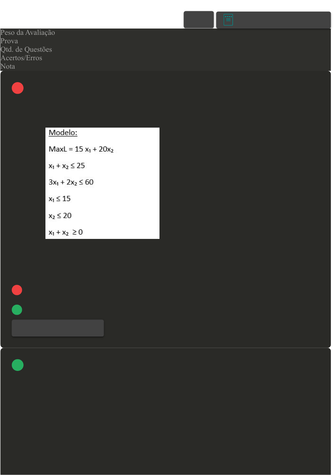 Prova Impressa GABARITO | Avaliação II - Individual (Cod.:956133) Peso da Avaliação 2,00 Prova 83575577 Qtd. de Questões 10 Acertos/Erros 7/3 Nota 7,00 Um problema de programação linear que tenha duas ou até três variáveis de decisão pode ser encontrada usando-se representações no sistema de eixos cartesianos ortogonais. Imagine o planejamento de uma empresa cerâmica, em que se busca a solução ótima ou de lucro máximo entre os produtos x1 e x2, conforme o modelo na imagem anexa. Baseado no modelo, assinale a alternativa CORRETA que apresenta o lucro máximo que pode ser obtido, levando em consideração as restrições do modelo: A 365,00. B 400,00. C 625,00. D 450,00. Um grafo pode ser definido com um conjunto de nós (vértices ou pontos) ligado ou não por arcos (arestas ou ramos). Nesse sentido, um grafo pode simular, por exemplo, as ruas que conectam várias cidades numa determinada região. Um grafo conectado é aquele que sempre apresenta, pelo menos, um arco ligando qualquer par de nós do grafo. Outra definição importante para a teoria dos grafos está relacionada com o "laço". Um laço é um caminho que conecta um nó a ele mesmo. Um dos problemas mais famosos da teoria dos grafos é o problema do caixeiro viajante (PCV), entretanto, sua origem ainda é desconhecida. Com relação às características do problema do caixeiro viajante, assinale a alternativa CORRETA: A Segundo o princípio do caixeiro viajante, um comprador deve visitar seus fornecedores em qualquer cidade, podendo visitar duas vezes a mesma cidade e deixar de visitar algum cliente se necessário. VOLTAR A+ Alterar modo de visualização 1 Revisar Conteúdo do Livro 2 10/06/2024, 12:59 Avaliação II - Individual about:blank 1/6 B Segundo o princípio do caixeiro viajante, um vendedor deve visitar seus clientes em cidades distintas, sem visitar duas vezes a mesma cidade e sem deixar de visitar nenhum cliente. C Atualmente, o problema do caixeiro viajante não é denominado desta forma, sendo tratado somente como um problema de tráfego, sendo que, o princípio mudou ao longo dos anos. D O problema do caixeiro viajante deve considerar que o vendedor precisa fazer todas as visitas no maior percurso possível, assim ganha dinheiro com as viagens. Uma fábrica de balas produz duas variedades de balas com os mesmos ingredientes, apenas alteram a proporção de açúcar e banana, sendo uma "light" e a outra "tradicional". Para produzir uma porção na panela com capacidade de 10 kg, utiliza-se 1,5 kg de açúcar e 8,5 kg de banana. Já a versão "tradicional" utiliza 3,5 Kg de açúcar para 6,5 kg de banana, sendo o custo fixo de R$ 10 por porção de 10 kg. O preço da banana é de R$ 0,80 por kg e o do açúcar é de R$ 1,50. Selecione a opção que maximiza o lucro, sendo que teremos disponíveis 50.000 kg de banana e 35.000 kg de açúcar. O preço de venda da bala "light" é de R$ 55,00 por porção de 10 kg, e a porção de 10 kg da versão "tradicional" é vendida a R$ 56,00. As balas são vendidas por kg ao varejo. Diante do exposto, analise as opções a seguir: I- Maximizar função Z = 10+ (x1*0,80+x2*1,50)-55,00 Sujeito às restrições: 1)1,50 *x1 + 3,50*x2 < ou = 35.000 kg (restrição de açúcar) 2)8,50*x1+6,50*x2 < ou = 50.000 kg (restrição de banana) 3)x1, x2> ou =0 (positividade das variáveis). II- Maximizar função Z = x1*3,59+x2*3,55 Sujeito às restrições: 1) 0,15 *x1 + 0,35*x2 < ou = 35.000 kg (restrição de açúcar) 2) 0,85*x1+0,65*x2 < ou = 50.000 kg (restrição de banana) 3) x1, x2> ou = 0 (positividade das variáveis) III- Maximizar função Z =(x1*35,90+x2*35,50)+(x1*x2*10) Sujeito às restrições: 1) 1,50*x1 + 3,50*x2 > ou = 35.000 kg (restrição de açúcar) 2) 8,50*x1+6,50*x2 > ou = 50.000 kg (restrição de banana) 3) x1, x2> ou =0 (positividade das variáveis) IV- Maximizar função Z = Não é possível formular uma função matemática, apenas determinar as restrições, pois se trata de um SI (sistema impossível): 1) 0,15 *x1 + 0,35*x2 < ou = 35.000 kg (restrição de açúcar) 2) 0,85*x1+0,65*x2 < ou = 50.000 kg (restrição de banana) 3) x1, x2 > ou = 0 (positividade das variáveis) Assinale a alternativa CORRETA: A Somente a opção I é a correta. B Somente a opção III é a correta. C Somente a opção IV é a correta. D Somente a opção II é a correta. 3 10/06/2024, 12:59 Avaliação II - Individual about:blank 2/6 A programação linear, na área da Modelagem Matemática, é um campo da pesquisa operacional com ampla aplicação em apoio à decisão. Um dos métodos existentes é a resolução gráfica. Nesse sentido, a resolução gráfica de um problema de programação linear pode ser vista como ferramenta prática, pois é ideal para problemas simples, que envolvem duas variáveis de decisão. Para a esquematização gráfica de soluções de problemas de programação linear com duas variáveis, serão abordadas algumas possíveis soluções para um problema desse tipo de programação, de acordo com a região viável obtida em cada caso. Dessa forma, as soluções para problemas de minimização poderão ser dadas como: única solução ótima finita; solução ótima alternativa; solução ótima inexistente; região viável vazia. Com relação às possíveis soluções para problemas de minimização, assinale a alternativa CORRETA: A Na solução ótima inexistente tem-se um conjunto infinito de soluções ótimas. B Solução ótima finita é única e ocorre quando a região viável é ilimitada e a solução ótima é infinita. C Na região viável vazia, o sistema de equações ou inequações que definem a região viável é inconsistente. D Solução ótima alternativa ocorrerá em um vértice (ponto extremo). Uma fábrica de móveis tem em estoque 500 m de tábuas, 300 m de pranchas e 200 m de painéis de MDF. A fábrica disponibiliza uma linha de móveis com os seguintes produtos: carteira escolar, mesa, estante e prateleir
