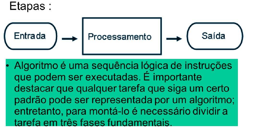 Entrada: São as informações que iniciam o algoritmo. Processamento: São
