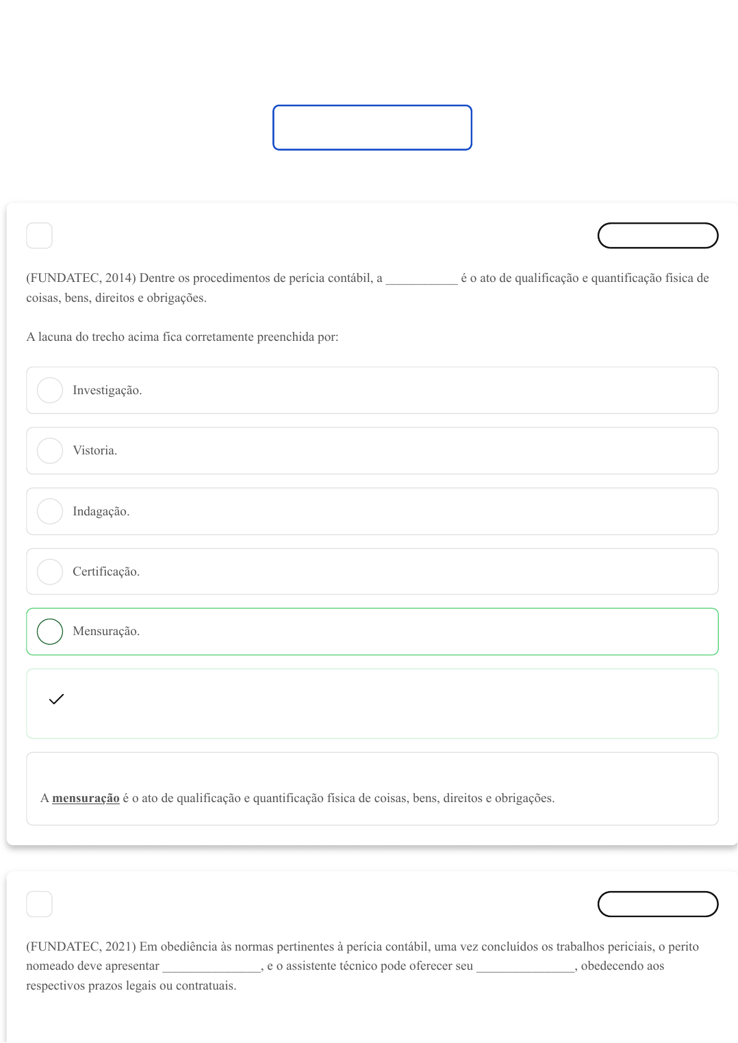 Você acertou 7 de 10 questões Verifique o seu desempenho e continue treinando! Você pode refazer o exercício quantas vezes quiser. Verificar Desempenho A B C D E 1 Marcar para revisão (FUNDATEC, 2014) Dentre os procedimentos de perícia contábil, a ___________ é o ato de qualificação e quantificação física de coisas, bens, direitos e obrigações. A lacuna do trecho acima fica corretamente preenchida por: Investigação. Vistoria. Indagação. Certificação. Mensuração. Resposta correta Parabéns, você selecionou a alternativa correta. Confira o gabarito comentado! Gabarito Comentado A mensuração é o ato de qualificação e quantificação física de coisas, bens, direitos e obrigações. 2 Marcar para revisão (FUNDATEC, 2021) Em obediência às normas pertinentes à perícia contábil, uma vez concluídos os trabalhos periciais, o perito nomeado deve apresentar _______________, e o assistente técnico pode oferecer seu _______________, obedecendo aos respectivos prazos legais ou contratuais. A B C D E Assinale a alternativa que preenche, correta e respectivamente, as lacunas do trecho acima. Laudo Pericial Contábil - Parecer Pericial Contábil. Laudo Pericial Contábil - Relatório Pericial Contábil. Parecer Pericial Contábil - Laudo Pericial Contábil. Parecer Pericial Contábil - Relatório Pericial Contábil. Relatório Pericial Contábil - Laudo Pericial Contábil. Resposta correta Parabéns, você selecionou a alternativa correta. Confira o gabarito comentado! Gabarito Comentado Em obediência às normas pertinentes à perícia contábil, uma vez concluídos os trabalhos periciais, o perito nomeado deve apresentar laudo, e o assistente técnico pode oferecer seu parecer, obedecendo aos respectivos prazos legais ou contratuais. 3 Marcar para revisão (Adaptada de CFC, 2011) De acordo com a NBC TP 01 - Perícia Contábil, os procedimentos de perícia contábil visam fundamentar as conclusões que serão levadas ao laudo pericial contábil ou parecer pericial contábil e abrangem, total ou parcialmente, segundo a natureza e a complexidade da matéria, exame, vistoria, indagação, investigação, arbitramento, mensuração, avaliação e certificação. Relacione procedimentos de perícia contábil na primeira coluna com a respectiva descrição na segunda coluna e, em seguida, assinale a opção CORRETA. (1) Exame (2) Vistoria (3) Arbitramento (4) Certificação ( ) Ato de atestar a informação trazida ao laudo pericial contábil pelo perito-contador, conferindo-lhe caráter de autenticidade pela fé pública atribuída a este profissional. ( ) Determinação de valores ou a solução de controvérsia por critério técnico-científico. ( ) Análise de livros, registros das transações e documentos. ( ) Diligência que objetiva a verificação e a constatação de situação, coisa ou fato, de forma circunstancial. A sequência CORRETA é: A B C D E 4, 3, 2, 1. 4, 3, 1, 2. 3, 4, 1, 2. 3, 4, 2, 1. 2, 1, 3, 4. Resposta incorreta Opa! A alternativa correta é a letra B. Confira o gabarito comentado! Gabarito Comentado A alternativa correta é a B, que apresenta a sequência correta de procedimentos de perícia contábil e suas respectivas descrições. Vejamos: (4) Ato de atestar a informação trazida ao laudo pericial contábil pelo perito-contador, conferindo-lhe caráter de autenticidade pela fé pública atribuída a este profissional. Este procedimento é conhecido como Certificação. (3) Determinação de valores ou a solução de controvérsia por critério técnico-científico. Este procedimento é chamado de Arbitramento. (1) Análise de livros, registros das transações e documentos. Este procedimento é o Exame. (2) Diligência que objetiva a verificação e a constatação de situação, coisa ou fato, de forma circunstancial. Este procedimento é a Vistoria. Portanto, a sequência correta é 4, 3, 1, 2, que corresponde à alternativa B. 4 Marcar para revisão (Adaptada de CFC, 2012) Relacione os procedimentos de perícia contábil apresentados na primeira coluna com a definição constante da segunda coluna e, em seguida, assinale a opção correta. (1) Arbitramento (2) Mensuração (3) Avaliação (4) Certificação ( ) É a determinação de valores ou a solução de controvérsia por critério técnico-científico. ( ) É o ato de atestar informação trazida ao laudo pericial contábil pelo perito-contador, conferindo-lhe caráter de autenticidade pela fé pública atribuída a este profissional. ( ) É o ato de estabelecer o valor de coisas, bens, direitos, obrigações, despesas e receitas. ( ) É o ato de qualificação e quantificação física de coisas, bens, direitos e obrigações. A B C D E A B A sequência correta é: 4, 3, 2, 1. 1, 4, 3, 2. 3, 1, 4, 2. 2, 3, 1, 4. 1, 2, 3, 4. Resposta correta Parabéns, você selecionou a alternativa correta. Confira o gabarito comentado! Gabarito Comentado A alternativa correta é a B, que apresenta a seguinte sequência: (1) Arbitramento, (4) Certificação, (3) Avaliação e (2) Mensuração. Vamos entender cada um: (1) Arbitramento: É a determinação de valores ou a solução de controvérsia por critério técnico-científico. Ou seja, é um procedimento que busca resolver conflitos ou estabelecer valores com base em critérios técnicos e científicos. (4) Certificação: É o ato de atestar informação trazida ao laudo pericial contábil pelo perito-contador, conferindo-lhe caráter de autenticidade pela fé pública atribuída a este profissional. Isso significa que o perito-contador confirma a veracidade das informações apresentadas no laudo pericial contábil. (3) Avaliação: É o ato de estabelecer o valor de coisas, bens, direitos, obrigações, despesas e receitas. Em outras palavras, é o processo de determinar o valor monetário de algo. (2) Mensuração: É o ato de qualificação e quantificação física de coisas, bens, direitos e obrigações. Isso envolve a determinação