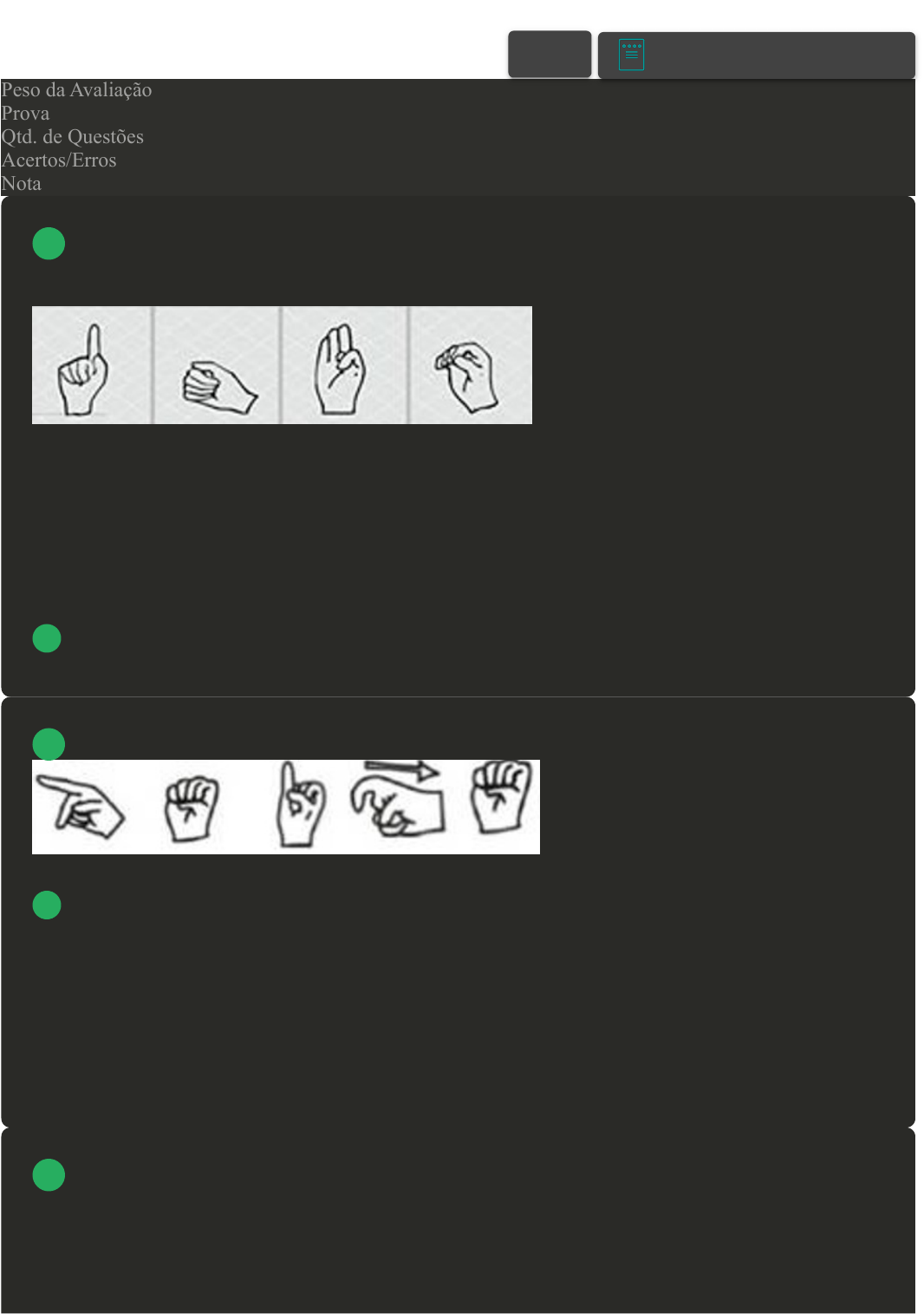 Prova Impressa GABARITO | Avaliação II - Individual (Cod.:955737) Peso da Avaliação 2,00 Prova 81870300 Qtd. de Questões 10 Acertos/Erros 8/2 Nota 8,00 A Língua Brasileira de Sinais (LIBRAS) é a língua de sinais ou gestual, legalmente reconhecida como meio de comunicação e expressão. Observe a palavra em alfabeto manual em libras. Assinale a alternativa CORRETA que indica qual é a palavra: A Pote. B Alça. C Pato. D Gato. Observe a palavra escrita pelo alfabeto manual em libras. Assinale a alternativa CORRETA que indica qual é o nome do animal: A Peixe. B Cobra. C Veado. D Gato. Existem níveis em que os Surdos utilizam a Língua Brasileira de Sinais, por meio de vocabulário mais reduzido ou amplo/complexo. Entre os níveis, dois deles merecem destaque: a Língua de Sinais Formal e a Língua de Sinal Informal ou Nativa. Sobre esses níveis, analise as sentenças a seguir: I- A Língua de Sinais Informal ou Nativa é o mesmo que dialetos, gestos e mímicas. VOLTAR A+ Alterar modo de visualização 1 2 3 09/05/2024, 20:45 Avaliação II - Individual about:blank 1/5 II- A Língua de Sinal Formal não utiliza a estrutura da língua de sinais, que é a imagem do pensamento. III- A Língua de Sinais Informal não utiliza as regras da Língua de Sinais. IV- A Língua de Sinais Formal não usa a configuração de mãos, expressão e localização. Assinale a alternativa CORRETA: A As sentenças II e IV estão corretas. B As sentenças I e III estão corretas. C Somente a sentença III está correta. D Somente a sentença II está correta. A Língua Brasileira de Sinais (LIBRAS) é a língua de sinais ou gestual, legalmente reconhecida como meio de comunicação e expressão. Observe a palavra em alfabeto manual em libras. Assinale a alternativa CORRETA que indica qual é a palavra: A Arcos. B Porco. C Peixe. D Peões. [Laboratório Virtual – Datilologia] A datilologia está inserida dentro da estrutura linguística da língua de sinais de todo o mundo. É a técnica de comunicação que usa especialmente os dedos e as mãos. A posição das mãos representa cada letra do alfabeto. Baseado nesta informação, assinale a alternativa CORRETA sobre o alfabeto manual e a datilologia em Libras: A No Brasil, o alfabeto manual/datilológico é composto por 27 formatos, contando com o grafema “ç”. B Para fazer o alfabeto manual é necessário utilizar somente uma mão. C Todas as letras no alfabeto manual precisam estar paradas e nunca se movimentam. D Semelhante ao alfabeto datilológico, o alfabeto da língua portuguesa é um sistema sobre a palma da mão. 4 5 09/05/2024, 20:45 Avaliação II - Individual about:blank 2/5 Assim como na Língua Portuguesa, temos palavras diferentes para nos referir ao mesmo objeto, chamadas de ambiguidade, que é a característica das expressões linguísticas que apresentam mais de um sentido/significado para aquela palavra. Normalmente quando isso acontece, precisa de um contexto para ser compreendida, isto é, possui ambiguidade. Sobre esses fenômenos, classifique V para as sentenças verdadeiras e F para as falsas: ( ) Sinais homônimos ocorrem quando os sentidos da palavra ambígua não são relacionados, ou seja, os sinais que, embora apresentem parâmetros idênticos em Libras, não estabelecem qualquer tipo de relação semântica entre si. ( ) Sinais polissêmicos estão relacionados à ambiguidade semântica, possuem dois ou mais significados, de acordo com o contexto. ( ) Tautologia, na Língua Portuguesa, é considerado um vício de linguagem, usando palavras sinônimas. Em LIBRAS, são sinais que apresentam variantes regionais, com dois ou mais sinais que representam o mesmo significado, assim, o contexto expressa a mesma ideia mas com sinais diferentes. ( ) Historicamente, a datilologia é a técnica de comunicação por meio de sinais feitos com os dedos ou com as mãos. E a posição das mãos e as letras representam as letras do alfabeto. Assinale a alternativa que apresenta a sequência CORRETA: A V – V – V – F. B F – F – V – V. C F – V – F – F. D V – V – V – V. [Laboratório Virtual – Alfabeto Manual em Libras] Na sua prática virtual sobre o alfabeto em Libras, fica claro que qualquer pessoa pode aprender o alfabeto manual das línguas de sinais e dependendo do nível de habilidade e rapidez da pessoa, sua compreensão pode tornar-se complexa ou não. Assim, mesmo que você já esteja bem treinado no alfabeto manual em Libras, analise as sentenças a seguir: I- É mais usada para expressar nome de pessoas, localidades e outras palavras que não possuem um sinal específico. II- Muitas palavras quando soletradas no alfabeto, se transformam em sinais. III- As palavras podem ser soletradas em um ritmo próprio. IV- Semelhante ao alfabeto datilológico, o alfabeto manual para surdocegos é um sistema realizado no pé. Assinale a alternativa CORRETA: A Somente a sentença III está correta. B As sentenças I e IV estão corretas. C As sentenças II e IV estão corretas. D As sentenças I, II e III estão corretas. 6 Revisar Conteúdo do Livro 7 09/05/2024, 20:45 Avaliação II - Individual about:blank 3/5 Embora exista algumas semelhanças na gramática da Língua Brasileira de Sinais e da Língua Portuguesa, no que diz respeito à ordem das palavras ou constituinte há diferenças, pois o português é uma língua de base sujeito predicado enquanto que a LIBRAS é uma língua do tipo tópico- comentário. Sobre essas diferenças, associe os itens, utilizando o codigo a seguir: I- Língua Portuguesa. II- LIBRAS. ( ) Oral auditiva. (Entonação e intensidade). ( ) Visuoespacial (expressão facial e corporal). ( ) FONEMA (som): Unidade mínima sem significado de uma língua e a sua organização interna. ( ) Léxico reproduzido por meio de sinais baseada nas interações sociais dos indivíduos. Assinale a alternativa que apresenta a sequência CORRETA: A I - II - I - II. B II - I - II - I . C II - II - I - I. 