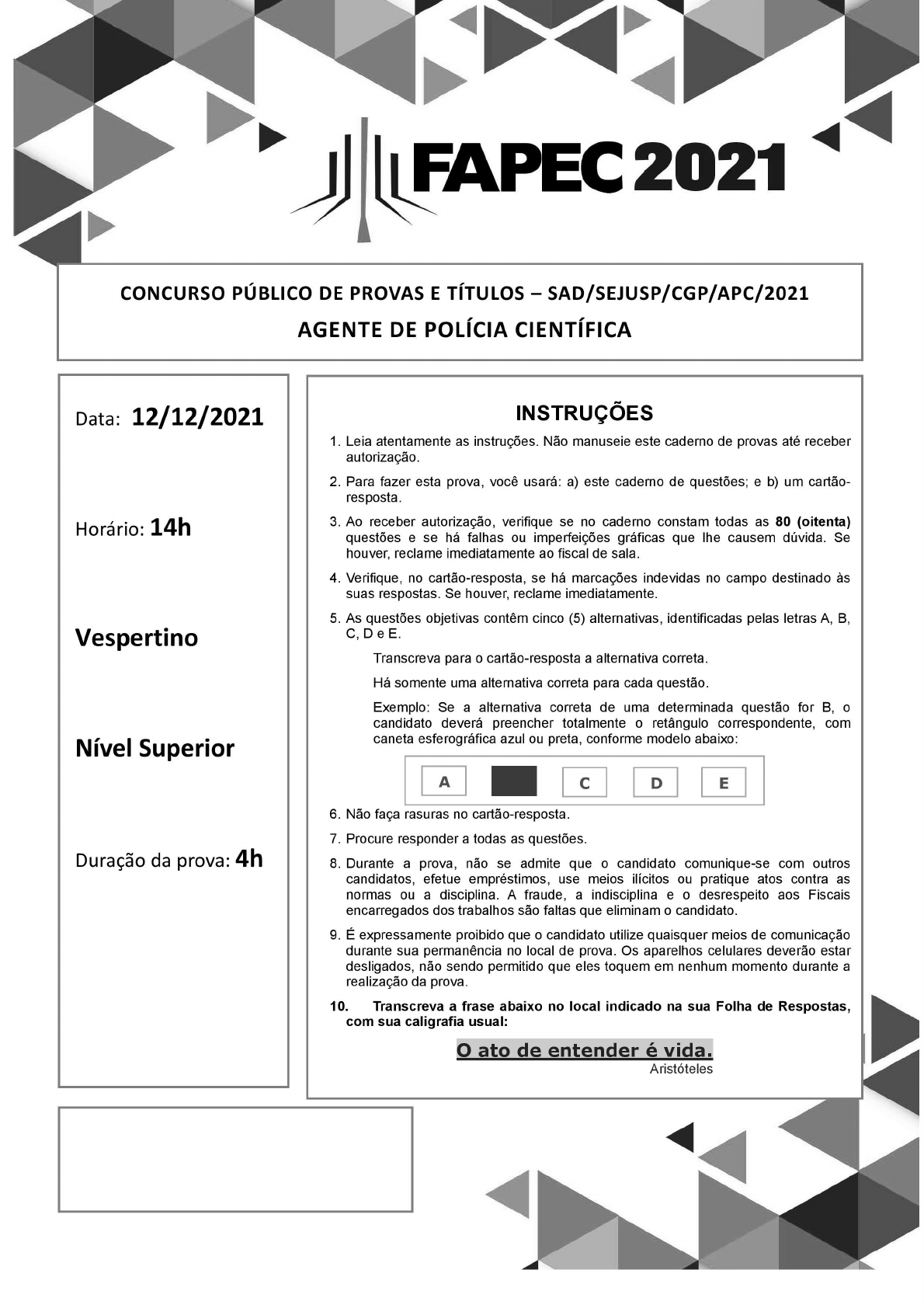 PL. > |FAPEC 2021 * >, > CONCURSO PÚBLICO DE PROVAS E TÍTULOS — SAD/SEJUSP/CGP/APC/2021 AGENTE DE POLÍCIA CIENTÍFICA Data: 12/12/2021 INSTRUÇÕES 1. Leia atentamente as instruções. Não manuseie este caderno de provas até receber autorização. 2. Para fazer esta prova, você usará: a) este cademo de questões; e b) um cartão- resposta. Horário: 14h 3. Ao receber autorização, verifique se no caderno constam todas as 80 (oitenta) ' questões e se há falhas ou imperfeições gráficas que lhe causem dúvida. Se houver, reclame imediatamente ao fiscal de sala. 4. Verifique, no cartão-resposta, se há marcações indevidas no campo destinado às suas respostas. Se houver, reclame imediatamente. 5. As questões objetivas contêm cinco (5) alternativas, identificadas pelas letras A, B, Vespertino C,DeE. Transcreva para o cartão-resposta a alternativa correta. Há somente uma alternativa correta para cada questão. Exemplo: Se a alternativa correta de uma determinada questão for B, o candidato deverá preencher totalmente o retângulo correspondente, com caneta esferográfica azul ou preta, conforme modelo abaixo: A Cc [E 6. Não faça rasuras no cartão-resposta. Nível Superior 7. Procure responder a todas as questões. Duração da prova: 4h 8. Durante a prova, não se admite que o candidato comunique-se com outros candidatos, efetue empréstimos, use meios ilícitos ou pratique atos contra as normas ou a disciplina. A fraude, a indisciplina e o desrespeito aos Fiscais encarregados dos trabalhos são faltas que eliminam o candidato. 9. É expressamente proibido que o candidato utilize quaisquer meios de comunicação durante sua permanência no local de prova. Os aparelhos celulares deverão estar desligados, não sendo permitido que eles toquem em nenhum momento durante a realização da prova. 10. Transcreva a frase abaixo no local indicado na sua Folha de Respostas, com sua caligrafia usual: O ato de entender é vida. Aristóteles “< « LÍNGUA PORTUGUESA 01 - Assinale a alternativa correta quanto à concordância, ao uso (presença ou ausência) de “acento” indicativo de crase e ao emprego de pronomes. A) Para fins de instrução processual e em atenção ao solicitado por um servidor de vosso gabinete, encaminhamos a Vossa Excelência os laudos periciais pertinentes ao inquérito Nº 29/2021. B) Para fins de instrução processual e em atenção ao solicitado por um servidor de seu gabinete, encaminhamos a Vossa Excelência os laudos periciais pertinentes ao inquérito Nº 29/2021. C) Para fins de instrução processual e em atenção ao solicitado por um servidor de vosso gabinete, encaminhamos à Vossa Excelência os laudos periciais pertinentes ao inquérito Nº 29/2021. D) Para fins de instrução processual e em atenção ao solicitado por um servidor de seu gabinete, encaminhamos à Vossa Excelência os laudos periciais pertinente ao inquérito Nº 29/2021. E) Para fins de instrução processual e em atenção ao solicitado por um servidor de vosso gabinete, encaminhamos a Vossa Excelência os laudos pericial pertinente ao inquérito Nº 29/2021. 02 - No romance O coronel e o lobisomem, há uma cena em que o orgulhoso Ponciano (o coronel) procura desmerecer o homem que fora incumbido de matá-lo (CARVALHO, 1985, p. 24): Digo sem ostentação que Deus não cresceu o neto de meu avô na beira dos dois metros para que ele desperdiçasse essa grandeza toda em raiva de anão, em ódio de sujeito nascido para caber num dedal de costureira. Nesse contexto, a expressão em destaque pode ser interpretada como: A) eufemismo. B) metonímia. C) paradoxo. D) hipérbole. E) ironia. 03 - Esta questão avalia conhecimentos sobre diferentes itens do conteúdo previsto para a prova (colocação pronominal, som e fonema, encontros vocálicos e digrafos). Assinale a alternativa que traz a informação correta sobre o respectivo item. A) Se, na frase “Esperamos que ela faça você refletir”, substituirmos o pronome “você” pela forma átona correspondente, teremos a seguinte construção: “Esperamos que ela faça-o refletir”. B) Nas palavras “deixar”, “explicar”, “complexo” e “existencial”, um mesmo grafema (“x”) representa sons e fonemas diferentes. C) Em “contarão” e “contaram”, as sequências grifadas correspondem, na fala, a ditongo e digrafo nasal, respectivamente. D) Na “pronúncia” das sequências grifadas nas palavras “complexo” e “fazem”, ocorrem digrafos nasais. E) As sequências destacadas em “plateia” e “iguais” representam tritongos. As questões 04, 05 e 06 referem-se ao seguinte fragmento de texto: [...] Em termos de inconsciente coletivo, o policial exerce função educativa arquetípica: deve ser “o mocinho”, com procedimentos e atitudes coerentes com a “firmeza moralmente reta”, oposta radicalmente aos desvios perversos do outro arquétipo que se contrapõe: o bandido. Ao olhar para uns e outros, é preciso que a sociedade perceba claramente as diferenças metodológicas, ou a “confusão arquetípica” intensificará sua crise de moralidade, incrementando a ciranda da violência. Isso significa que a violência policial é geradora de mais violência, , mui comumente, o próprio policial torna-se a vítima. Ao policial não cabe, pois, ser cruel com os cruéis, vingativo contra os antissociais, hediondo com os hediondos. [...]. Não se ensina a respeitar desrespeitando, não se pode educar para preservar a vida matando, não importa quem seja. O policial jamais pode esquecer que também observa o inconsciente coletivo. [...] Essa dimensão “testemunhal”, exemplar, pedagógica, que o policial carrega irrecusavelmente é, possivelmente, mais marcante na vida da população do que a própria intervenção do educador por ofício, o professor. Esse fenômeno ocorre devido gravidade do momento em que normalmente o policial encontra o cidadão. — | polícia recorre- se, como regra, em hor