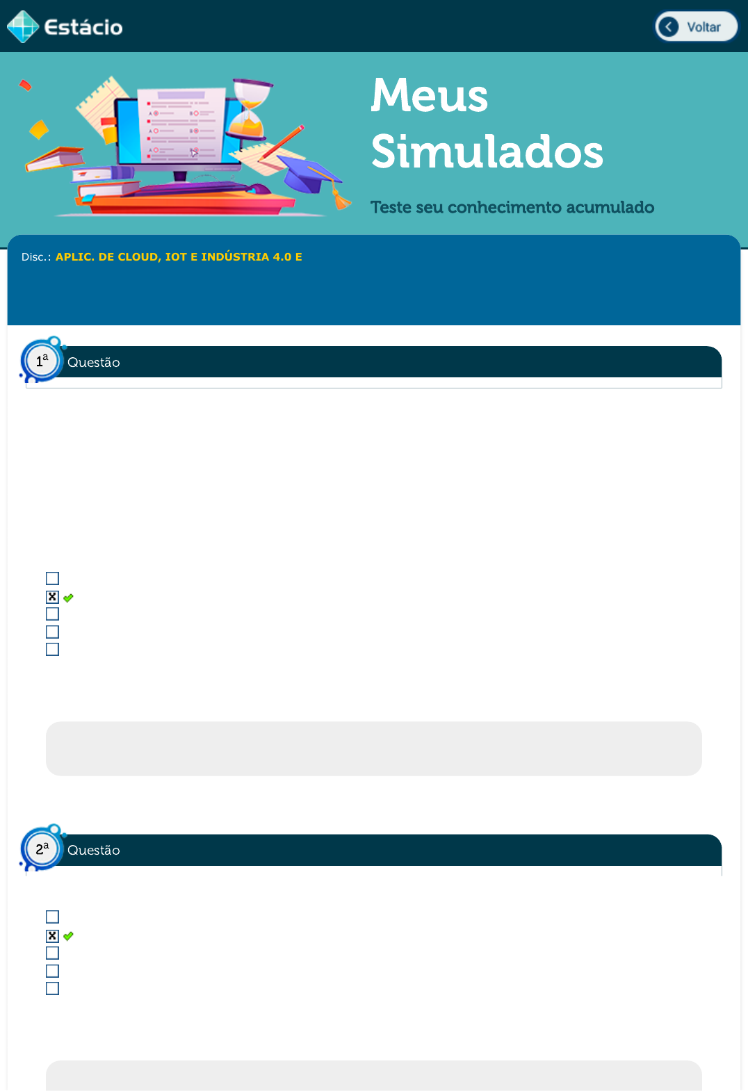 Meus Simulados Teste seu conhecimento acumulado Disc.: APLIC. DE CLOUD, IOT E INDÚSTRIA 4.0 EM PYTHON Aluno(a): FRANCJAMES DE SOUSA DA SILVA 202105021091 Acertos: 9,0 de 10,0 10/01/2023 Acerto: 1,0 / 1,0 Leia atentamente as sentenças abaixo: I. Dispositivos sofisticados usados para aquisição de dados em tempo real. II. Convertem medição física em sinais elétricos digitais ou analógicos. III. Alcance e precisão são importantes fatores na escolha. As descrições acima se referem respectivamente à/ao: Família de placas Arduino Sensores ESP32 e seus antecessores Dispositivos de IoT Plataformas de IoT Respondido em 10/01/2023 05:29:39 Explicação: Resposta correta: Sensores Acerto: 1,0 / 1,0 Assinale a opção correta sobre o módulo HTTPS. É um protocolo novo e, portanto, ainda não muito testado. É seguro e pode ser usado em comunicação M2M. Não usa criptografia para proteger as mensagens. É inseguro e não deve ser usado em comunicação M2M. É indicado para o uso de diversos dispositivos simultaneamente. Respondido em 10/01/2023 05:31:59 Explicação: Questão1 a Questão2 a https://simulado.estacio.br/alunos/inicio.asp javascript:voltar(); Resposta correta: É seguro e pode ser usado em comunicação M2M. Acerto: 1,0 / 1,0 Os modelos de Serviço na Nuvem tratam de diversos aspectos que são muito úteis para empresas que estão em diferentes momentos de maturidade de negócio. Um desses modelos é o CaaS (comunicação como um serviço). Nesse sentido, selecione a opção que relaciona CORRETAMENTE o CaaS com a categoria a que ele pertence: IaaS: dado que a infraestrutura base para que haja comunicação deve garantir a confiabilidade do processo. SaaS: pois trata-se de um serviço de software. IaaS IoT: além da infraestrutura estar devidamente configura, ela também precisa estar habilitada para comunicar-se com dispositivos característicos de IoT. PaaS: uma vez que, para que haja comunicação, é necessário que a plataforma esteja configurada. XaaS: pois generalizam os diversos modelos de serviço. Respondido em 10/01/2023 05:42:57 Explicação: Resposta correta: XaaS: pois generalizam os diversos modelos de serviço. Acerto: 1,0 / 1,0 Um dos protocolos mais utilizados para desenvolver projetos de IoT é o MQTT. Cada protocolo tem uma orientação que é a base para o seu desenvolvimento. A respeito do protocolo MQQT, selecione a opção CORRETA. É orientado para Mensagem, pois trata cada mensagem como um bloco de dados que vai ser operada pelo broker. É orientado para comunicação segura, uma vez que utiliza de protocolos que reduzem os riscos de comunicação na rede. É orientado para dispositivo, dado que trata a heterogeneidade dos diversos componentes que podem se integrar no sistema. É orientado para dados, pois gerencia o fluxo entre o servidor e os dispositivos da rede. É orientado para Rede, uma vez que considera aspectos específicos da internet. Respondido em 10/01/2023 05:43:50 Explicação: Respsota correta: É orientado para Mensagem, pois trata cada mensagem como um bloco de dados que vai ser operada pelo broker. Acerto: 1,0 / 1,0 Fonte: Olimpíada Brasileira de Robótica Ano: 2014 Muitos projetistas usam um Arduino para construir seus robôs. O Arduino é um pequeno computador que custa cerca de R$50,00 e pode ser conectado a sensores, motores, e executar programas feitos pelos inventores dos robôs. Alguns sensores, conhecidos como analógicos, podem ser ligados diretamente ao Arduino e apresentam uma variação de voltagem, indo de 0 até 5 volts. Por exemplo, um sensor de temperatura tem na sua saída uma voltagem que representa a temperatura usando a proporção de 0,01 volts para cada grau Celsius de temperatura. Assim, por exemplo, a temperatura de 21 graus é representada pela voltagem de 0,21 volts. Infelizmente estes valores de tensão dos sensores analógicos não podem ser reconhecidos por um computador, de forma que é necessário converter o valor decimal para um valor que o computador entende (binário). No caso do Arduino, os sensores têm suas leituras representadas por 210 números distintos, indo de 0 até 210-1. Questão3 a Questão4 a Questão5 a Sabendo que 0 é representado por 0, e 5V é representado por 210-1, quais os valores mais próximos da representação interna do Arduino para 5V, 2,5V e para 0,21V respectivamente? 0, 2,5 e 5 210, 25 e 0,21 1023, 511 e 43 512, 256 e 42 5, 2,5 e 0,21 Respondido em 10/01/2023 05:44:56 Explicação: Resposta correta: 1023, 511 e 43 Acerto: 0,0 / 1,0 Uma das IDEs recomendadas para desenvolver projetos no NodeMCU é a IDE ESPlorer. Ela oferece recursos que facilitam o desenvolvimento, teste e transferência de um programa para a placa NodeMCU. Em relação a IDE ESPlorer, selecione a opção correta. Ela oferece recursos para desenvolver programas em MicroPython e configurar a velocidade da transmissão de dados. Depois de instalar a IDE, ela já está pronta para desenvolver programas no MicroPython. Trata-se de um ambiente de desenvolvimento geral onde é possível programar em todas as linguagens suportadas pelo NodeMCU. Trata-se de um projeto de código livre, sem documentação e com poucos exemplos disponíveis na rede, por isso recomenda-se o seu uso apenas para fins didáticos. É um projeto de código proprietário com suporte garantido pelo fornecedor, desde que seja feito um contrato de licença. Respondido em 10/01/2023 05:47:45 Explicação: Resposta correta: Ela oferece recursos para desenvolver programas em MicroPython e configurar a velocidade da transmissão de dados. Acerto: 1,0 / 1,0 Selecione o processo de análise e interpretação de dados para encontrar padrões significativos que se tornou indispensável na Indústria 4.0. Meta análise. Virtualização. Análise inteligente. Análise de Big Data. Predição. Respondido em 10/01/2023 05:50:37 Explicação: Resposta correta: Análise de Big Data. Questão6 a Questão7 a Acerto: 1,0 / 1,0 Uma tentativa de pr