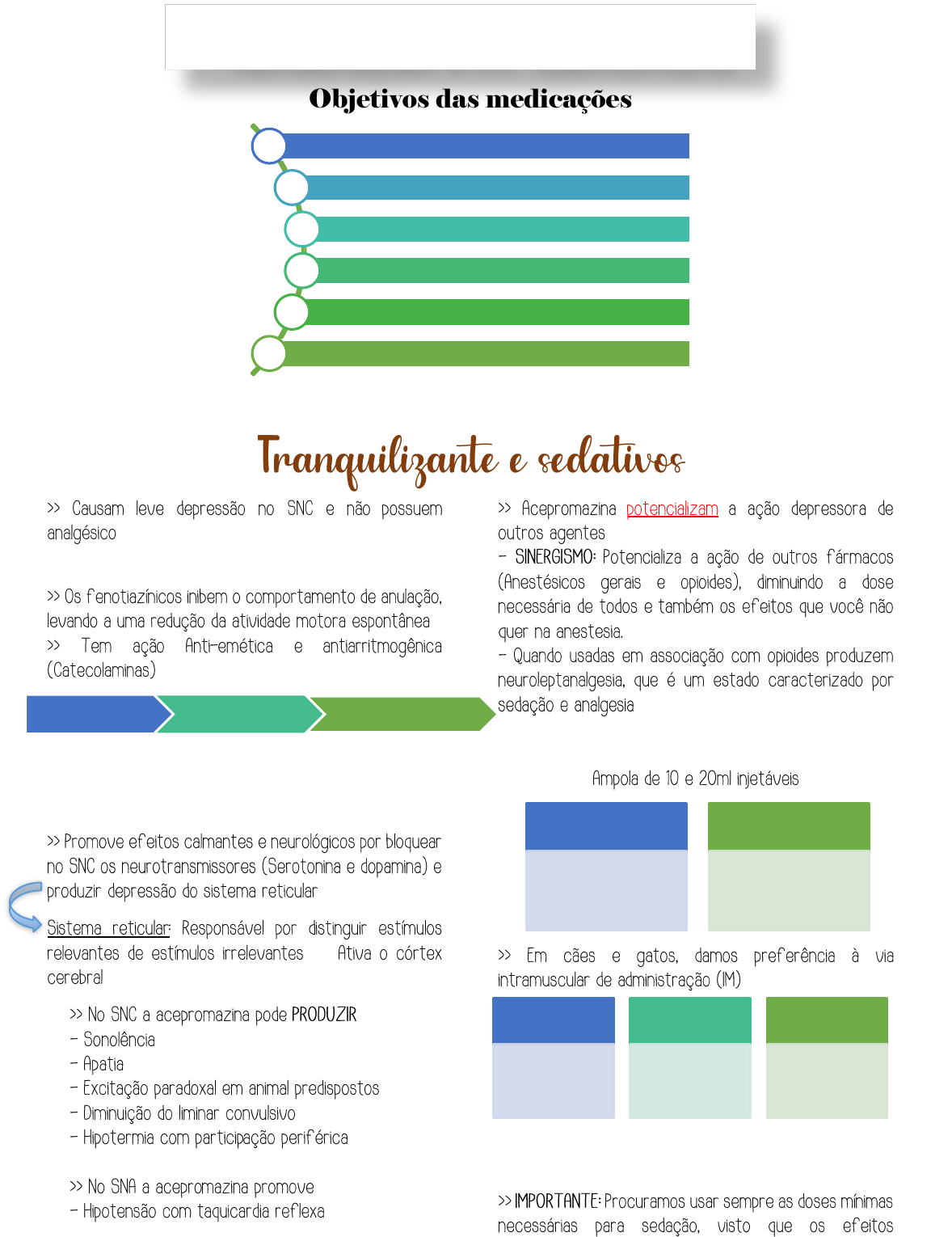 Objetivos das medicações Fenotiazínicos Acepromazina APRESENTAÇÃO Sedação Tranquilização Coadjuvante Relaxamento muscular Estimulante Hemodinamica Analgesia Concentrações • 0,2% • 2% Doses •0,03 mg/Kg •0,2 mg/Kg Medicação Pré Anestésica Acepromazina Clorpromazina Levomepromazina Inicio de ação •5 a 10min IM •2 a 3min IV Efeito Máximo •20 a 30min IM •10 a 15min IV Duração do efeito sedação •60 a 120min IM •40 a 50min IV CONTRAINDICAÇÕES CUIDADOS ESPECIAIS Clorpromazina APRESENTAÇÃO >> EFEITO >> EFEITO ADVERSO Apresentação >> EFEITOS E EFEITOS ADVERSOS: Concentração • 5mg/ml Doses •0,25mg/kg •1mg/kg Inicio de ação •5 a 10min IM •2 a 3min IV Efeito máximo •20 a 30min IM •10 a 15 IV Duração do efeito sedação •> 120min IM •60 a 80min IV Concentração • 5mg/ml Doses •0,25 a 1mg/k Inicio de ação •5 a 10min IM •2 a 3 min IV Efeito máximo •20 a 30min IM •10 a 15min IV Duração dp efeito sedação •> 120min IM •60 a 80min IV EFEITOS EFEITOS ADVERSOS Benzodiazepínicos MECANISMO DE AÇÃO OS BENZODIAZEPÍNICOS TEM AÇÃO: Diazepam APRESENTAÇÃO >> EFEITOS ADVERSOS >> CUIDADOS ESPECIAIS Midazolam Diazepam Midazolam Concentração •5mg/ml Doses •0,25mg/kg •1mg/kg Inicio de ação •> 1min IV Duração do efeito •2 a 3 horas APRESENTAÇÃO Alfa - 2 agonistas adrenérgicos α α Xilazina α α α α α α α CONTRAINDICAÇÃO APRESENTAÇÃO >> EFEITOS ADVERSOS Dexdemedetomidina A Dexdemedetomidina causa Vias de administração IMPORTANTE APRESENTAÇÃO µ Inicio de ação •10 -15 min Duração do efeito •1 a 2 horas Concentração • 500 µg/ml Doses •1 a 10µg/Kg IM Infusão • 0,5 a 2µg/Kg/h Doses Infusão continua: Inicio de ação: Duração do efeito Concentração •2% Doses •0,5mg/kg IM •0,8 mg/kg IM Antidoto: Detomidina APRESENTAÇÃO Medetomidina Clonidina α α APRESENTAÇÃO >> EFEITOS ADVERSOS >> CUIDADOS ESPECIAIS próprios receptores Morfina APRESENTAÇÃO Concentração • 1% Doses • 20 µg/Kg IV • 40 µg/ Kg IV Concentração • 150 µg/ml Doses • 5 µg/kg • 30 µg/Kg Inicio de ação • 2 a 3 min IM Duração do efeito • 1 a 2 horas Concentração •10mg/ml • 1mg/ml Doses • 0,5 a 1mg/kg • 0,1 a 0,3mg/kg/h Antidoto: Inicio de ação • 3 a 5 min Tempo de ação • 50 a 60 min Anestesia dissociativa e Multimodal Morfina Metadona Tramadol Meperidina Fetanil Remifentanil Sulfentanil Alfentanil Buprenorfina Burorfanol Inicio de ação • 5 min IM • 2 a min IV Duração do efeito • 3 a 4 horas >> EVENTOS ADVERSOS: >> CUIDADOS ESPECIAIS >> ANTÍDOTO: Metadona APRESENTAÇÃO >> EVENTOS ADVERSOS >> CUIDADOS ESPECIAIS >> ANTIDOTO: Tramadol APRESENTAÇÃO >> EVENTOS ADVERSOS >> CUIDADOS ESPECIAIS >> ANTIDOTO Meperidina APRESENTAÇÃO >> EFEITOS ADVERSOS Concentração • 10mg/ml Doses • 0,1 mg/kg • 0,5 mg/kg Inicio de ação • 5 min IM • 2 a 3 min IV Duração do efeito • 3 a 4 horas Concentração • 50mg/ml Doses • 2mg/kg • 6mg/kg Inicio de ação • 5 min IM • 2 a 3 min IV Duração do efeito • 4 a 8 horas Concentração • 50mg/ml Dose • 5mg/ml Inicio de ação • 5 min IM Duração do efeito • 1 a 2 horas >> CUIDADOS ESPECIAIS SITUAÇÕES EM QUE USA-SE FETANIL APRESENTAÇÃO >> EVENTOS ADVERSOS >> CUIDADOS ESPECIAIS >> ANTÍDOTO: Remifentanil, Sufentanil, Alfentanil APRESENTAÇÃO ALFENTANIL >> EFEITOS ADVERSOS >> CUIDADOS ESPECIAIS >> ANTÍDOTO: APRESENTAÇÃO SUFENTANIL Concentração • 50µg/Kg Doses • 2 a 5µg/Kg Inicio de ação • < 1min Efeito máximo • 3,5 min Infusão • 5 a 15µg/Kg/h Duração do efeito • 15 a 20 min Concentração • 0,5µg/ml Doses •25µg/Kg IV • 50 µg/Kg IV Inicio de ação • <1min Efeito maximo • >1min Infusão • 25µg/Kg/h Duração do efeito • 10min em bolus • 15min em bolus Concentração • 50µg/ml • 5µg/ml Dose •1µg/Kg IV • 0,025 a 1µg/Kg/min APRESENTAÇÃO REMIFENTANIL >> Sugestão de diluição: µ >> Eventos adversos >> Cuidados especiais >> Antidoto: Buprenofrina APRESENTAÇÃO >> Vias de administração: >> Duração do efeito: Butorfanol APRESENTAÇÃO >> vias de administração >> Duração do efeito: Inicio de ação • <1min Efeito maximo • 3 a 5min Duração do efeito • 30 a 40 min em bolus Concentração • 100µg/ml Dose • 0,1 a 0,3µg/ml/min Concentração • 0,4mg/ml Dose • 5 a 20 µg/Kg Concentração • 1% e 0,1% Doses • 0,1 a 0,8mg/kg Inicio de ação • <1min Efeito máximo • 3 a 5min Duração do efeito • Enquanto estiver sendo infudido Cetamina APRESENTAÇÃO >> Eventos adversos >> Cuidados especiais >> Antidoto: Etomidato maior estabilidade cardiovascular, >> Importante >> Eventos adversos >> Cuidados especiais >> Antídoto: Concentração • 100mg/ml Doses • 0,6 a 10mg/kg Inicio de ação • 30 a 60 segundos IV • 3 a 5 min IM Duração do efeito • 30 a 180min Concentração • 2mg/ml Doses • 1 a 2mg/kg Início de ação • 15 a 30seg IV Duração do efeito • 10 a 20min Por isso, ele é utilizado sempre com um co-indutor, podendo este ser benzodiazepínico, fentanil, remifentanil, lidocaína ou até mesmo em conjunto com o propofol. Propofol Apresentação >> Eventos adversos >> Antídoto: Fundamentos de anestesia volátil Isoflurano Concentração • 10mg/ml Doses • 2 a 10mg/kg Início de ação • 10 a 15 seg IV Duração do efeito • 15 a 20 min Infusão • 50 a 500µg/kg/min Eventos adversos RAROS Receitinha da Vovó Anestesia volátil e monitoração anestésica Isoflurano Sevoflurano Desflurano Sevoflurano Equipamento para anestesia volátil Circuitos anestésicos Fundamentos de monitorização Monitoração Básica Risco anestésico >> ESTÁGIO I >> Estágio II >> Estágios III Estágios e planos anestésicos de Guedel >> Estágio IV µ µ µ Formula µ µ µ µ Bombas e taxas >> Bomba seringa >> Bomba elastomérica MILK µ µ µ Bombas e taxas Portanto, utiliza