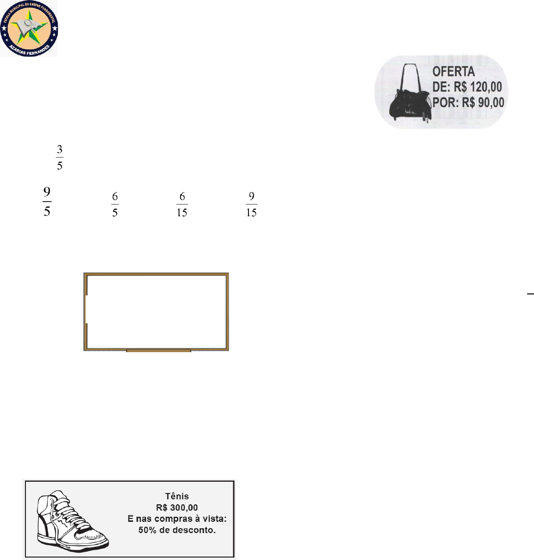AVALIAÇÃO DE MATEMÁTICA NOME:_________________________________ Nº_____ NOTA:_______ +________=_________ Prof.ª: LIDIANE RAMALHO 1. Qual das seguintes frações é equivalente à fração ? A) (B) (C) (D) 2. A professora escreveu a seguinte expressão no quadro negro. Então, o valor de P é: (A) 2. (B) 49. (C) 14. (D) 0 3. Antônio pretendia vender 500 bombons durante a feira cultural de uma escola. Ele só conseguiu vender 50% desses bombons. Quantos bombons ele vendeu? A) 10 B) 250 C) 450 D) 550 4. Observe no quadro abaixo a promoção de uma loja de calçados. Ao comprar esse tênis à vista, o valor do desconto oferecido por essa loja é de A) R$ 250,00 B) R$ 150,00 C) R$ 50,00 D) R$ 15,00 5. Mauro pagava, mensalmente, R$ 1 150,00 referente ao aluguel do apartamento em que mora. No entanto, ele foi notificado que, no próximo mês, o aluguel terá um aumento de 6% sobre o valor atual. Com esse aumento, o valor do aluguel do apartamento de Mauro passará a ser A) R$ 1 081,00. B) R$ 1 156,00. C) R$ 1 219,00. D) R$ 1 110,00 6. Veja abaixo a oferta no preço de uma bolsa. Nessa oferta, o desconto é de: (A) 90% (B) 30% (C) 27% (D) 25% 7. A manchete do jornal informa que o candidato Marola teve 32% da intenção de votos na pesquisa. Sabendo que a cidade tem 2500 eleitores, a quantidade de votos que teve o candidato na pesquisa foi de: (A) 800 votos. (B) 1000 votos. (C) 700 votos. (D) 900 votos. 8. Dos alunos que fizeram a prova de matemática 1 4 obtiveram nota máxima. Podemos representar esta quantidade de alunos por: (A) 25% (B) 10% (C) 20% (D) 40% 9. No primeiro dia de aula de uma escola, a professora de Matemática Ana reuniu todos os alunos do 6° ao 9° ano no pátio. Com a ajuda dos demais professores, Ana contabilizou que havia 532 meninas e 456 meninos. Ao propor uma dinâmica, a professora pediu aos alunos que se dividissem na maior quantidade de grupos possível. Os grupos deveriam ter a mesma quantidade de pessoas e a mesma quantidade de meninos e de meninas em ambos. Qual é o total de alunos em cada grupo? a) 9 b) 10 c) 13 d) 11 10. Um paciente recebeu uma receita médica que indica os horários para que sejam tomados os 3 medicamentos: • Remédio A: de 2 em 2 horas. • Remédio B: de 3 em 3 horas. • Remédio C: de 6 em 6 horas. Suponha que esse paciente queira tomar as 3 medicações no mesmo horário e que ele começou o tratamento às 8 horas da manhã. Qual será o próximo horário em que ele tomará os 3 remédios no mesmo momento? A) 11 horas. B) 12 horas. C) 13 horas. D) 14 horas. P = (–10)² – 10² 11. O trajeto da casa de Henrique até a escola, possui três pontos de ônibus. O primeiro corresponde a 2 5 do trajeto completo, já a distância entre o primeiro e o segundo, 3 7 . Qual fração corresponde a terceira etapa do trajeto? A) 9 35 B) 6 35 C) 29 13 D) 11 35 12. Um tanque de gasolina de um carro tem capacidade para 72 litros. O marcador de combustível está indicando 2 3 . Calcule quantos litros de gasolina há no tanque? a) 48 litros b) 50 litros c) 60 litros d) 40 litros 13. Carlos, Adriana, Paulo e Joana participaram de uma olimpíada de Matemática. Do total de questões propostas. Carlos acertou , Adriana acertou , Paulo acertou e Joana acertou . Houve empate entre dois deles. Quais participantes acertaram o mesmo número de questões. A) Carlos e Adriana B) Paulo e Joana C) Carlos e Paulo D) Adriana e Joana 14. Qual é o número decimal que corresponde à fração 3 4 ? A) 0,5 B) 2,0 C) 0,75 D) 0,2