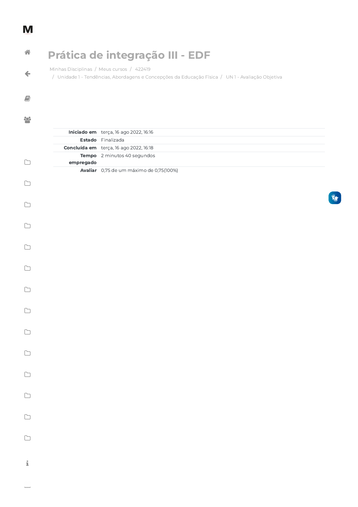 13/09/2022 14:59 UN 1 - Avaliação Objetiva: Revisão da tentativa https://avap.multivix.edu.br/mod/quiz/review.php?attempt=1716361&cmid=1258718 1/6 Minhas Disciplinas / Meus cursos / 422419 / Unidade 1 - Tendências, Abordagens e Concepções da Educação Física / UN 1 - Avaliação Objetiva Prática de integração III - EDF Iniciado em terça, 16 ago 2022, 16:16 Estado Finalizada Concluída em terça, 16 ago 2022, 16:18 Tempo empregado 2 minutos 40 segundos Avaliar 0,75 de um máximo de 0,75(100%) https://avap.multivix.edu.br/my/ https://avap.multivix.edu.br/course/view.php?id=19299 https://avap.multivix.edu.br/course/view.php?id=19299§ion=2 https://avap.multivix.edu.br/mod/quiz/view.php?id=1258718 https://avap.multivix.edu.br/my/ https://avap.multivix.edu.br/course/view.php?id=19299 https://avap.multivix.edu.br/user/index.php?id=19299 https://avap.multivix.edu.br/course/view.php?id=19299§ion=1 https://avap.multivix.edu.br/course/view.php?id=19299§ion=2 https://avap.multivix.edu.br/course/view.php?id=19299§ion=3 https://avap.multivix.edu.br/course/view.php?id=19299§ion=4 https://avap.multivix.edu.br/course/view.php?id=19299§ion=5 https://avap.multivix.edu.br/course/view.php?id=19299§ion=6 https://avap.multivix.edu.br/course/view.php?id=19299§ion=7 https://avap.multivix.edu.br/course/view.php?id=19299§ion=8 https://avap.multivix.edu.br/course/view.php?id=19299§ion=9 https://avap.multivix.edu.br/course/view.php?id=19299§ion=10 https://avap.multivix.edu.br/course/view.php?id=19299§ion=11 https://avap.multivix.edu.br/course/view.php?id=19299§ion=12 https://avap.multivix.edu.br/course/view.php?id=19299§ion=13 https://avap.multivix.edu.br/course/view.php?id=19299§ion=14 https://avap.multivix.edu.br/mod/page/view.php?id=1252%2F%22%20target%3D%22_blank https://avap.multivix.edu.br/calendar/view.php/ https://avap.multivix.edu.br/ 13/09/2022 14:59 UN 1 - Avaliação Objetiva: Revisão da tentativa https://avap.multivix.edu.br/mod/quiz/review.php?attempt=1716361&cmid=1258718 2/6 Questão 1 Correto Atingiu 0,15 de 0,15 Leia o trecho a seguir. “Um dos maiores problemas de saúde pública na atualidade, de acordo com a Organização Mundial da Saúde (OMS), é o crescimento das Doenças e Agravos Não Transmissíveis (DANTS). Estimativas da OMS apontam que, em 2009, foram as principais causas de morte no Brasil (61%) e estão associadas à alimentação inadequada, tabagismo, excesso de bebidas alcoólicas, inatividade física, uso de drogas ilícitas, entre outros hábitos não tão saudáveis que contribuem signi�cativamente para o surgimento das DANTS. A tendência genética é considerada fator de risco, mas não fator determinante e nem condicionante para o risco das DANTS, na maioria das vezes, os riscos estão relacionados às formas de viver”. Fonte: PEREIRA, D. S. et al. A atividade física na prevenção das doenças crônicas não transmissíveis. Revista Gestão & Saúde, v. 17, n. (supl 1), p. 2, 2017. Disponível em: http://www.herrero.com.br/�les/revista/�leaf5bd92eab28b9ad78efcd42cfde9745.pdf. Acesso em: 22 abr. 2021. De acordo com o texto, o comportamento inadequado e a aquisição e manutenção de hábitos não saudáveis são os principais motivos do desenvolvimento de doenças nos brasileiros. Frente a isso, podemos entender que a Educação Física escolar tem ferramentas que podem contribuir diretamente a favor da saúde dos alunos, estabelecendo uma relação entendida como: Escolha uma opção: Educação Física e Saúde Coletiva. Educação Física e Prevenção de Doenças. Educação Física e Atividade Física. Educação Física e Saúde Física. Educação Física e Exercícios. http://www.herrero.com.br/files/revista/fileaf5bd92eab28b9ad78efcd42cfde9745.pdf https://avap.multivix.edu.br/my/ https://avap.multivix.edu.br/course/view.php?id=19299 https://avap.multivix.edu.br/user/index.php?id=19299 https://avap.multivix.edu.br/course/view.php?id=19299§ion=1 https://avap.multivix.edu.br/course/view.php?id=19299§ion=2 https://avap.multivix.edu.br/course/view.php?id=19299§ion=3 https://avap.multivix.edu.br/course/view.php?id=19299§ion=4 https://avap.multivix.edu.br/course/view.php?id=19299§ion=5 https://avap.multivix.edu.br/course/view.php?id=19299§ion=6 https://avap.multivix.edu.br/course/view.php?id=19299§ion=7 https://avap.multivix.edu.br/course/view.php?id=19299§ion=8 https://avap.multivix.edu.br/course/view.php?id=19299§ion=9 https://avap.multivix.edu.br/course/view.php?id=19299§ion=10 https://avap.multivix.edu.br/course/view.php?id=19299§ion=11 https://avap.multivix.edu.br/course/view.php?id=19299§ion=12 https://avap.multivix.edu.br/course/view.php?id=19299§ion=13 https://avap.multivix.edu.br/course/view.php?id=19299§ion=14 https://avap.multivix.edu.br/mod/page/view.php?id=1252%2F%22%20target%3D%22_blank https://avap.multivix.edu.br/calendar/view.php/ https://avap.multivix.edu.br/ 13/09/2022 14:59 UN 1 - Avaliação Objetiva: Revisão da tentativa https://avap.multivix.edu.br/mod/quiz/review.php?attempt=1716361&cmid=1258718 3/6 Questão 2 Correto Atingiu 0,15 de 0,15 Leia o trecho a seguir. “O termo qualidade de vida tem sido usado frequentemente pela sociedade moderna nas mais diversas circunstâncias. É possível encontrá-lo associado à alimentação, ao transporte, à segurança, ao urbanismo, entre vários outros aspectos de extrema relevância para a vida cotidiana dos indivíduos e da sociedade”. Fonte: SANTOS, A. L. P.; SIMÕES, A. C. Educação física e qualidade de vida: re�exões e perspectivas. Saúde Soc, v. 21, n. 1, p. 182, 2012. Disponível em: https://www.scielo.br/pdf/sausoc/v21n1/18.pdf. Acesso em: 22 abr. 2021. De acordo com o texto, podemos compreender que a qualidade de vida possui um leque de contextos que devem ser considerados pelo professor de Educação Física ao abordar esse assunto em suas aulas. Dentre as múltiplas facetas relacionadas à qualidade de vida, está o exercício físico. 