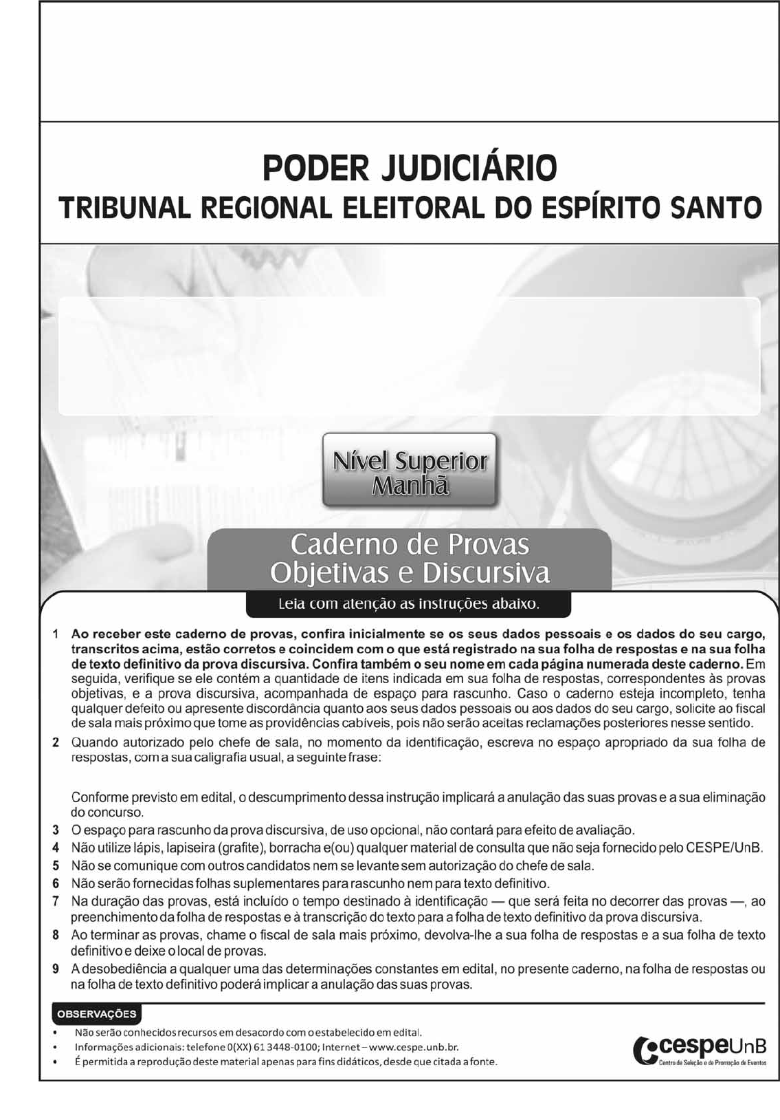 pcimarkpci MjgwNDowMTRkOjc4YTU6ODMxYjpmMTJkOmJkM2Y6ZjYzMzplMmYw:U3VuLCAwOSBKdW4gMjAyNCAxODo1OToyMCAtMDMwMA== www.pciconcursos.com.br pcimarkpci MjgwNDowMTRkOjc4YTU6ODMxYjpmMTJkOmJkM2Y6ZjYzMzplMmYw:U3VuLCAwOSBKdW4gMjAyNCAxODo1OToyMCAtMDMwMA== www.pciconcursos.com.br UnB/CESPE – TRE/ES – 1 – • De acordo com o comando a que cada um dos itens a seguir se refira, marque, na folha de respostas, para cada item: o campo designado com o código C, caso julgue o item CERTO; ou o campo designado com o código E, caso julgue o item ERRADO. A ausência de marcação ou a marcação de ambos os campos não serão apenadas, ou seja, não receberão pontuação negativa. Para as devidas marcações, use a folha de respostas, único documento válido para a correção das suas provas objetivas. • Nos itens que avaliam conhecimentos de informática, a menos que seja explicitamente informado o contrário, considere que todos os programas mencionados estão em configuração padrão, em português, que o mouse está configurado para pessoas destras, que expressões como clicar, clique simples e clique duplo referem-se a cliques com o botão esquerdo do mouse e que teclar corresponde à operação de pressionar uma tecla e, rapidamente, liberá-la, acionando-a apenas uma vez. Considere também que não há restrições de proteção, de funcionamento e de uso em relação aos programas, arquivos, diretórios, recursos e equipamentos mencionados. CONHECIMENTOS BÁSICOS Texto para os itens de 1 a 11 As eleições no Brasil mobilizam os veículos de1 informação também pelo anedotário que produzem. Curiosamente, a presença crescente de indígenas no processo eleitoral nos é transmitida exatamente nesse registro. De certo4 modo, a participação dos indígenas na disputa por vagas nos Poderes Legislativo e Executivo é apresentada no mesmo tom de estranheza com que o jornalismo brasileiro descreve7 xinguanos paramentados com sandálias havaianas e calções adidas. É como se a candidatura indígena selasse, solenemente, a inexorável aculturação. 10 Para além desse anedotário há, de fato, muito que refletirmos. Afinal, os mais diversos povos indígenas estão lidando com as grandes instituições da sociedade branca e com13 processos políticos pertencentes a uma gramática social e simbólica que lhes é absolutamente estranha, ao menos na maneira como estamos acostumados a pensar. A começar pela16 representação política, que envolve, no mínimo, premissas e categorias mentais muito distintas dos modos nativos de fazer política.19 A política, que em muitas formulações nativas atravessa a vida social de maneira ampla, articulando-se simultaneamente às regras do parentesco, ao complexo ritual e22 religioso, ao discurso cosmológico, passa então a circular em uma ordem específica, a ordem política, regida por uma racionalidade burocrática e fundamentada em valores que se25 pretendem universalmente válidos. Formas tradicionais de liderança política — como, por exemplo, a assumida pelo sábio ancião, com sua oratória sensível, seu zelo pela reatualização28 permanente do legado mitológico e da tradição, seu prestígio guerreiro — cedem lugar para uma nova forma de liderança, dessa vez protagonizada por jovens talentosos, escolarizados,31 falantes do português, minimamente conhecedores dos códigos e peculiaridades do mundo dos brancos. Marcos Pereira Rufino. Instituições dos brancos. Internet: <www.pib.socioambiental.org>, set./2000 (com adaptações). A partir das ideias do texto, julgue os itens seguintes. 1 No texto, defende-se que, embora não seja um fato notório, brancos e índios são culturalmente afins. 2 Conclui-se da leitura do texto que jovens brancos que frequentam ou frequentaram a escola tendem a tomar o lugar dos velhos sábios nas tribos indígenas. 3 Um dos motivos pelos quais as eleições chamam tanto a atenção na mídia é o fato de se contarem muitas anedotas nos programas eleitorais. 4 A participação de indígenas no processo eleitoral brasileiro enseja um repertório de piadas, de acordo com o texto. 5 Afirma-se no texto que a presença de um candidato indígena nas eleições governamentais ratifica a desnaturação dos povos indígenas. Com relação a aspectos linguísticos do texto, julgue os itens a seguir. 6 De acordo com a prescrição gramatical, na linha 17, o emprego da vírgula que antecede a expressão “no mínimo” torna obrigatório, no texto, o emprego da vírgula que a sucede. 7 O trecho “a presença crescente de indígenas no processo eleitoral nos é transmitida” (R.3-4) é equivalente, semanticamente, a transmitem a nós a presença crescente dos índios no processo eleitoral, enunciado que respeita as normas gramaticais e mantém a coerência do texto. 8 A forma verbal “é” (R.6) está flexionada no singular porque concorda com o nome “disputa” (R.5). 9 A locução verbal “estão lidando” (R.12-13) poderia ser substituída pela forma verbal lidam, sem prejuízo da correção gramatical ou do sentido do texto. 10 O vocábulo “gramática” (R.14), no texto, é empregado com o sentido de sistema. 11 A expressão “ao menos” (R.15) poderia ser substituída, sem prejuízo semântico ou sintático para o texto, pela expressão até mesmo. Texto para os itens de 12 a 21 Dados do Tribunal Superior Eleitoral (TSE) ajudam1 a traçar o perfil do eleitor brasileiro da última eleição. A inclusão política dos brasileiros vem, a cada eleição, consolidando-se e os dados são irrefutáveis quanto a isso.4 A cada cinco pessoas aptas a votar nas eleições de 2010, uma era analfabeta ou nunca havia frequentado uma escola. São, ao todo, 27 milhões de eleitores nessa situação no cadastro do7 TSE. Desses, oito milhões se declararam analfabetos e 19 milhões declararam saber ler e escrever, sem, entretanto, nunca terem estado em uma sala de aula. No total, havia10 135,8 milhões de eleitores no país em