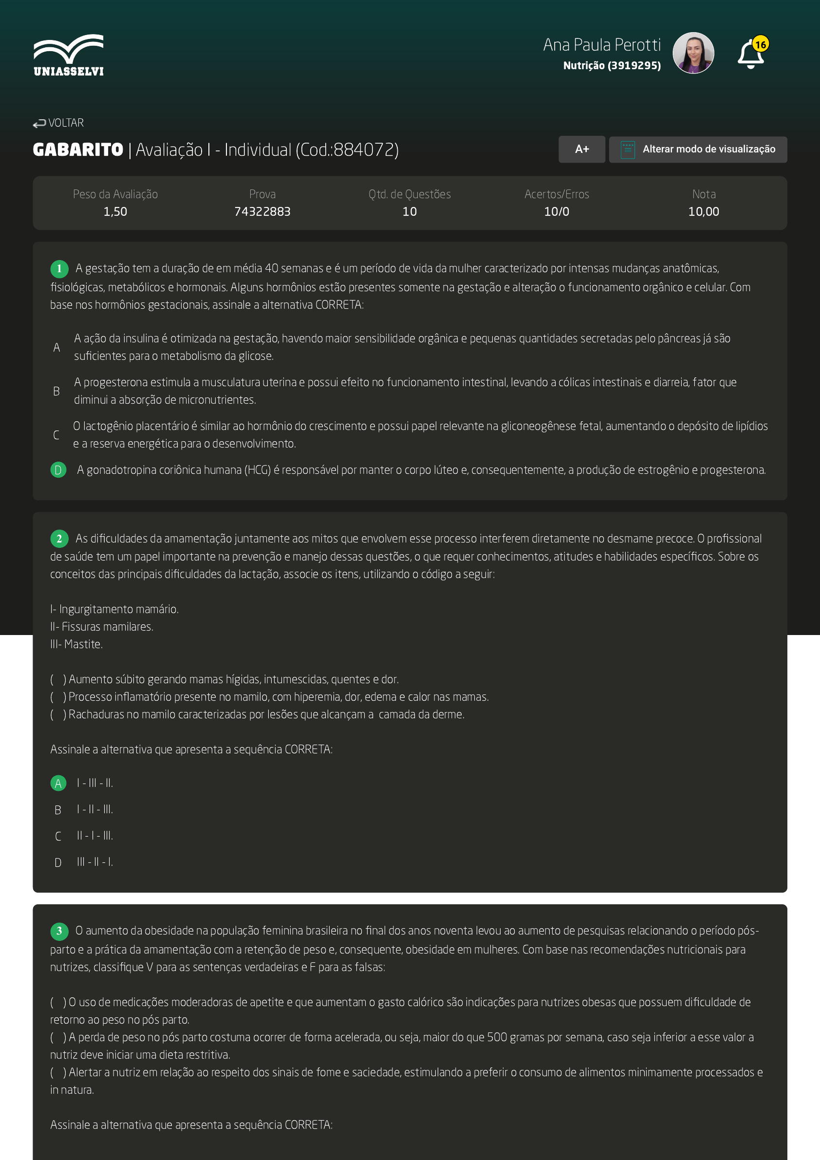 GABARITO | Avaliação I - Individual (Cod.:884072) Peso da Avaliação 1,50 Prova 74322883 Qtd. de Questões 10 Acertos/Erros 10/0 Nota 10,00 A gestação tem a duração de em média 40 semanas e é um período de vida da mulher caracterizado por intensas mudanças anatômicas, fisiológicas, metabólicos e hormonais. Alguns hormônios estão presentes somente na gestação e alteração o funcionamento orgânico e celular. Com base nos hormônios gestacionais, assinale a alternativa CORRETA: A A ação da insulina é otimizada na gestação, havendo maior sensibilidade orgânica e pequenas quantidades secretadas pelo pâncreas já são suficientes para o metabolismo da glicose. B A progesterona estimula a musculatura uterina e possui efeito no funcionamento intestinal, levando a cólicas intestinais e diarreia, fator que diminui a absorção de micronutrientes. C O lactogênio placentário é similar ao hormônio do crescimento e possui papel relevante na gliconeogênese fetal, aumentando o depósito de lipídios e a reserva energética para o desenvolvimento. D A gonadotropina coriônica humana (HCG) é responsável por manter o corpo lúteo e, consequentemente, a produção de estrogênio e progesterona. As dificuldades da amamentação juntamente aos mitos que envolvem esse processo interferem diretamente no desmame precoce. O profissional de saúde tem um papel importante na prevenção e manejo dessas questões, o que requer conhecimentos, atitudes e habilidades específicos. Sobre os conceitos das principais dificuldades da lactação, associe os itens, utilizando o código a seguir: I- Ingurgitamento mamário. II- Fissuras mamilares. III- Mastite. ( ) Aumento súbito gerando mamas hígidas, intumescidas, quentes e dor. ( ) Processo inflamatório presente no mamilo, com hiperemia, dor, edema e calor nas mamas. ( ) Rachaduras no mamilo caracterizadas por lesões que alcançam a camada da derme. Assinale a alternativa que apresenta a sequência CORRETA: A I - III - II. B I - II - III. C II - I - III. D III - II - I. O aumento da obesidade na população feminina brasileira no final dos anos noventa levou ao aumento de pesquisas relacionando o período pós- parto e a prática da amamentação com a retenção de peso e, consequente, obesidade em mulheres. Com base nas recomendações nutricionais para nutrizes, classifique V para as sentenças verdadeiras e F para as falsas: ( ) O uso de medicações moderadoras de apetite e que aumentam o gasto calórico são indicações para nutrizes obesas que possuem dificuldade de retorno ao peso no pós parto. ( ) A perda de peso no pós parto costuma ocorrer de forma acelerada, ou seja, maior do que 500 gramas por semana, caso seja inferior a esse valor a nutriz deve iniciar uma dieta restritiva. ( ) Alertar a nutriz em relação ao respeito dos sinais de fome e saciedade, estimulando a preferir o consumo de alimentos minimamente processados e in natura. Assinale a alternativa que apresenta a sequência CORRETA: VOLTAR A+ Alterar modo de visualização 1 2 3 Ana Paula Perotti Nutrição (3919295) 16 A V - F - V. B F - F - V. C F - V - F. D V - V - F. Apesar da recomendação mundial do consumo de ácido fólico por gestantes, a prevalência de consumo deste suplemento é ainda insatisfatória, inclusive no Brasil. Estudos sugerem que a ingestão depende dos cuidados pré-natais, sendo que mulheres com menor escolaridade, sem companheiro e com pré-natal deficiente são mais susceptíveis a não consumir o ácido fólico durante a gestação. Com base na necessidade de ácido fólico na gestação, assinale a alternativa CORRETA: A A dose recomendada para suplementação de ácido fólico deve ser de 400 microgramas de ácido fólico diariamente para gestantes. B A Política Nacional de Fortificação de Alimentos preconiza o início da suplementação com ácido fólica nas farinhas de trigo e milho a partir do ano de 2025. C O consumo adequado de ácido fólico tem a função de prevenir sangramento precoce e hemorragia de qualquer natureza no recém-nascido. D O Ministério da Saúde preconiza a suplementação com ácido fólico a partir do primeiro ultrassom que comprove a gestação. Durante a gestação, o sistema cardiovascular sofre alterações progressivas que resultam em adaptações hemodinâmicas com a finalidade de garantir o crescimento e desenvolvimento do bebê. Com base nas mudanças do sistema cardiovascular da gestante, assinale a alternativa CORRETA: A Para garantir a vascularização adequada do útero e a reserva sanguínea para compensar as perdas do parto, ocorre a hipervolemia que é caracterizada pelo aumento de aproximadamente 50% do volume de sangue na gestação. B O processo de hemodiluição é proveniente da maior retenção de líquidos para formação do líquido amniótico, o que influencia no controle e recomendação de necessidade hídrica gestacional. C O débito e frequência cardíaca permanecem inalterados no decorrer de toda a gestação e caso haja algumas intercorrências nos exames de rotina da gestante, deve-se realizar o encaminhamento ao cardiologista. D Devido à hipervolemia gestacional, o organismo materno sofre uma intensa produção de hemácias que compensa e equilibra os valores sanguíneos de hemoglobina, hematócrito e albumina, prevenindo a deficiência desses compostos. A gestação é um período de constantes modificações físicas, psíquicas e sociais na vida da mulher e dos que a cercam. As principais modificações da fisiologia materna ocorrem no sistema cardiovascular, respiratório e gastrintestinal. Essas alterações provocam desconfortos, traduzidas por sinais e sintomas que afetam o bem-estar da mulher. Com base nas mudanças orgânicas e metabólicas da gestação, classifique V para as sentenças verdadeiras e F para as falsas: ( ) Em relação ao paladar, a gestante costuma apresentar apetite para alimentos específicos, fica muito sensível a presença de sal e 