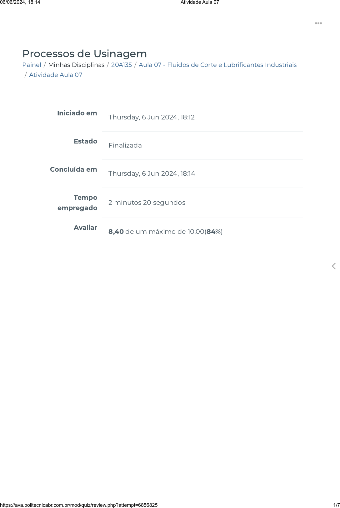 Painel / Minhas Disciplinas / 20A135 / Aula 07 - Fluidos de Corte e Lubri�cantes Industriais / Atividade Aula 07 Processos de Usinagem Iniciado em Thursday, 6 Jun 2024, 18:12 Estado Finalizada Concluída em Thursday, 6 Jun 2024, 18:14 Tempo empregado 2 minutos 20 segundos Avaliar 8,40 de um máximo de 10,00(84%) 06/06/2024, 18:14 Atividade Aula 07 https://ava.politecnicabr.com.br/mod/quiz/review.php?attempt=6856825 1/7 https://ava.politecnicabr.com.br/my/ https://ava.politecnicabr.com.br/my/ https://ava.politecnicabr.com.br/course/view.php?id=972 https://ava.politecnicabr.com.br/course/view.php?id=972#section-8 https://ava.politecnicabr.com.br/mod/quiz/view.php?id=31584 https://ava.politecnicabr.com.br/ Questão 1 Correto Atingiu 2,00 de 2,00 A utilização e o manuseio de �uidos de corte utilizados em operações de usinagem exigem procedimentos que garantam a segurança dos pro�ssionais e evitem contaminação do meio ambiente e de e�uentes. Marque a alternativa correta. Escolha uma opção: a. Em caso de corte ou arranhões acidentais, suspender o contato com o �uido, lavar o ferimento e procurar atendimento de pro�ssional de saúde capacitado. b. Lavar as áreas da pele que entram em contato com os salpicos de �uido, sujeira e partículas metálicas ao menos duas vezes durante o dia de trabalho. c. As máquinas devem ser equipadas com proteções que evitem respingos de �uido no operador e em pessoas próximas (NR 12). d. Realizar limpezas periódicas no reservatório do �uido da máquina-ferramenta. e. todas as alternativas corretas. 06/06/2024, 18:14 Atividade Aula 07 https://ava.politecnicabr.com.br/mod/quiz/review.php?attempt=6856825 2/7 https://ava.politecnicabr.com.br/ Questão 2 Parcialmente correto Atingiu 0,40 de 2,00 Os �uidos de corte podem ser classi�cados em função de sua fabricação e aplicação, conforme a seguir: são óleos minerais nos quais se incorporam aditivos de extrema pressão. Podem ser enxofre, cloro ou fósforo. suas características refrigerantes são inferiores, mas conferem boas propriedades protetivas contra oxidação. são misturas de óleos graxos (5% a 25%) e minerais. São muito utiliza- dos para usinagem do cobre e suas ligas. têm origem animal ou vegetal, possuem excelente oleosidade e médias características refrigerantes. Seu longo tempo em exposição ou armazenagem na máquina favorece o desenvolvimento de bactérias e fungos que podem causar infecções cutâneas. apresentam aspecto de emulsão opaca de cor branca em água, contendo aditivos anticorrosivos e de extrema pressão. São diluídos em água numa proporção de 1% a 30%. Os óleos solúveis aliam propriedades refrigerantes com lubri�cantes. Óleos Óleos Óleos Óleos Solúve 06/06/2024, 18:14 Atividade Aula 07 https://ava.politecnicabr.com.br/mod/quiz/review.php?attempt=6856825 3/7 https://ava.politecnicabr.com.br/ Questão 3 Correto Atingiu 2,00 de 2,00 Associe corretamente os principais aditivos utilizados em lubri�cantes, levando em consideração os tipos e origem química. Sulfonatos de cálcio, sódio ou bário, aminas orgânicas etc. Polímeros como o poliestireno e copolímeros derivados do etileno e propileno. Sulfonatos, fenatos ou salicilatos de cálcio, bário ou magnésio. Compostos de silicones ou metacrilatos. Éster poli-isobutenilsuccínico ou succinimidas. Metacrilatos Anticorrosivo Melhorador da viscosid Detergente básico Antiespumante Dispersante de cinzas Melhorador do ponto d 06/06/2024, 18:14 Atividade Aula 07 https://ava.politecnicabr.com.br/mod/quiz/review.php?attempt=6856825 4/7 https://ava.politecnicabr.com.br/ Questão 4 Correto Atingiu 2,00 de 2,00 Marque Verdadeiro ou Falso: ( ) Sistemas de lubri�cação Em função da variedade de máquinas e equipamentos que necessitam de sistemas de lubri�cação especí�cos, da necessidade de evitar a utilização em excesso de lubri�cantes, causando desperdícios e contaminação ao meio ambiente, foram desenvolvidos sistemas de lubri�cação planejados e controlados. Basicamente, a lubri�cação ocorrerá de duas maneiras: » Intermitente ou restrita: esse tipo de lubri�cação geralmente ocorre em máquinas com dispositivos para acionamento de uma bomba de óleo em tempo controlado. De acordo com a programação, o lubri�cante é injetado a uma pressão controlada em canais usinados nas guias da máquina sujeitas ao atrito, mantendo assim uma película necessária para se evitar o atrito cinético. Deve-se controlar o nível de lubri�cante no reservatório do sistema para garantir a funcionalidade correta do mesmo (Capítulo 1). Exemplo de aplicação: máquinas de usinagem CNC. » Lubri�cação contínua: é a aplicação constante do lubri�cante nas peças sujeitas ao desgaste e deve ser utilizada no interior do conjunto, em máquinas e equipamentos rotativos. O nível do óleo deve ser controlado. Por exemplo, no caso de caixas de engrenagens em máquinas de usinagem ou nos redutores de velocidade. Exemplo de aplicação: mancais de deslizamento, caixas de câmbio de automóveis etc. Escolha uma opção: Verdadeiro Falso 06/06/2024, 18:14 Atividade Aula 07 https://ava.politecnicabr.com.br/mod/quiz/review.php?attempt=6856825 5/7 https://ava.politecnicabr.com.br/ Questão 5 Correto Atingiu 2,00 de 2,00 Os �uidos de corte são substâncias desenvolvidas com a função de refrigerar a peça e a ferramenta de corte durante a usinagem. A e�ciência nos trabalhos de usinagem está diretamente ligada aos �uidos de corte, uma vez que in�uenciam no desempenho das operações de corte. Apresentam as seguintes funções primárias, exceto: Escolha uma opção: a. auxiliar na remoção de cavacos (ação de lavagem) b. refrigerar a ferramenta de corte e a peça. c. criar uma película entre a aresta de corte e a superfície da peça (função lubri�cante). d. reduzir o esforço de peça. e. evitar que as partes da máquina sem proteção se oxidem. Entre 